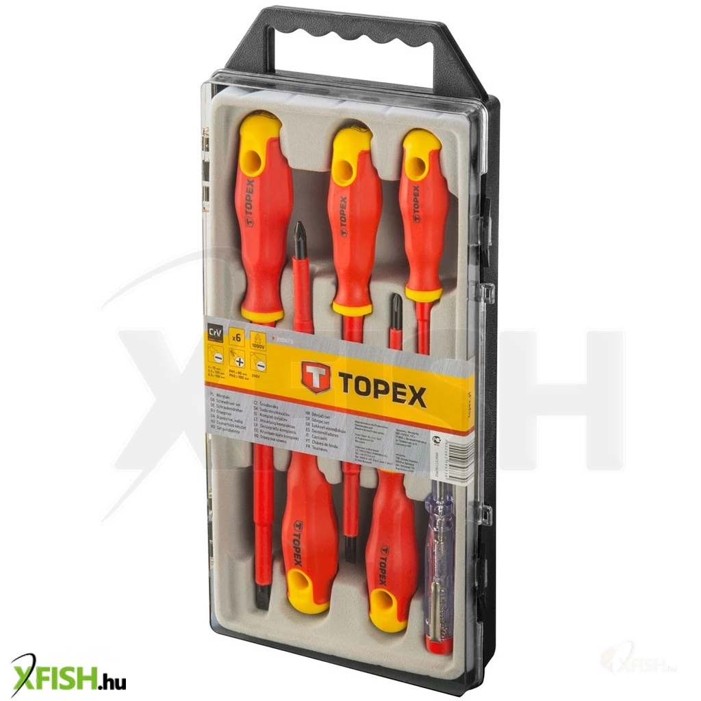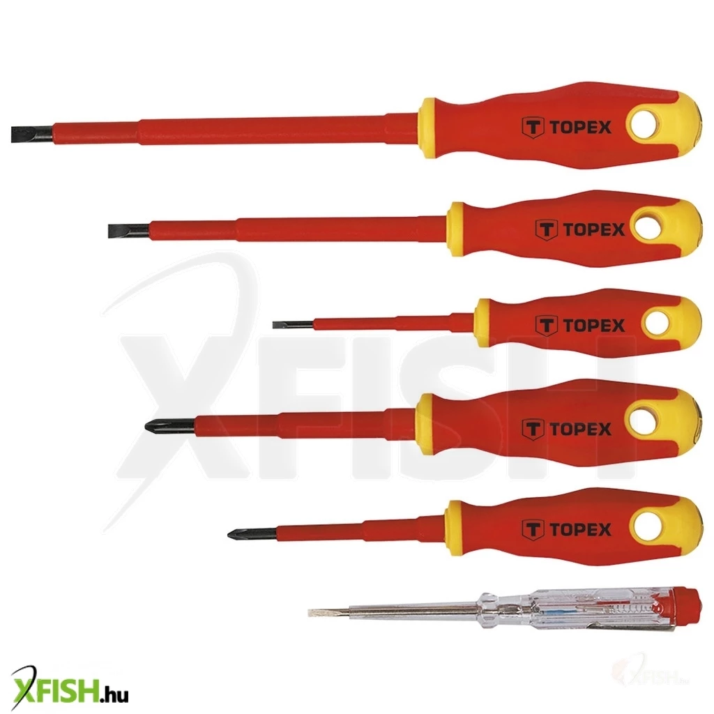 Csavarhúzó 1000 V, 6 dbOos készlet, tanúsított, CrV acél, bimateriál markolat, méretek: 3 x 75 mm, 5,5 x 125 mm, 6,5 x 150 mm, PH1 x 80 mm, PH2 x 100 mm, fázisceruza 125- 250 V