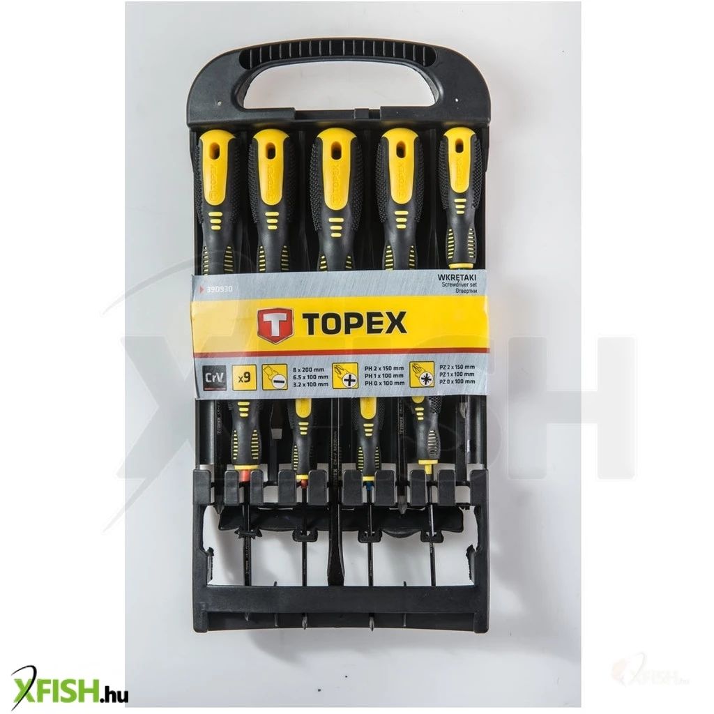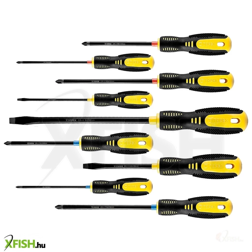 Csavarhúzó, 9 db-os, CrV acél, bimateriál markolat, 9 db csavarhúzó, méretek: 3,2 x 100 mm, 6,5 x 100 mm, 8 x 200mm, PH2 x 150 mm, PH1 x 100 mm, PH0 x 100 mm, PZ2 x 150mm, PZ1 x 100mm, PZ0 x 100mm, hordtáska