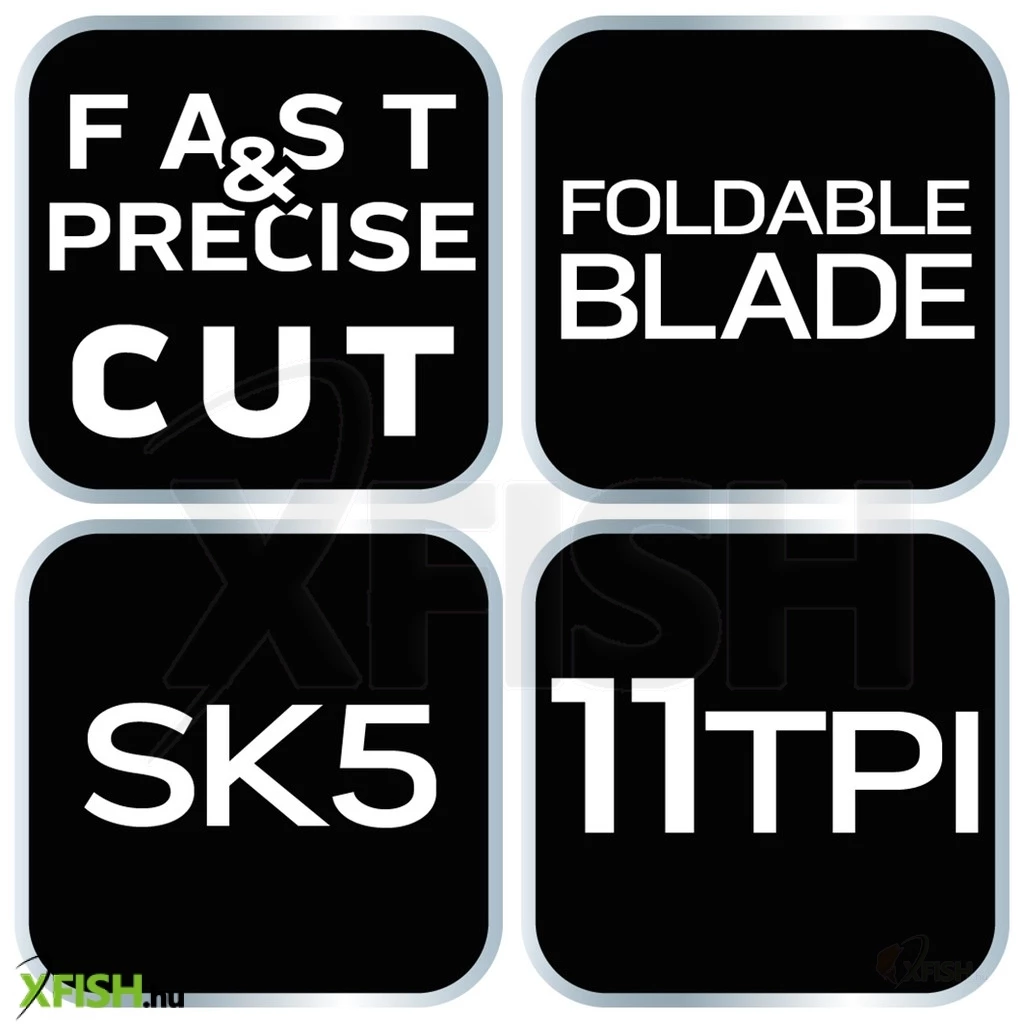 A fűrészlap anyaga SK5 acél, ami nagyfokú szilárdságot és rugalmasságot kínál, így biztosítva a könnyed használatot és a kiváló teljesítményt. A fűrész teljes hossza 250 mm, amely optimális méretet jelent a kényelmes használathoz. A markolat rendkívül praktikus, hiszen becsukható, ezáltal könnyedén szállítható és tárolható. A markolat anyaga tartós műanyag, amely biztos fogást garantál és biztosítja a kényelmes kezelhetőséget.