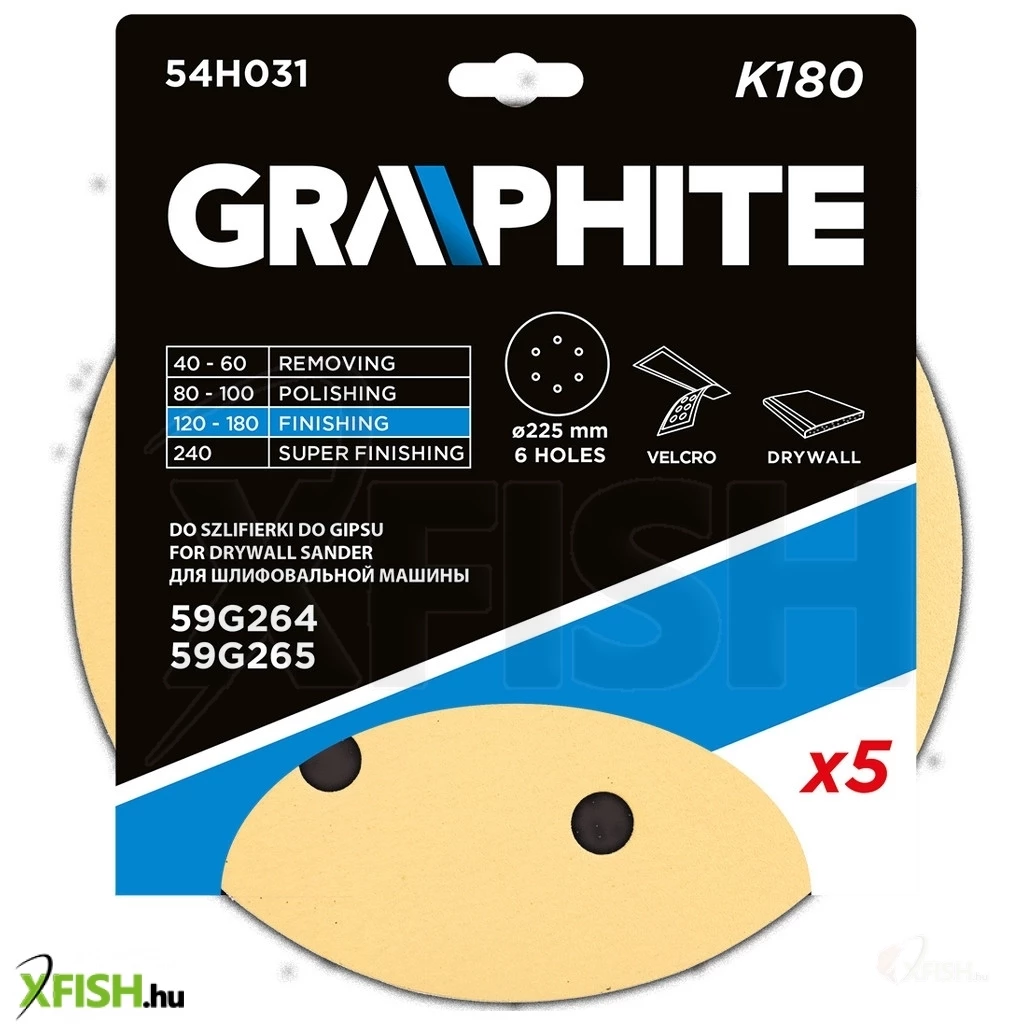 Neotools tépőzáras csiszolópapír 225mm, k180, 5db, 6 lyukakkal az 59g264, 59g265 csiszológéphez.