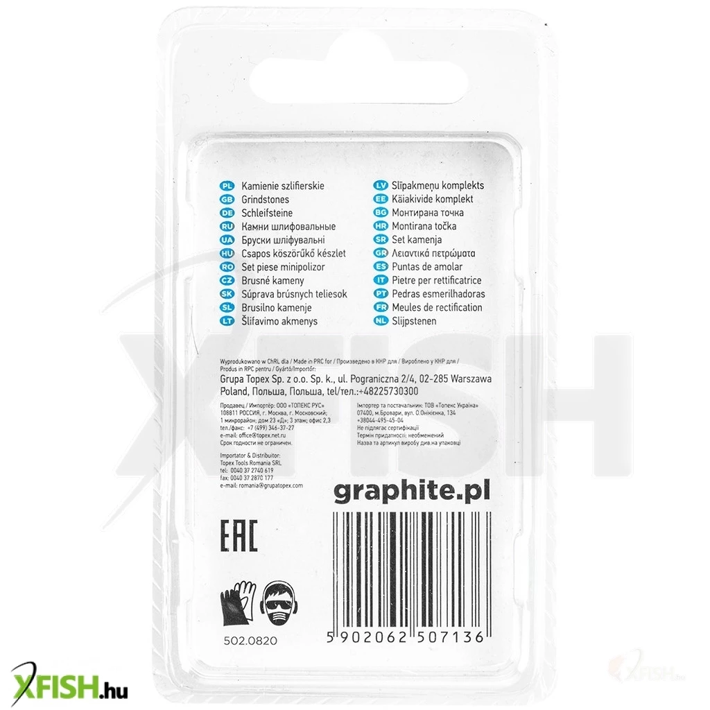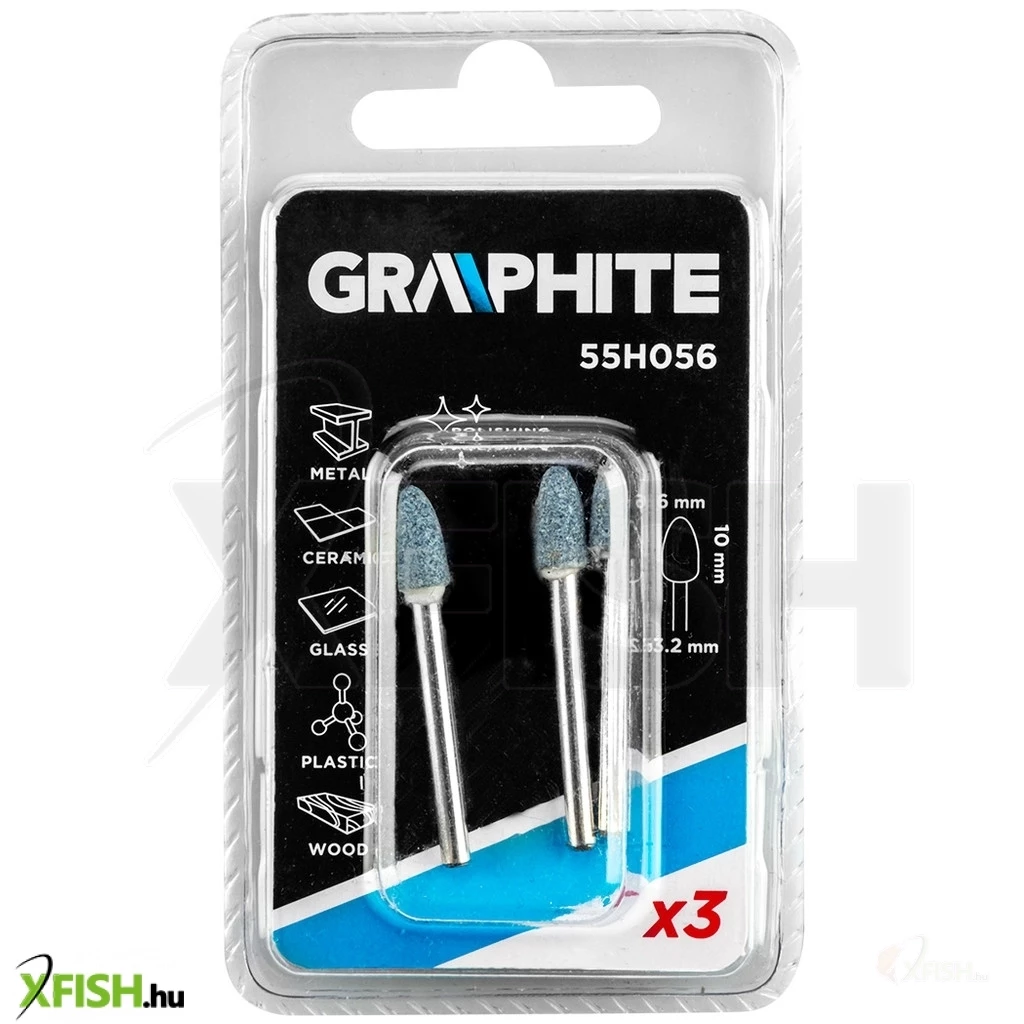 Csapos csiszolókő 6 x 10 mm, töltény, 55H056, GRAPHITE - 3 db-os készlet. Mini fúró-csiszológéphez tervezett csiszolókövek. Professzionális alumínium-oxid csiszolókő fémek, zárak, hegesztési varratok, szegecsek megmunkálásához. Ideális eszköz a rozsda eltávolítására. A legtöbb anyag élesítésére, simítására, sorjázására és általános csiszolására alkalmas. Kerámiák és üvegek megmunkálásához is használható az élek kiegyenlítésére. A kő hasznos lehet fa- és a műanyagok megmunkálásánál is.
