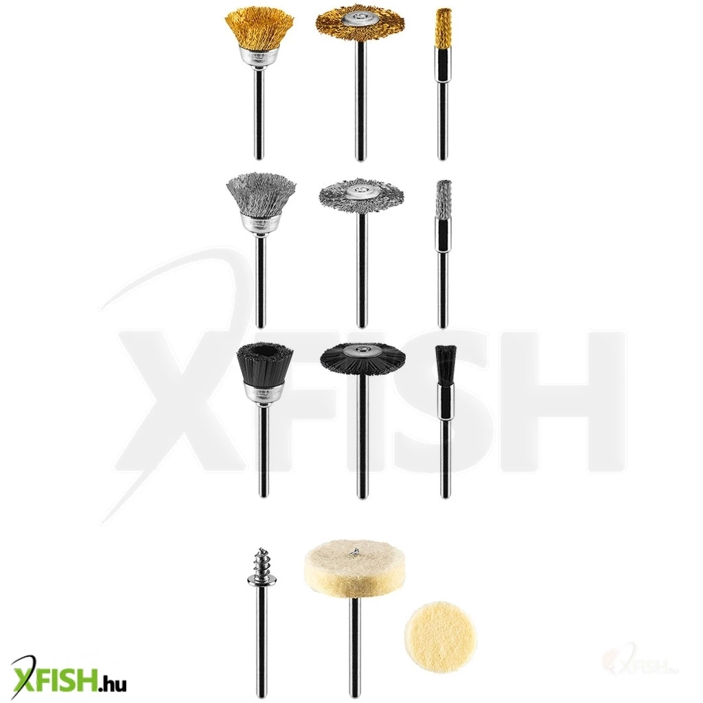 15 elemből álló készlet: drótkefék + filckorong + befogótengely