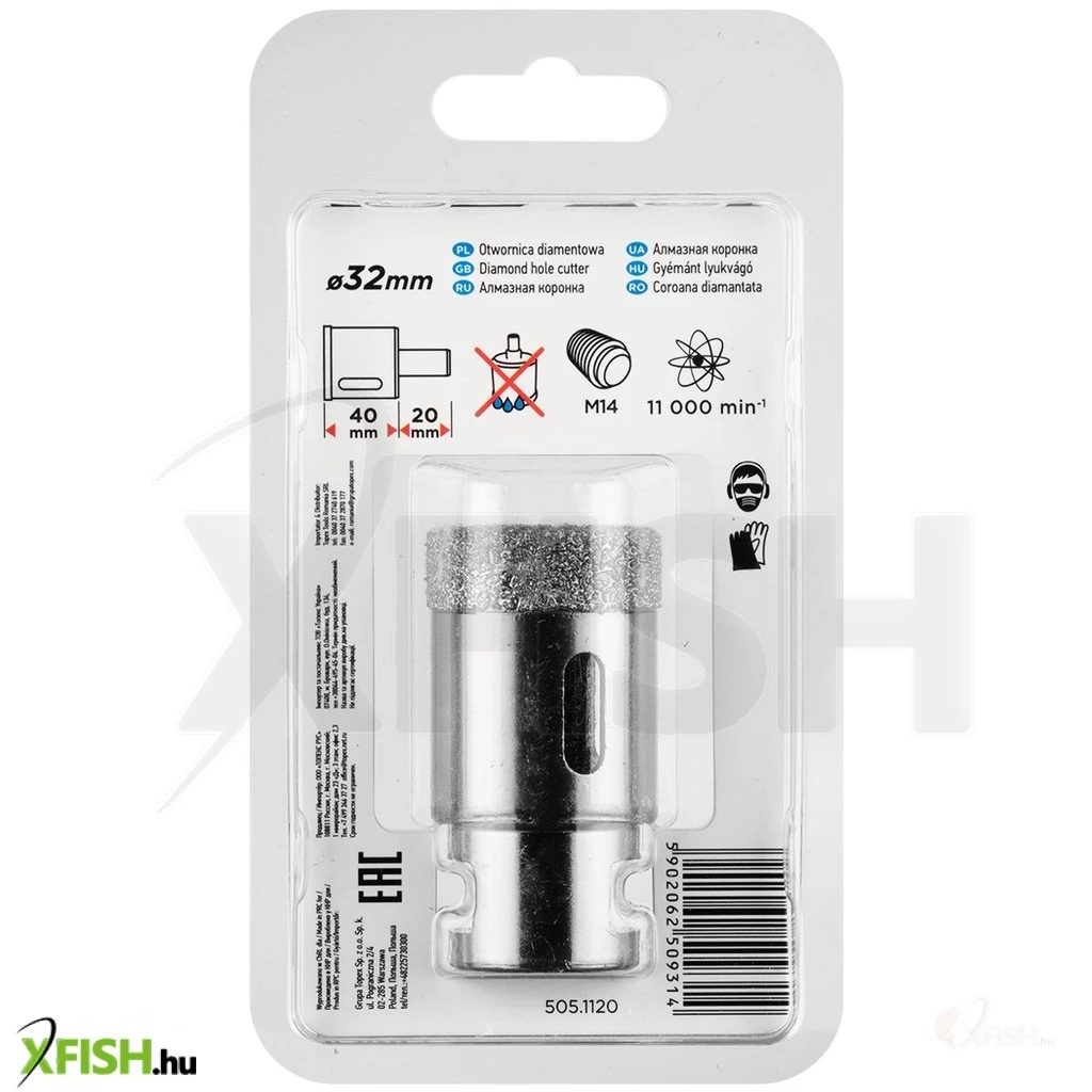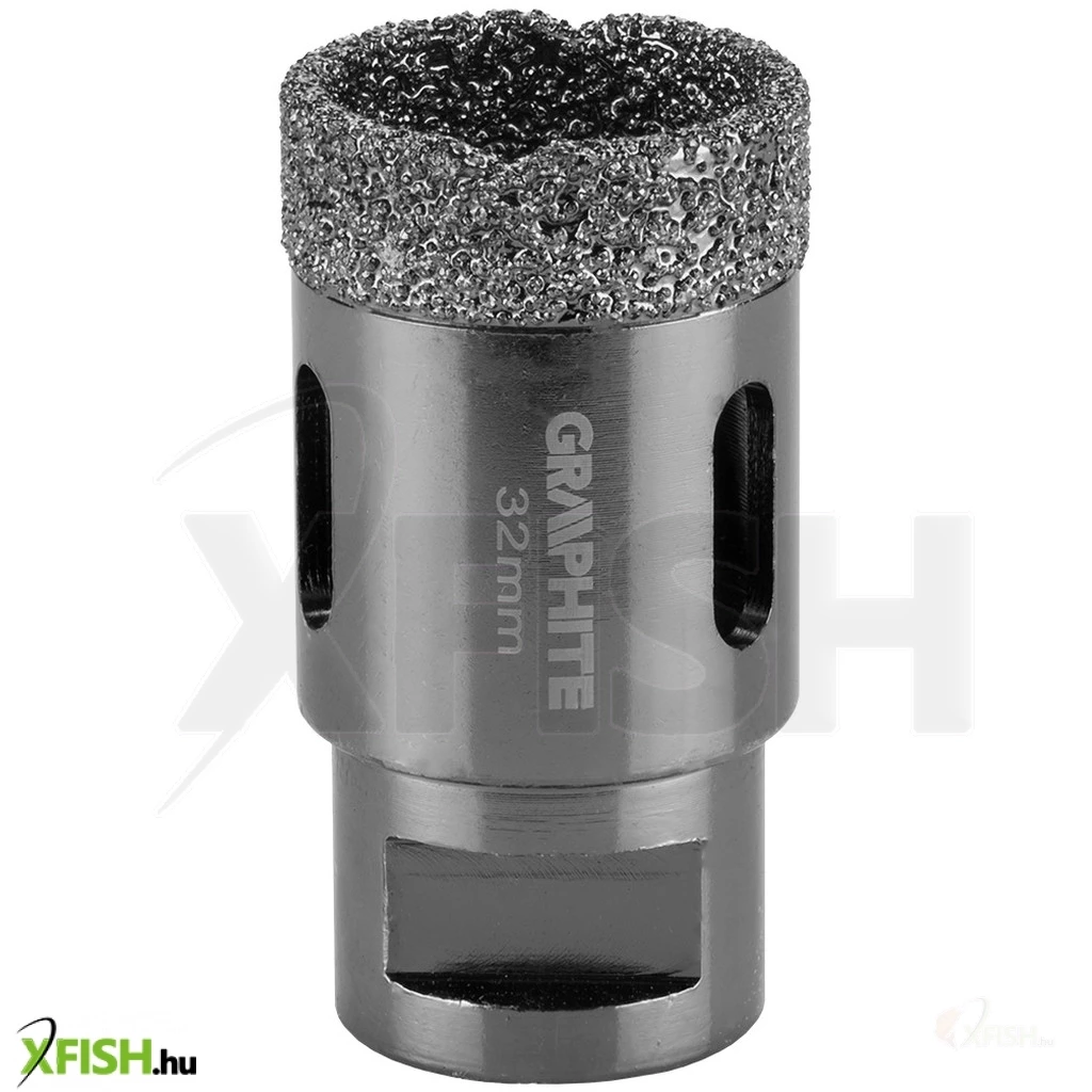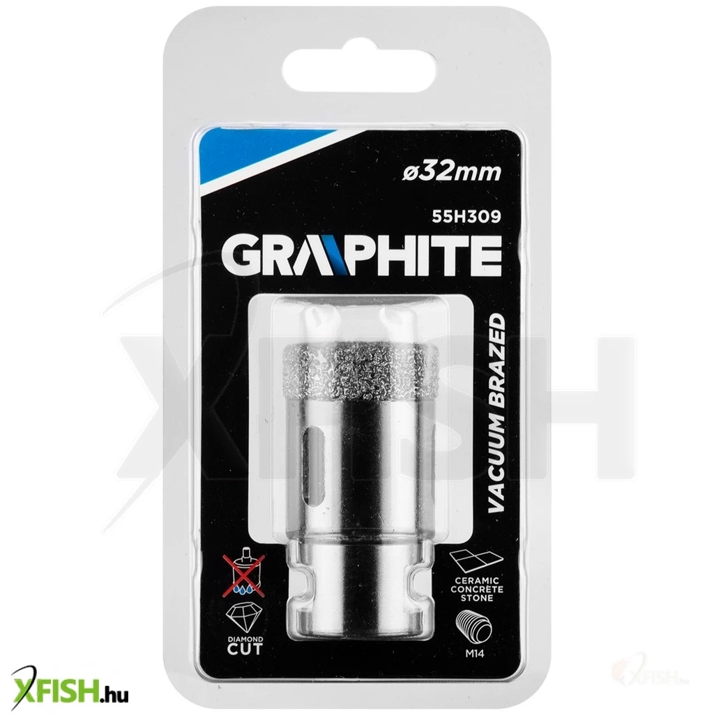 Körkivágó, gyémántos 32 mm, 55H309, GRAPHITE - a gyémánt csiszoló erejét használja fel tökéletesen egyforma lyukak fúrására kemény anyagokban, pici területen. Vákuumos keményforrasztási technológiával készül, ami nagy fúrási sebességet és hosszabb élettartamot biztosít. Az oldalán lévő nyílások garantálják az optimális hűtést és a keletkezett por működés közbeni elvezetését. Sarokcsiszolóra, M14-es menetre szerelhető és száraz vágásra tervezték.