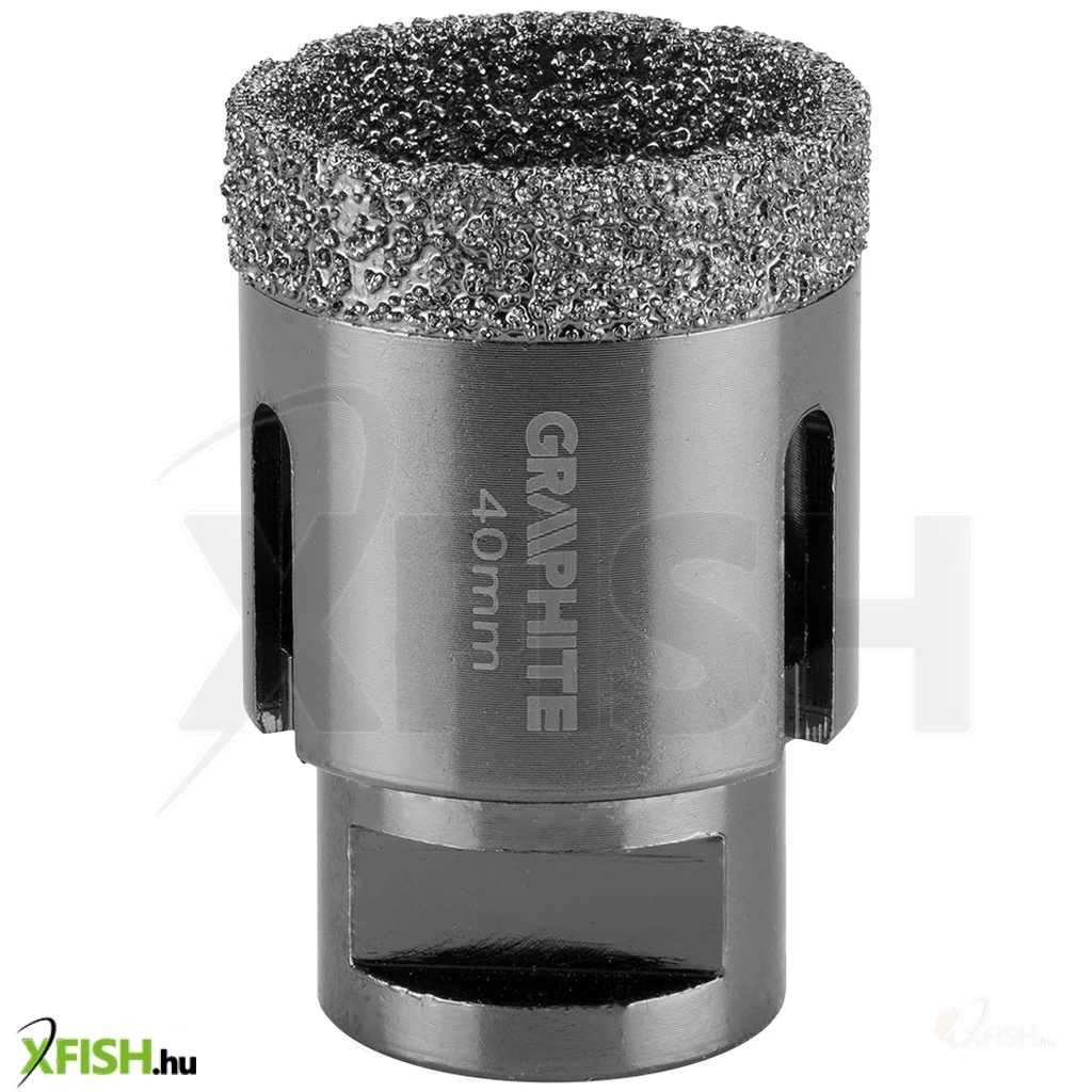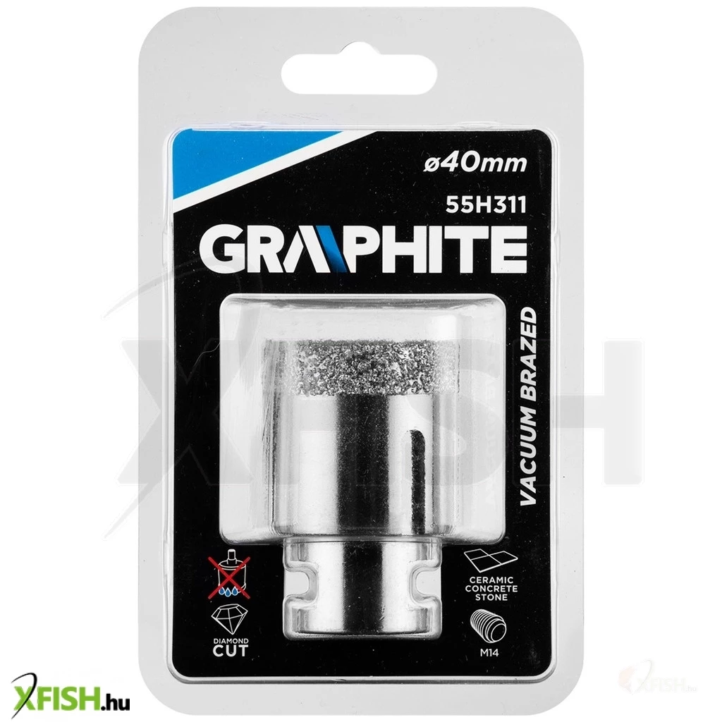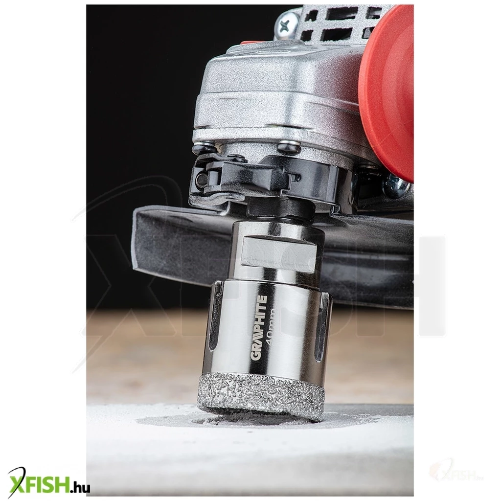 Körkivágó, gyémántos 40 mm, 55H311, GRAPHITE - a gyémánt csiszoló erejét használja fel tökéletesen egyforma lyukak fúrására kemény anyagokban, pici területen. Vákuumos keményforrasztási technológiával készül, ami nagy fúrási sebességet és hosszabb élettartamot biztosít. Az oldalán lévő nyílások garantálják az optimális hűtést és a keletkezett por működés közbeni elvezetését. Sarokcsiszolóra, M14-es menetre szerelhető és száraz vágásra tervezték.