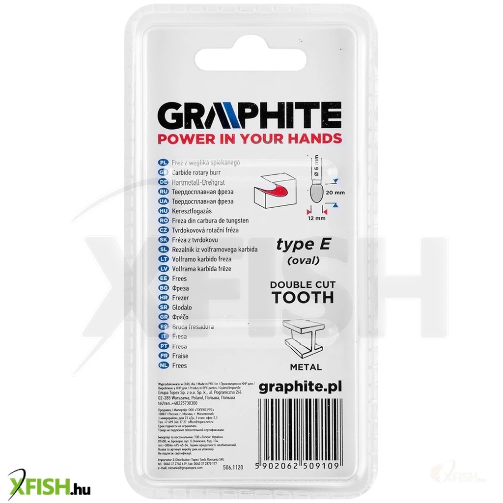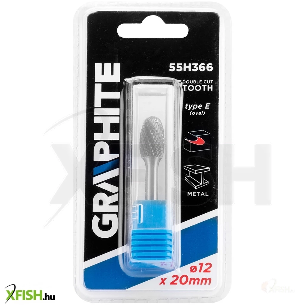 Keményfém marófej, E típusú (csepp, ovális), 12 x 20 mm, 55H366, GRAPHITE - kiváló minőségű, a megmunkálandó felület marására vagy vágására szolgáló szerszám. Fém, alumínium és műanyag megmunkálására tervezték. Egyenes csiszolókkal használható (ne használja fúróval).