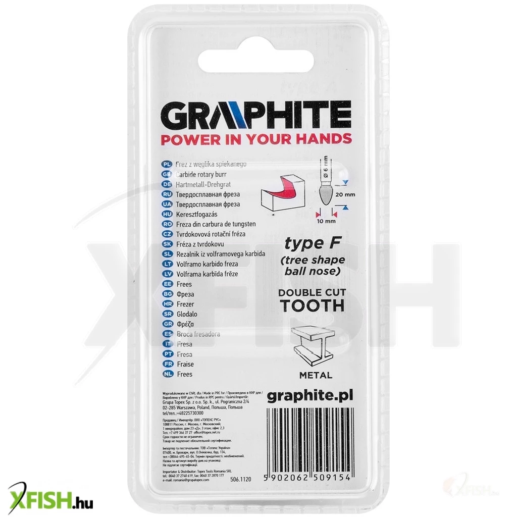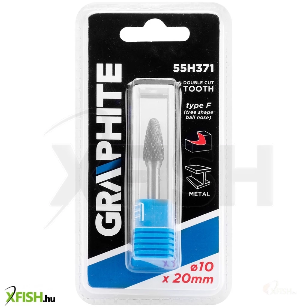 Keményfém marófej, F típusú (csúcsíves, lekerekített) 10 x 20 mm, 55H371, GRAPHITE - kiváló minőségű, a megmunkálandó felület marására vagy vágására szolgáló szerszám. Fém, alumínium és műanyag megmunkálására tervezték. Egyenes csiszolókkal használható (ne használja fúróval).