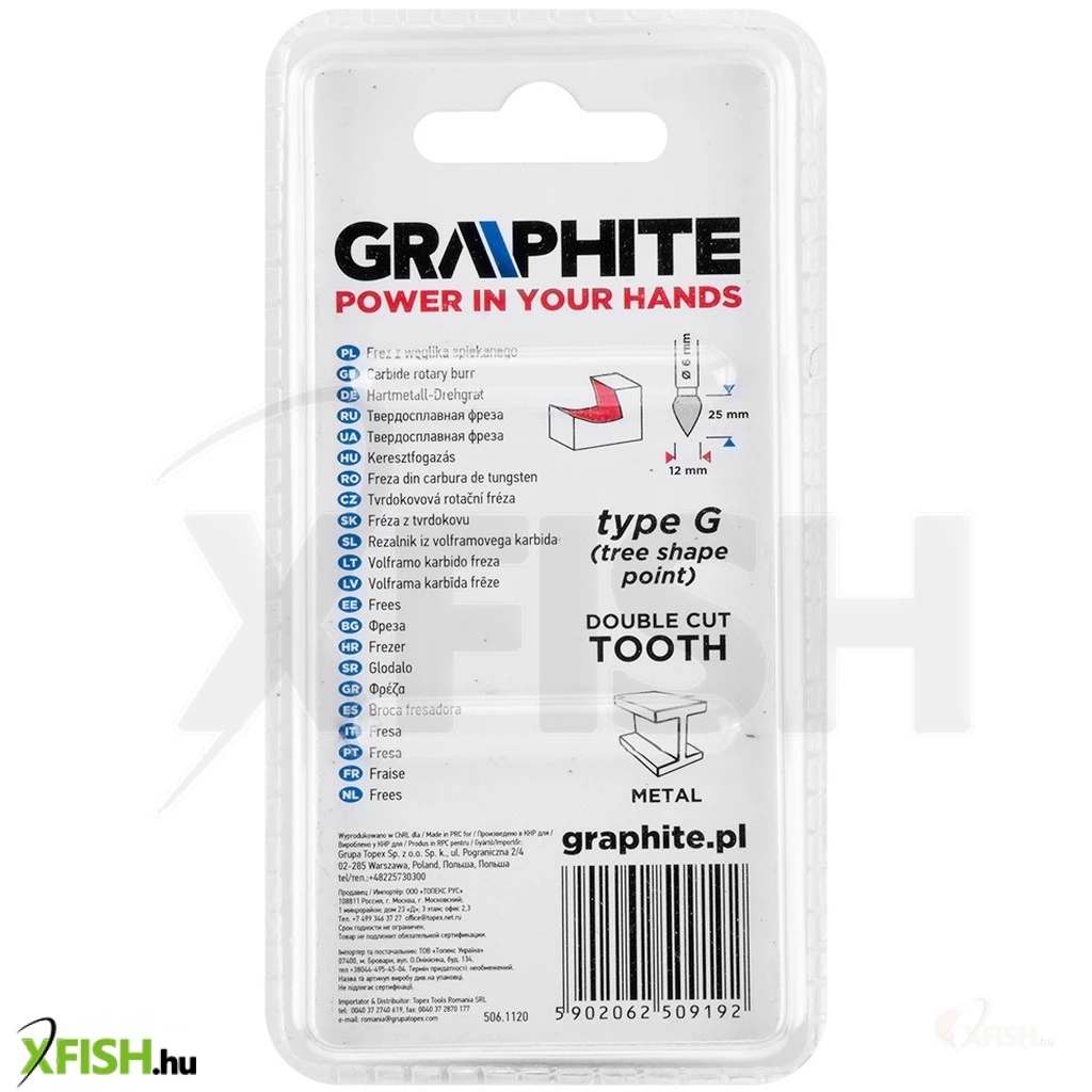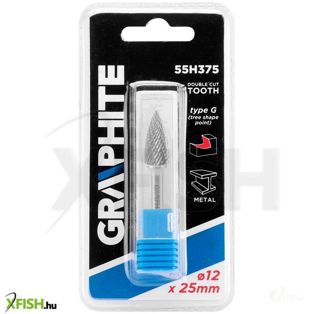 Keményfém marófej, G típusú (csúcsíves, hegyes), 12 x 25 mm, 55H375, GRAPHITE - kiváló minőségű, a megmunkálandó felület marására vagy vágására szolgáló szerszám. Fém, alumínium és műanyag megmunkálására tervezték. Egyenes csiszolókkal használható (ne használja fúróval).