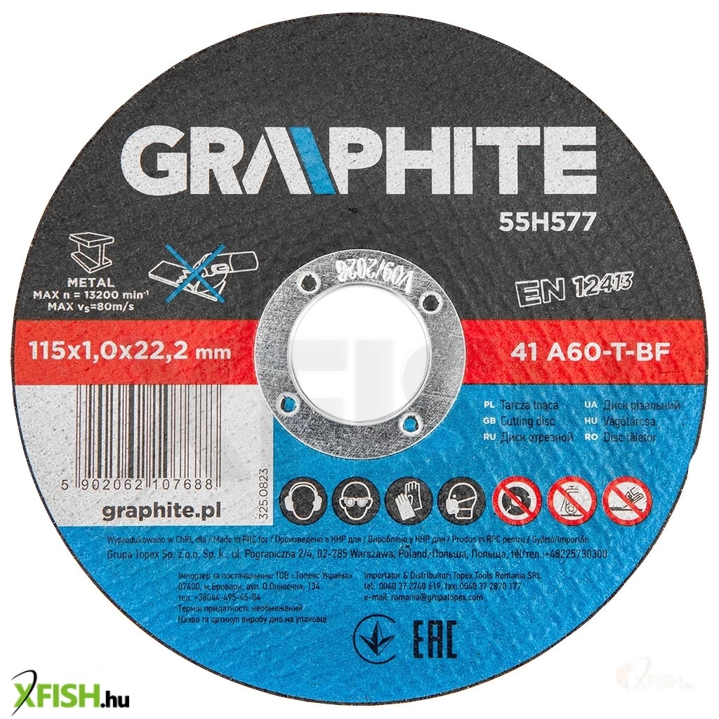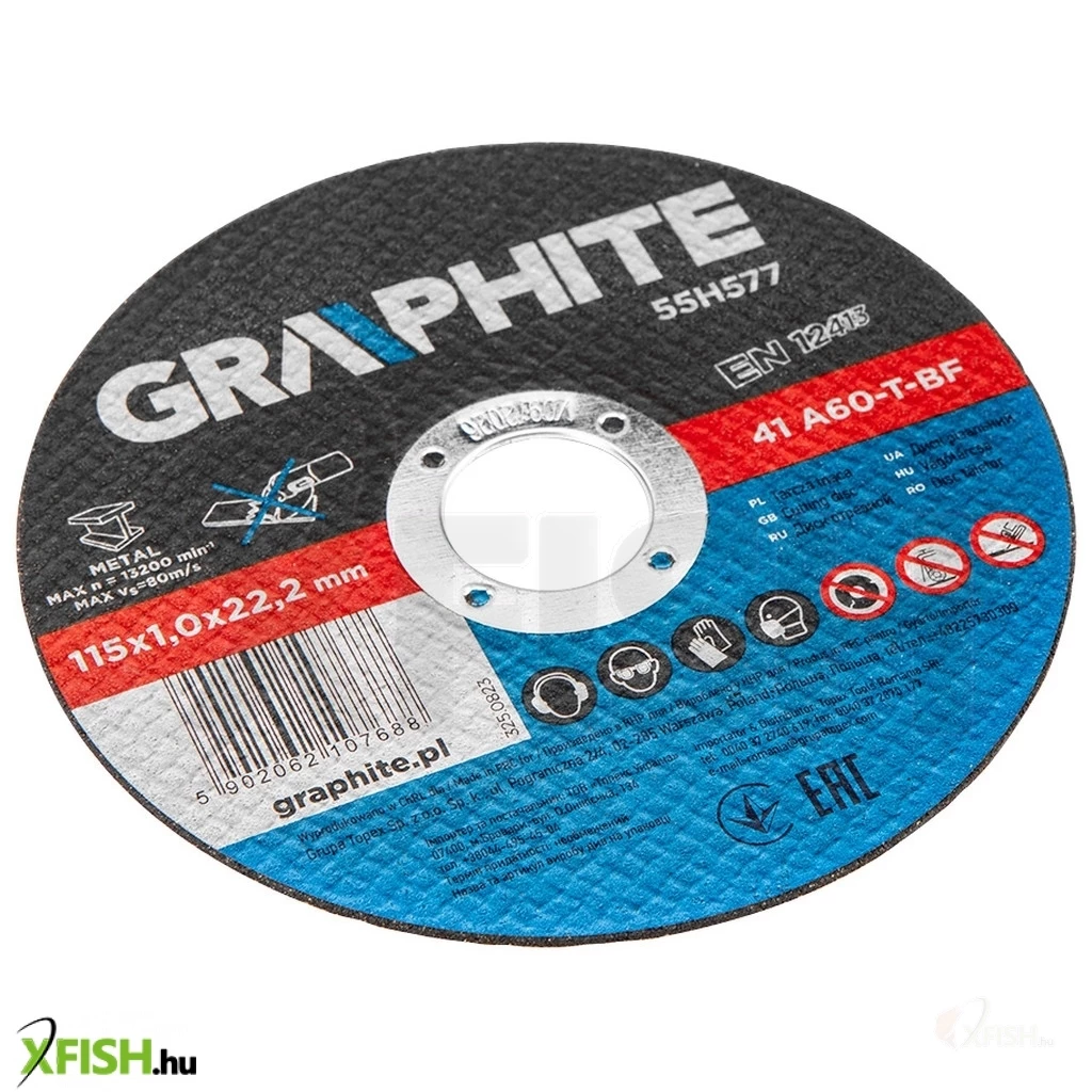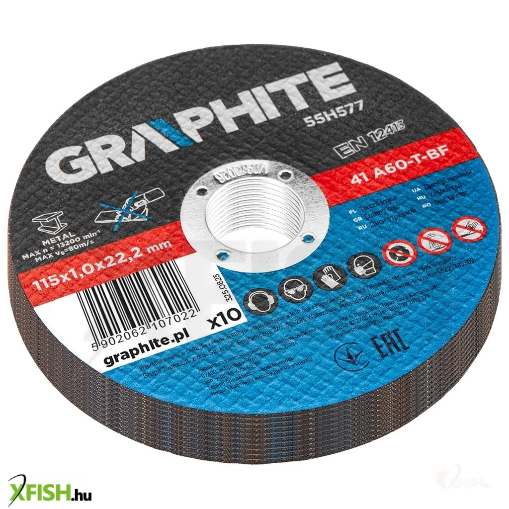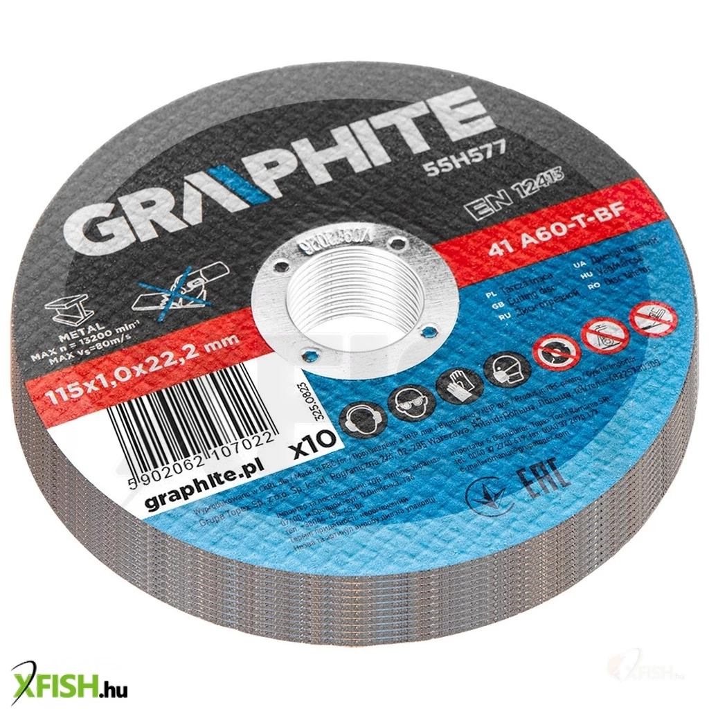 Fémvágó korong 115 x 1,0 x 22,2 mm, 41 A60-T-BF 10 db, fólia 55H577 A GRAPHITE 10 darabos készlet precíziós fémvágáshoz, tartós és hosszú élettartamú timföldből készült korong. A korong külső átmérője 115 mm, és a megfelelő fejlett kialakításnak és a vastagság csökkentésének köszönhetően - lehetővé teszi a vágási idő jelentős csökkentését.