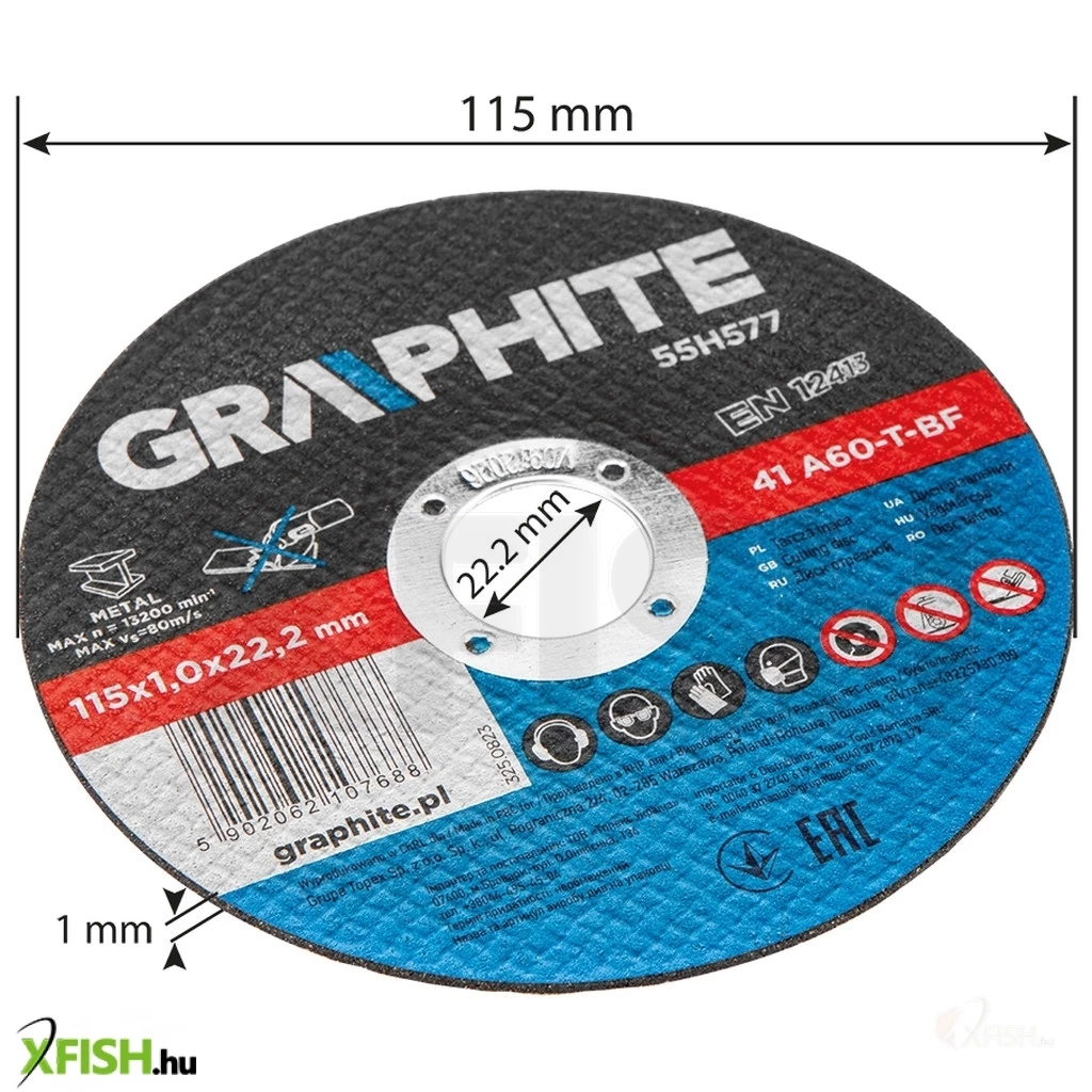 Átmérője 115 x 1 x 22,2 mm. A termék megfelel az EN12413 szabványnak, így magas szintű munkabiztonságot biztosít. Ez a korong a szakemberek és a barkácsolás szerelmesei számára készült.