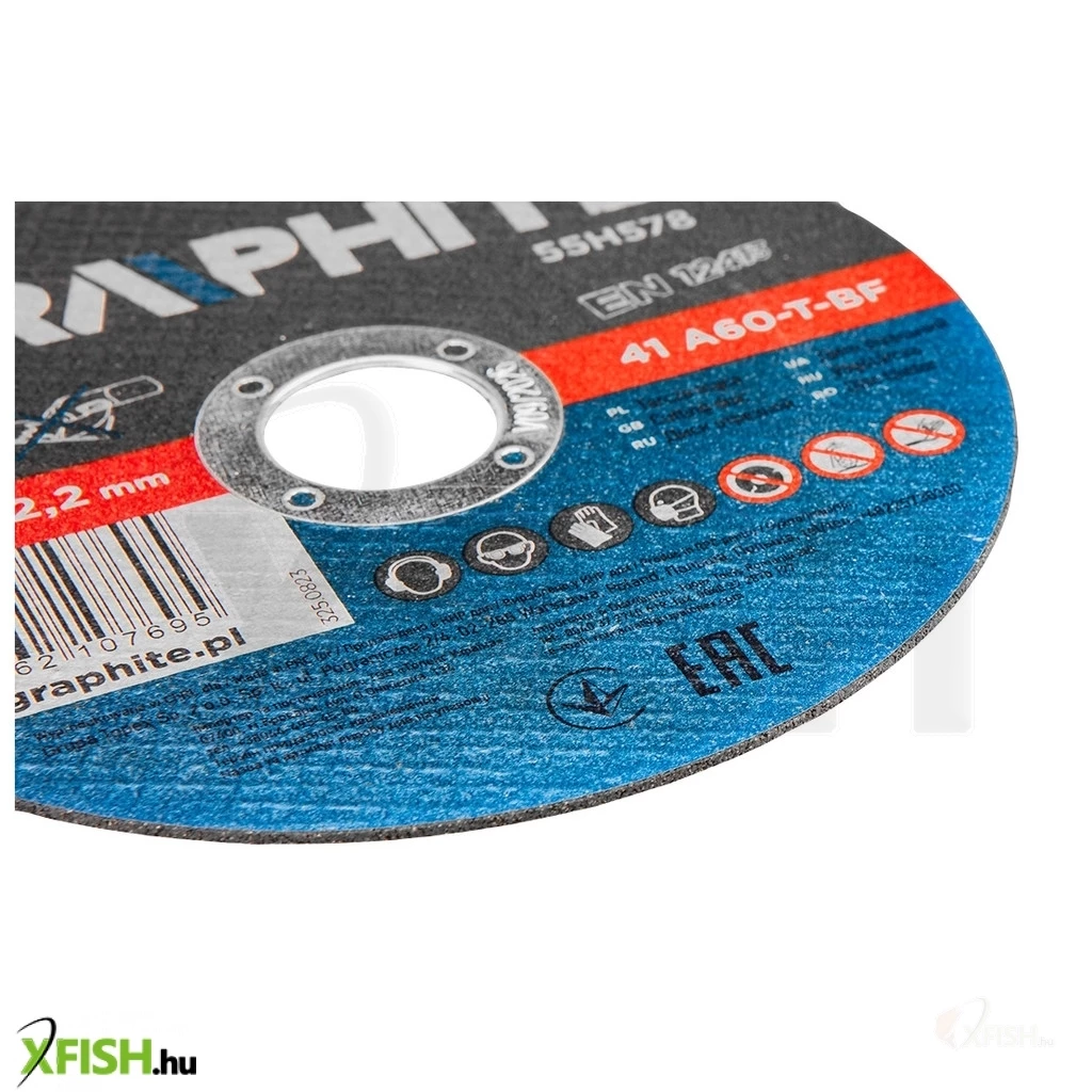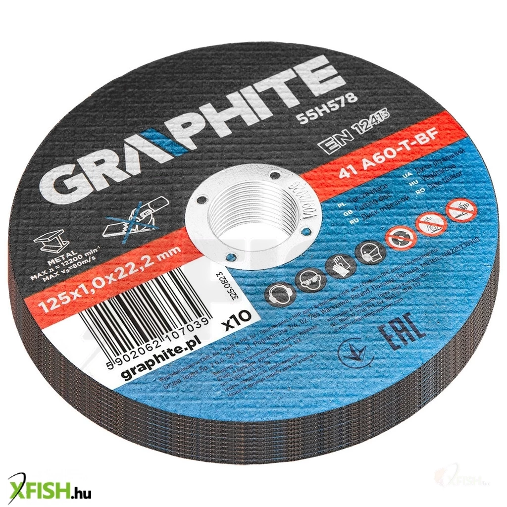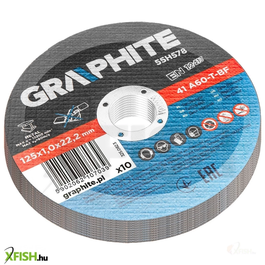 Fémvágó korong 125 x 1,0 x 22,2 mm, 41 A60-T-BF 10 db, fólia 55H578 A GRAPHITE 10 darabos készlet precíziós fémvágáshoz, tartós és hosszú élettartamú timföldből készült korong. A korong külső átmérője 125 mm, és a megfelelő fejlett kialakításnak és a vastagság csökkentésének köszönhetően - lehetővé teszi a vágási idő jelentős csökkentését.