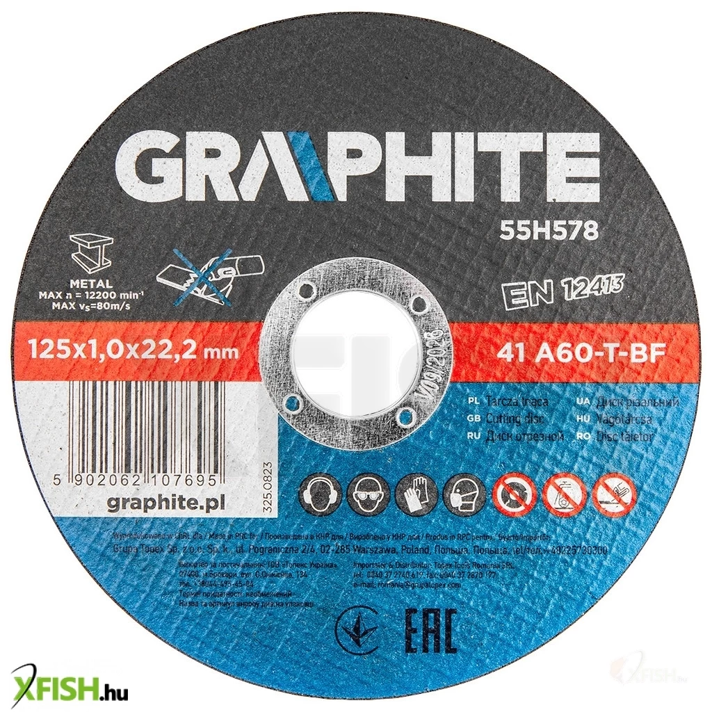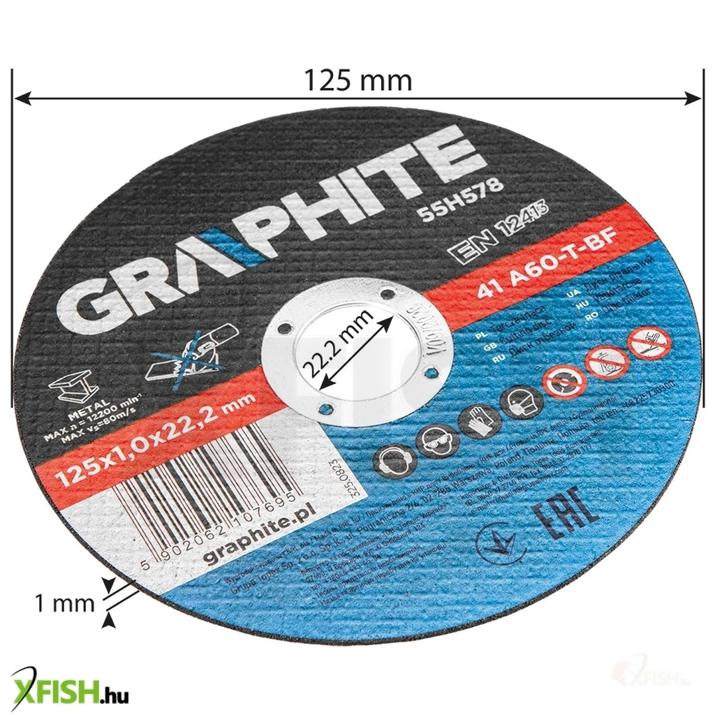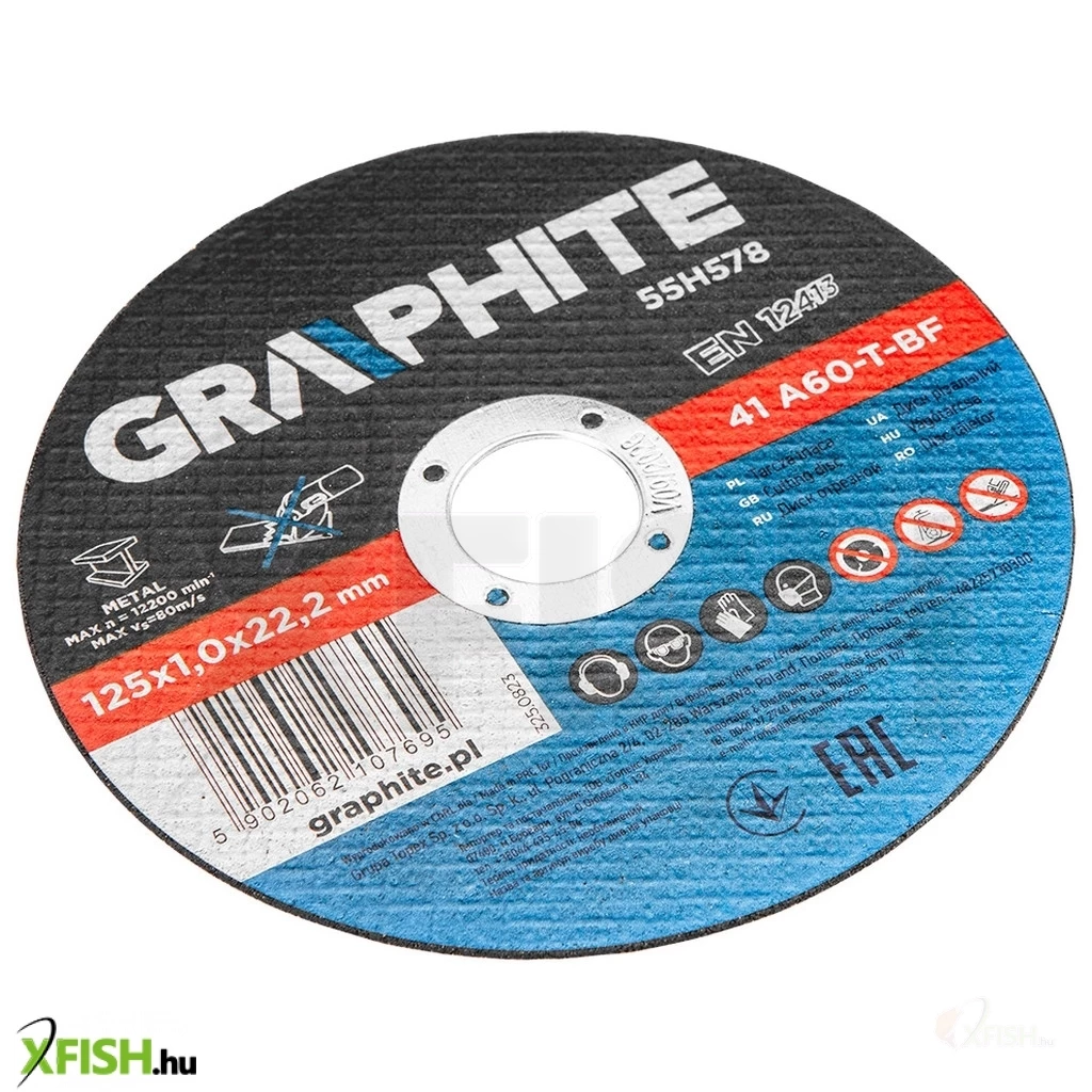 Fémvágó korong 125 x 1,0 x 22,2 mm, 41 A60-T-BF 10 db, fólia 55H578 A GRAPHITE 10 darabos készlet precíziós fémvágáshoz, tartós és hosszú élettartamú timföldből készült korong. A korong külső átmérője 125 mm, és a megfelelő fejlett kialakításnak és a vastagság csökkentésének köszönhetően - lehetővé teszi a vágási idő jelentős csökkentését.