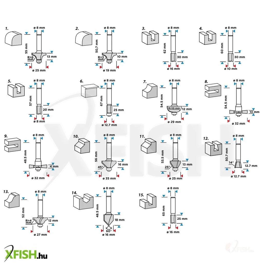 KategóriákKategóriákBarkácsolás, építkezés Fűrészek és gyalugépek Neotools felsőmaró készlet, 8mm-es szárral, 15db-os
