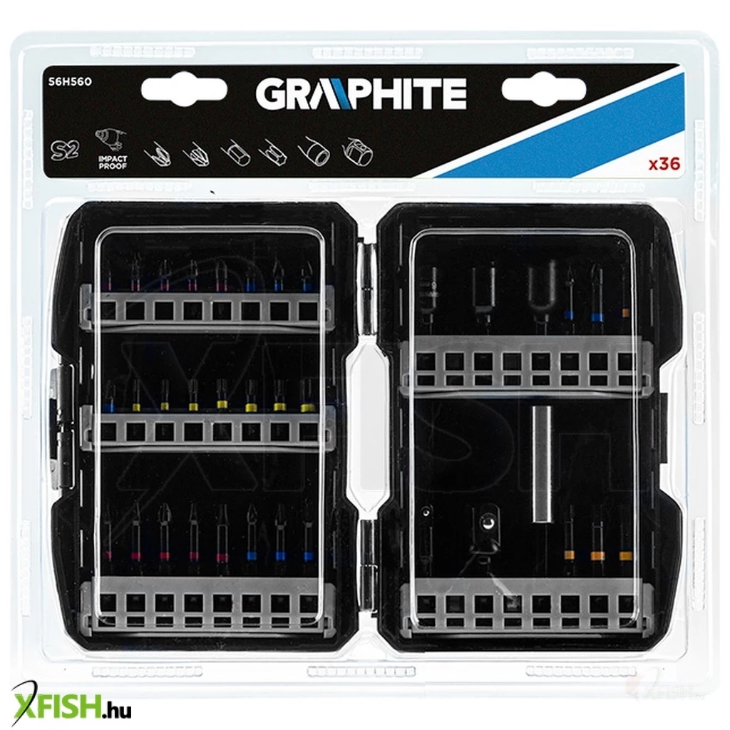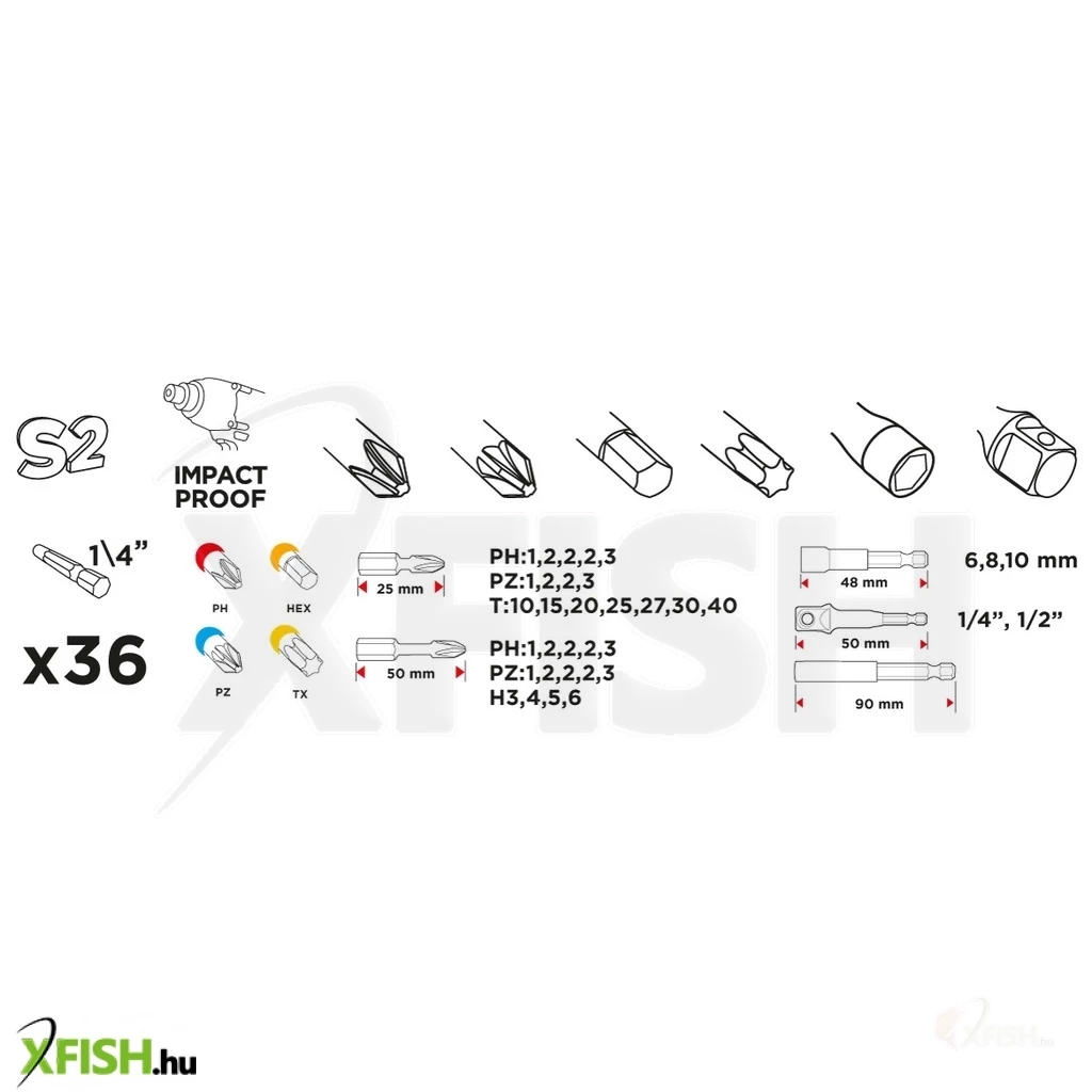 Ütvecsavarozó bitkészlet, 16 x PH1 / 2/2/2/3, PZ1 / 2/2/3, TX10 / 15/20/25/27/30/40, teljes hossz 25 mm, 14 x PH1 / 2/2 / 2/3, PZ1 / 2/2/2/3, HEX3 / 4/5/6 teljes hossz 50 mm, 3 x aljzat 6, 8, 10 mm, hosszúság 48 mm, 1 x fogantyú 90 mm, 2 x adapter1 / 4 ", 1/2 ", hosszúság 50 mm acél S2, hajtás 1/4 ", 36 db.