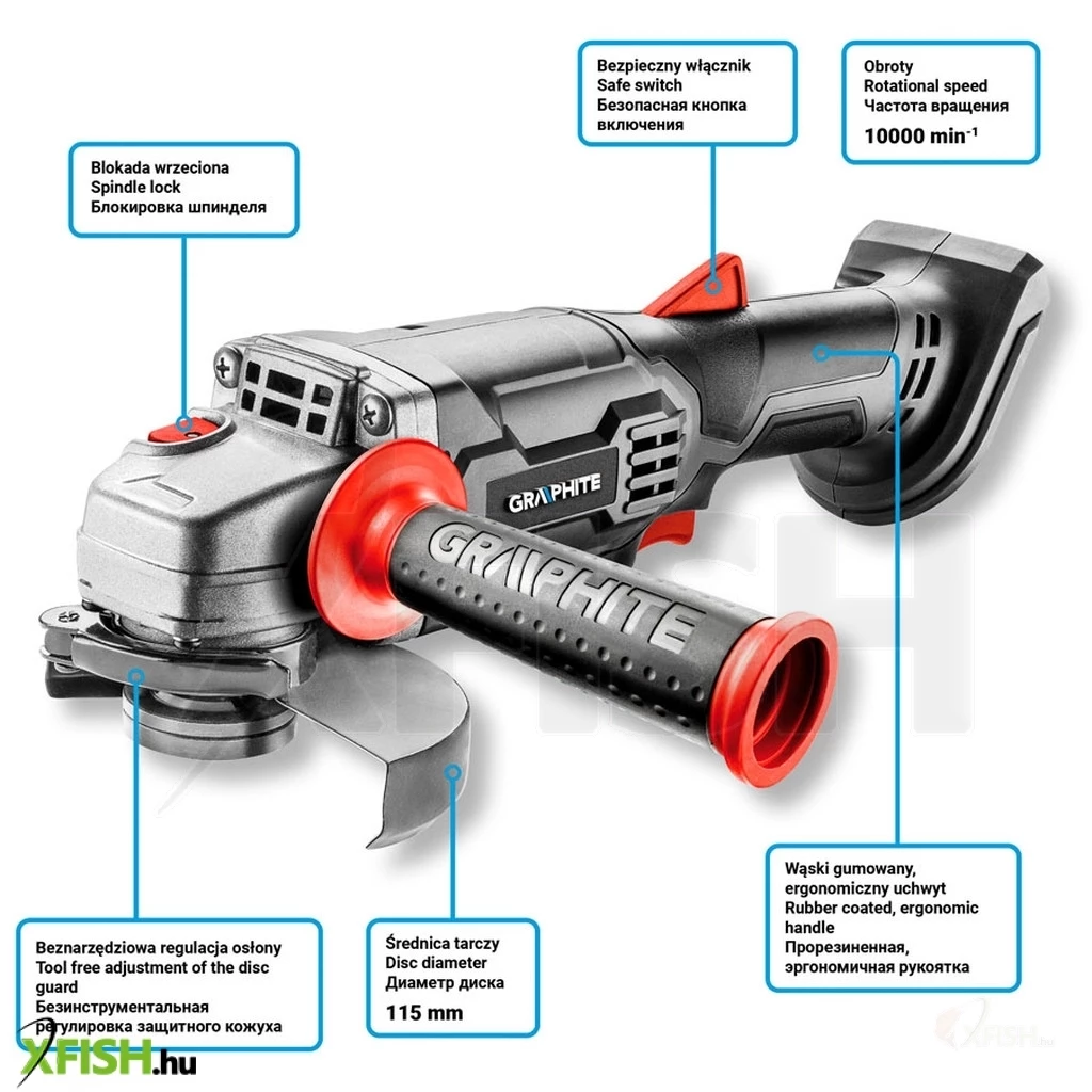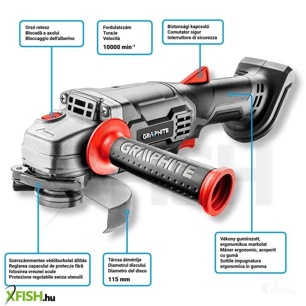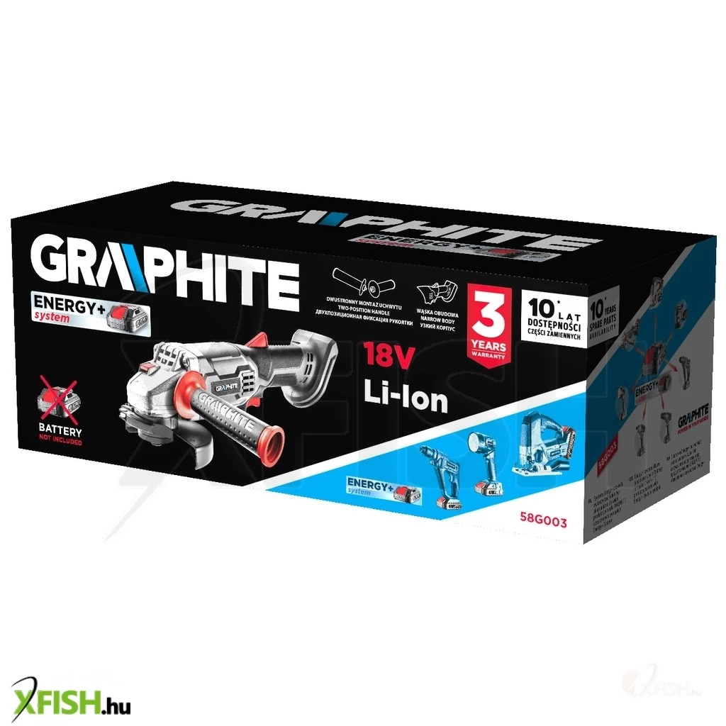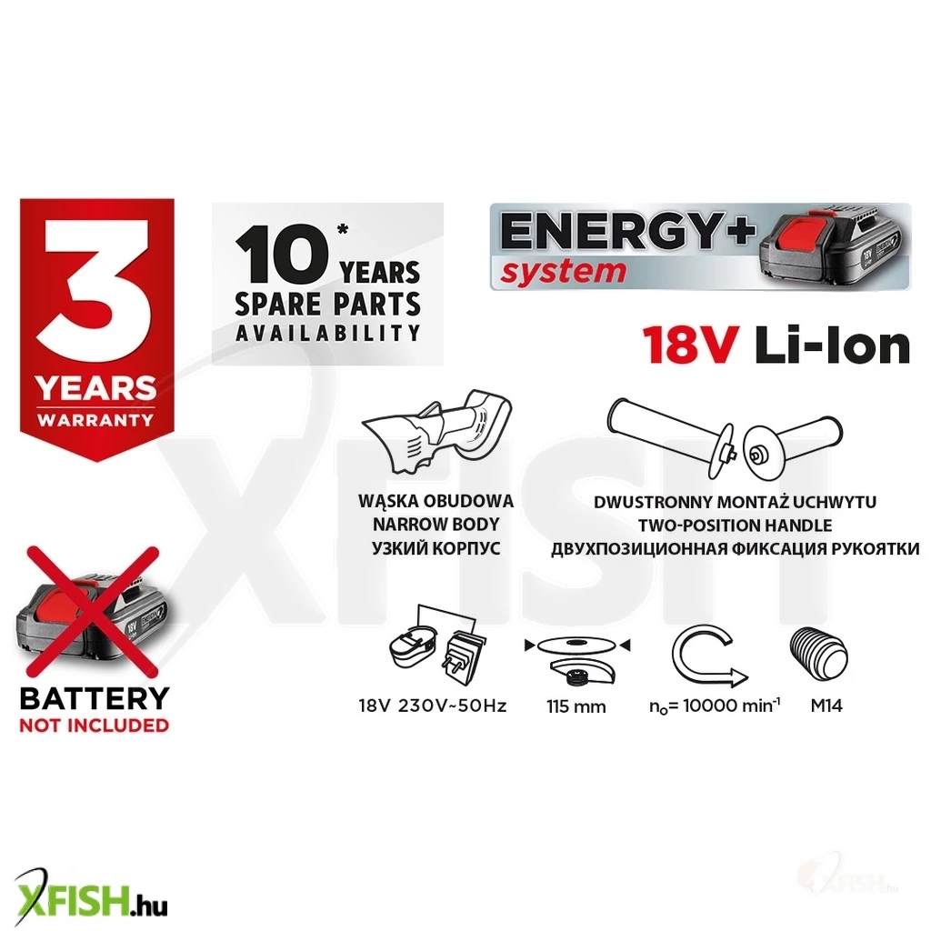 Akkus sarokcsiszoló 18V, Li-Ion, 115x22.2 mm tárcsa, fordulatszám 10000 minOO, orsó menet M14, kétállású oldalsó markolat, (LxH) 320 x 130 mm, tömege 1.5 kg, kompatibilis az Energy+ akkumulátorokkal
