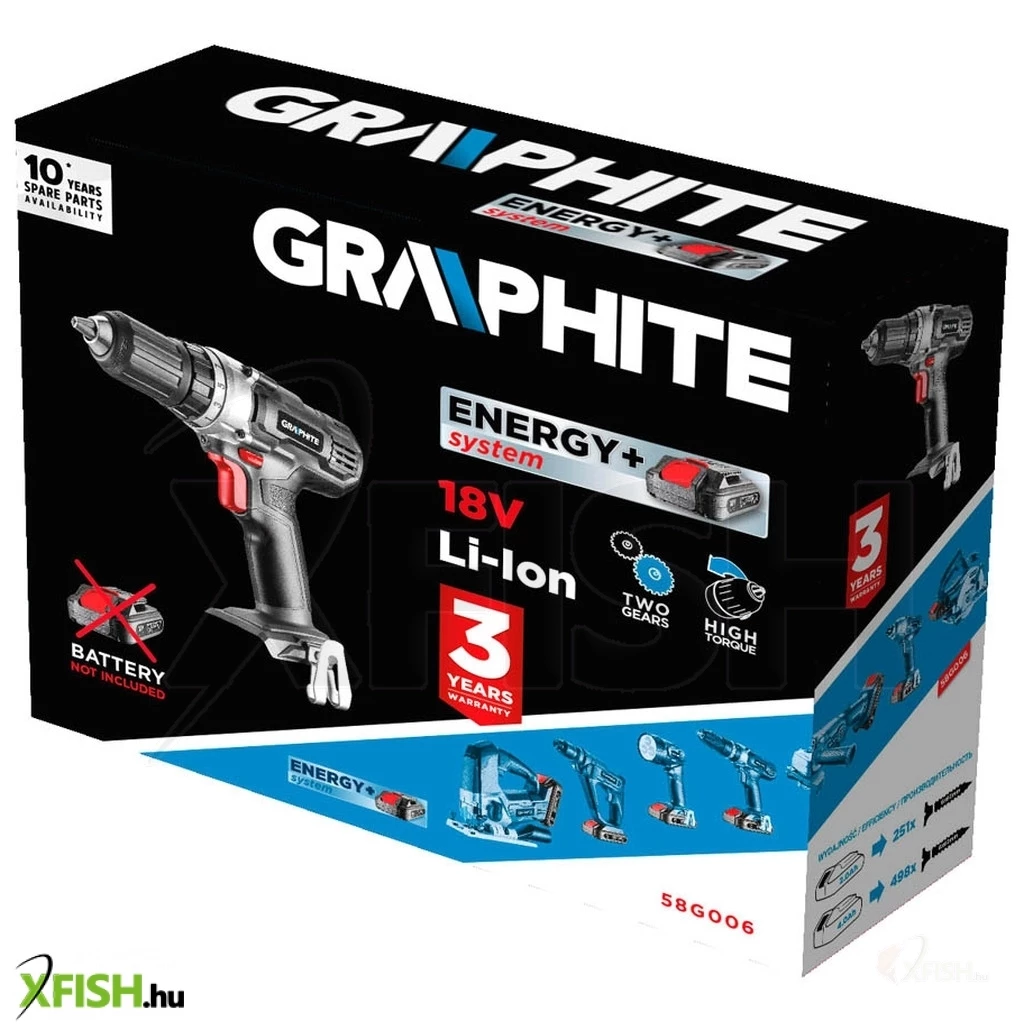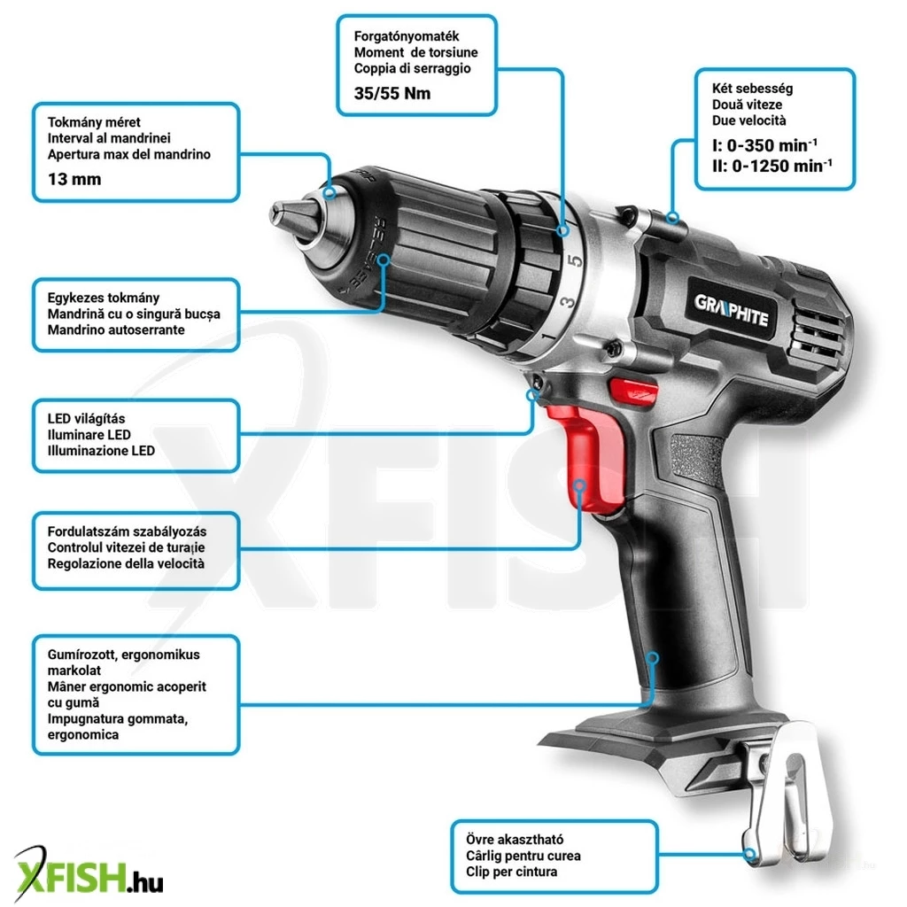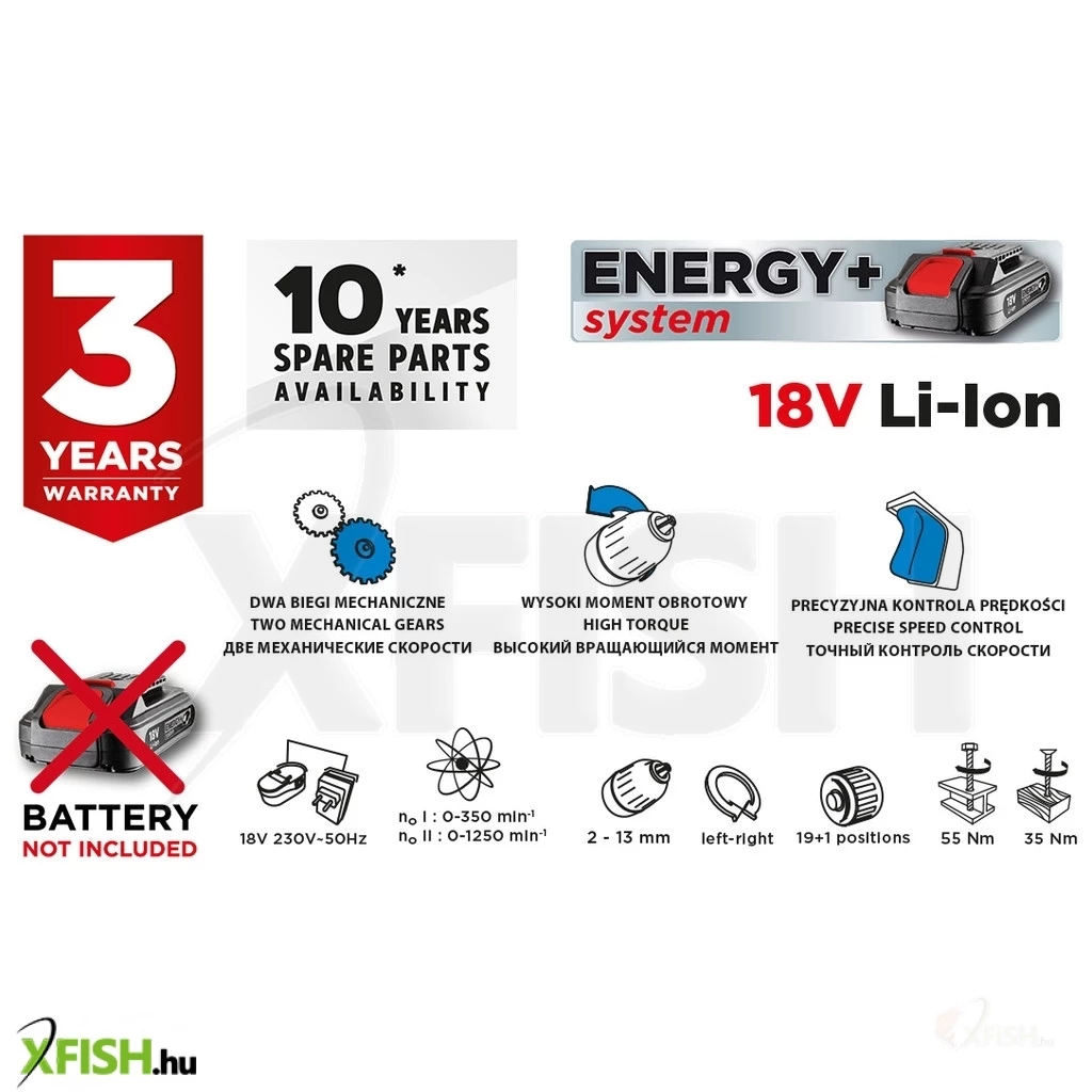 Akkus fúró/csavarozó 18V, Li-Ion, fordulatszám I: 0-350 minOO II: 0-1250 minOO, jobbra/balra, önzáró fúrótokmány 2-13 mm, 19 pozíciós tengelykapcsoló (valamint fúró opció), forgatónyomaték (puha/kemény): 35/55 Nm, orsófék, (LxH) 230 x 220 mm, tömege 1.1 kg, kompatibilis az Energy+ akkumulátorokkal