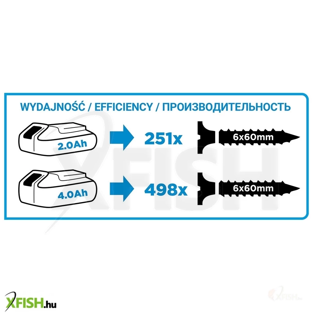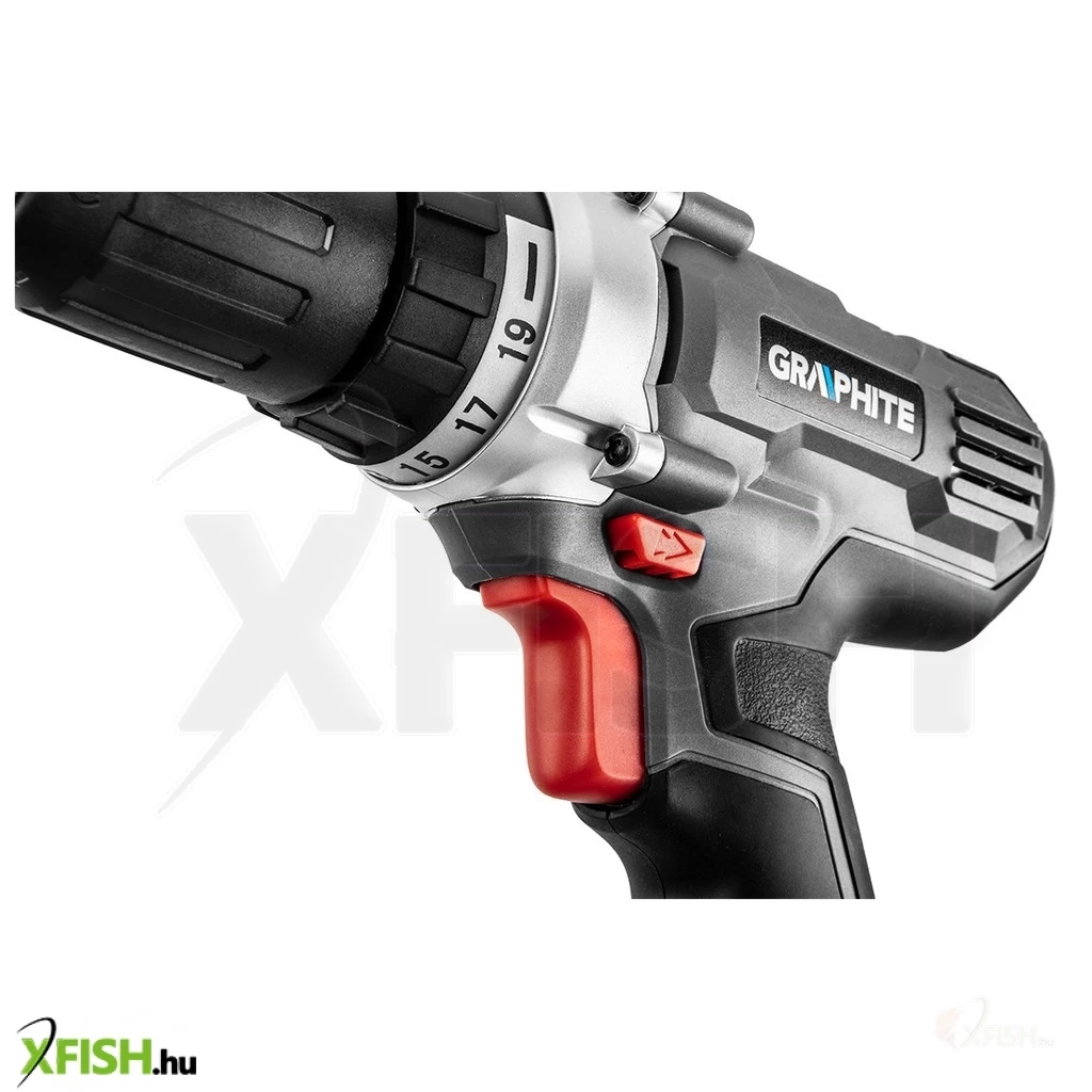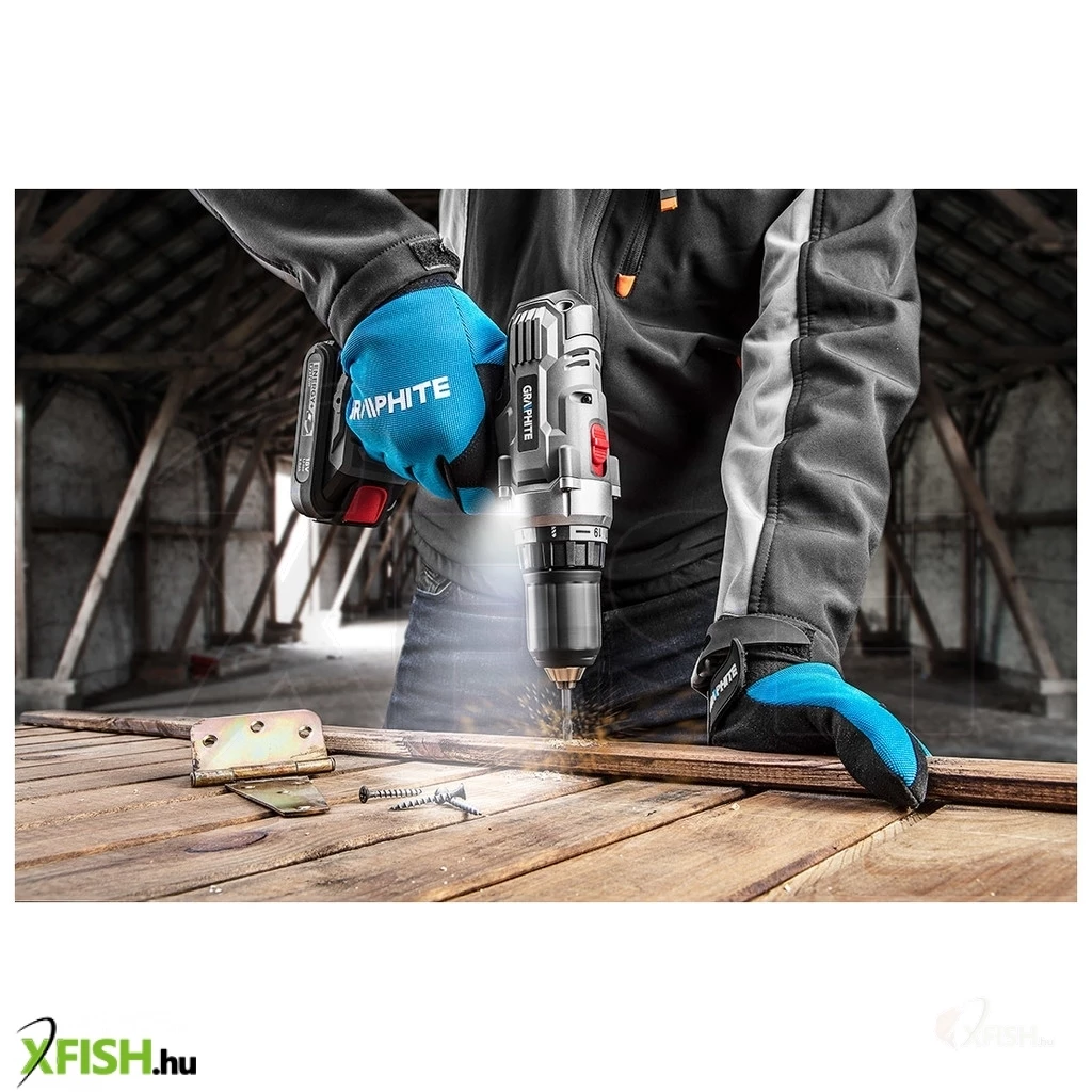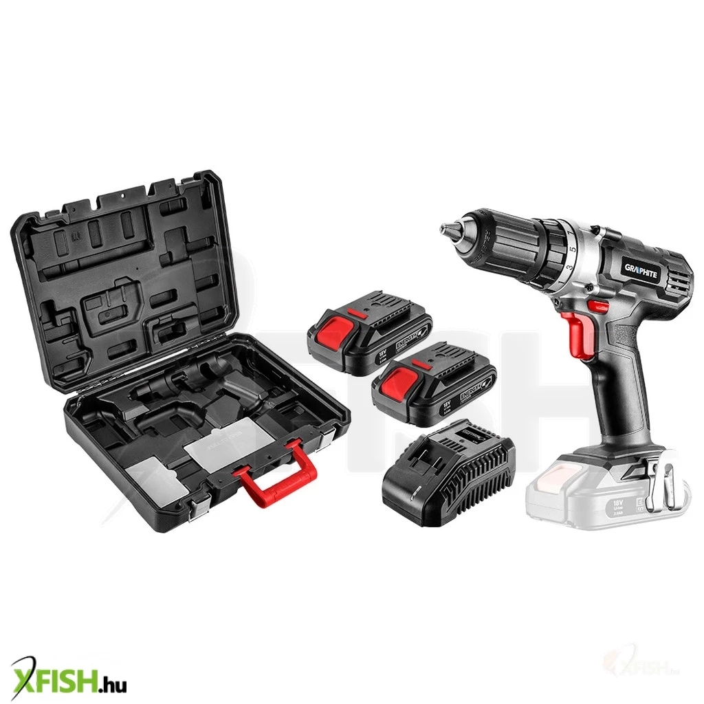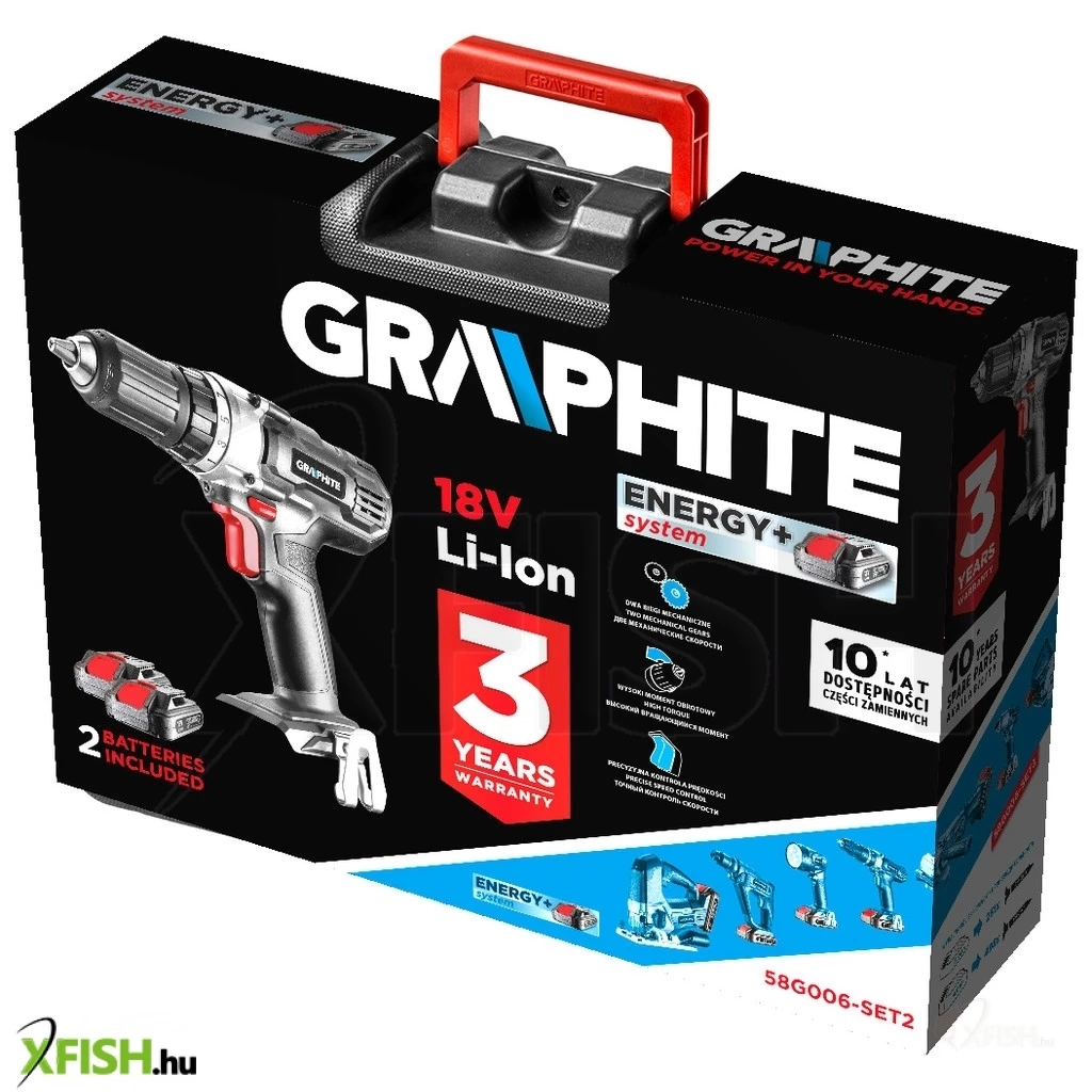 GRAPHITE Energy+ készlet. A készlet részei: fúró-csavarozó (58G006), két akkumulátorral - kapacitás: 2.0Ah (58G001) - és töltővel 2.0 Ah (58G002), kofferben. A kofferben további tárolóhelyek a tartozékok számára.
