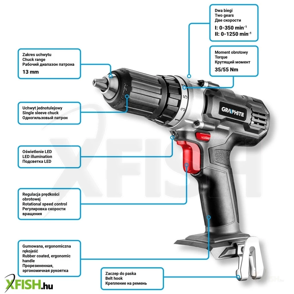 Akkumulátoros fúró-csavarozó 18V, Li-Ion, fordulatszám I: 0-350 percOO II: 0-1250 percOO, bal/jobb, önzáró tokmány 2-13 mm, tengelykapcsoló gyűrű helyzetei 1-19 (és fúrás opció), forgatónyomaték (lágy/kemény): 35/55 Nm, orsófék, (LxH) 230 x 220 mm, tömeg 1.3 kg.