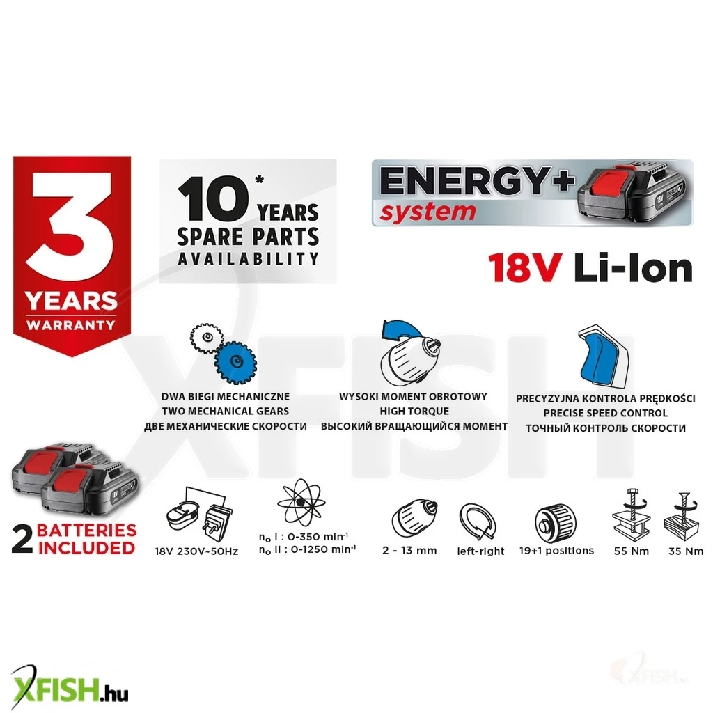 Akkumulátoros fúró-csavarozó Energy+ 18V, Li-Ion, tokmány 13 mm, 2 akku 2Ah, töltő, koffer, 58G006-SET2, GRAPHITE