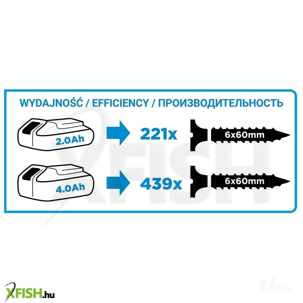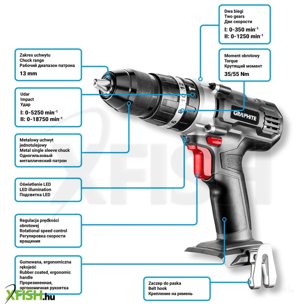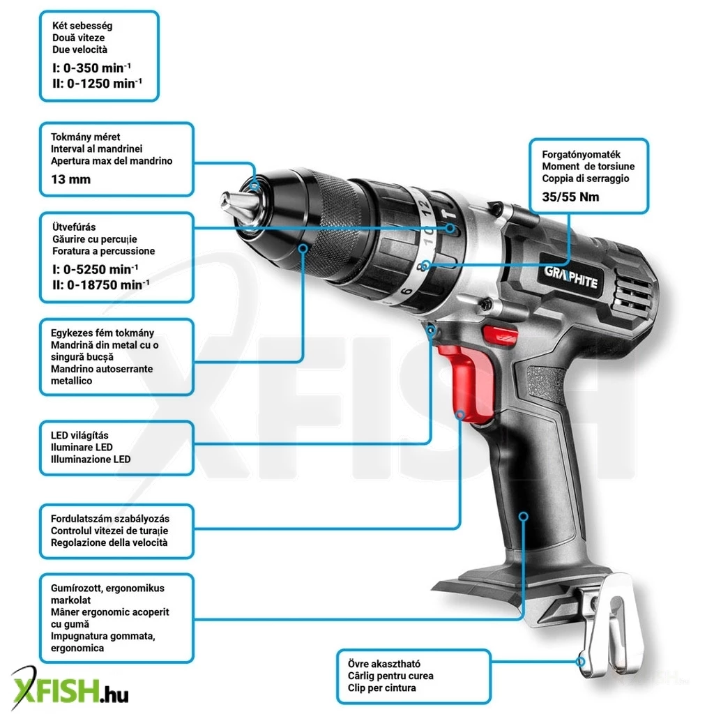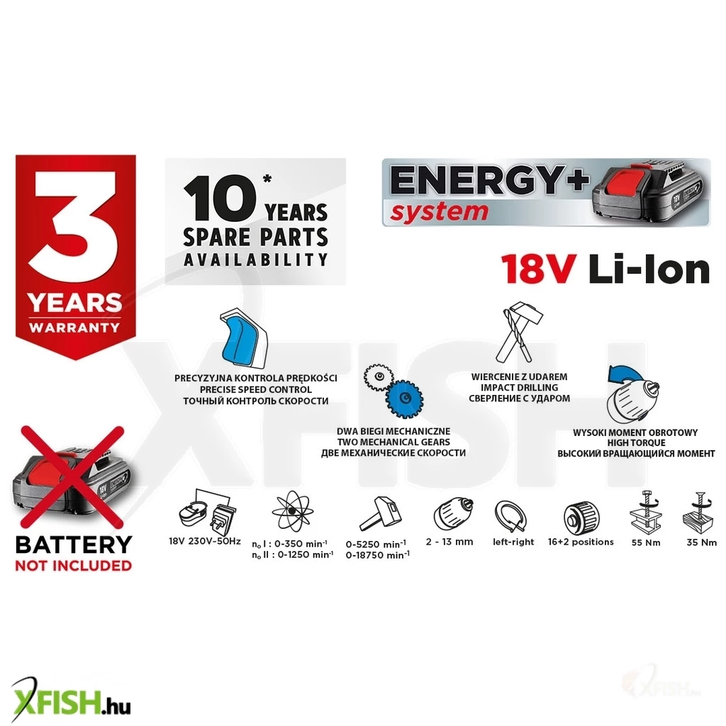 Akkus fúró-csavarozó 18V, Li-Ion, fordulatszám I: 0-350 minOO II: 0-1250 minOO, ütvefúró I: 0-5250 min-1 II: 0-18750 minOO, jobbra/balra, önzáró fúrótokmány 2-13 mm, 16 pozíciós tengelykapcsoló (valamint külön csavarózó, fúró és ütvefúró kapcsoló ) , forgatónyomaték (puha/kemény): 35/55 Nm, orsófék, (LxH) 230 x 220 mm, tömege 1.1 kg, kompatibilis az Energy+ akkumulátorokkal