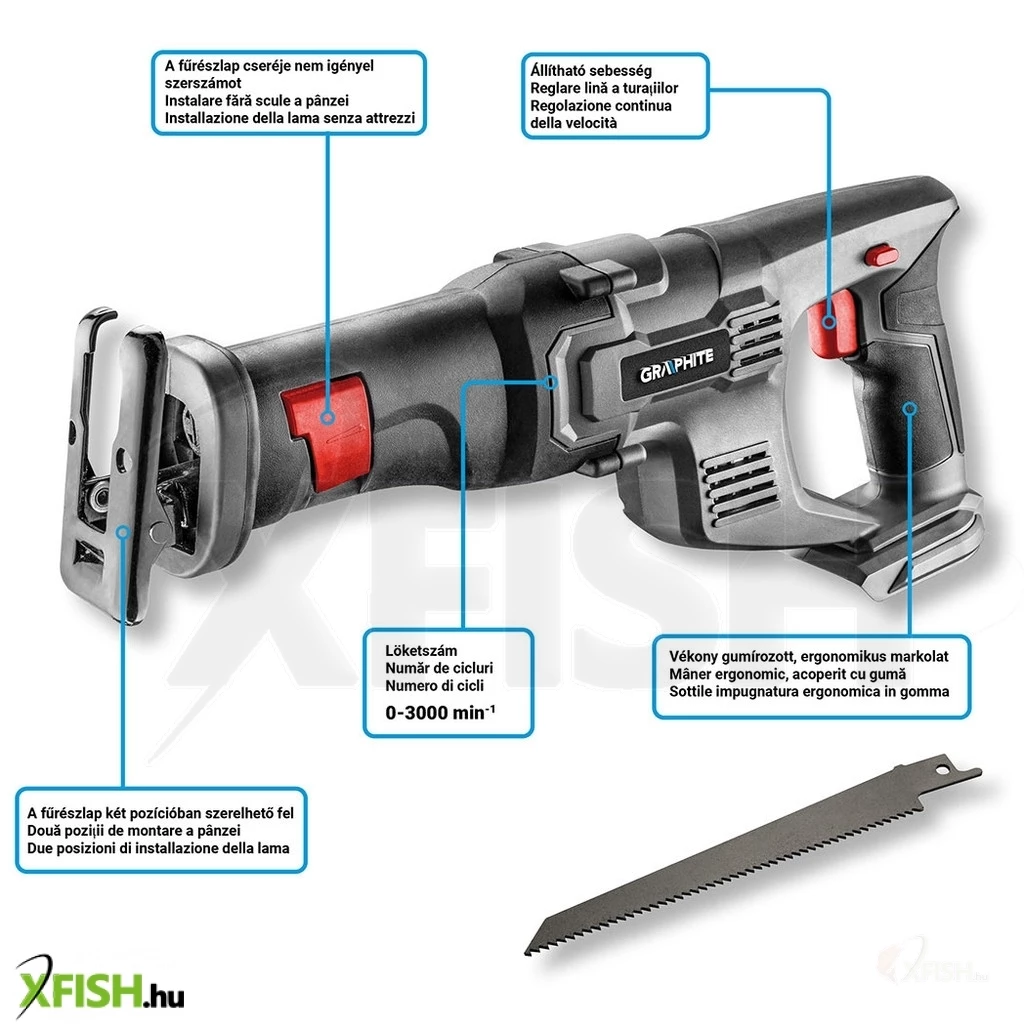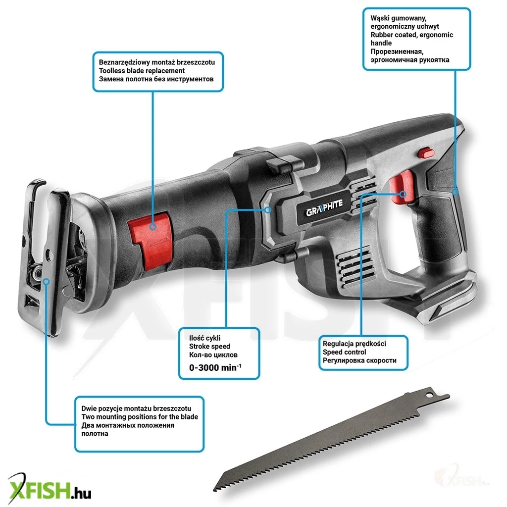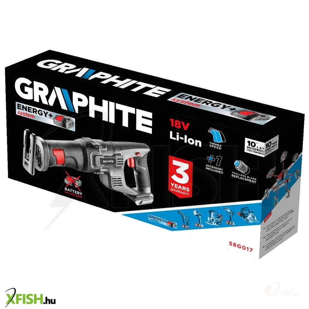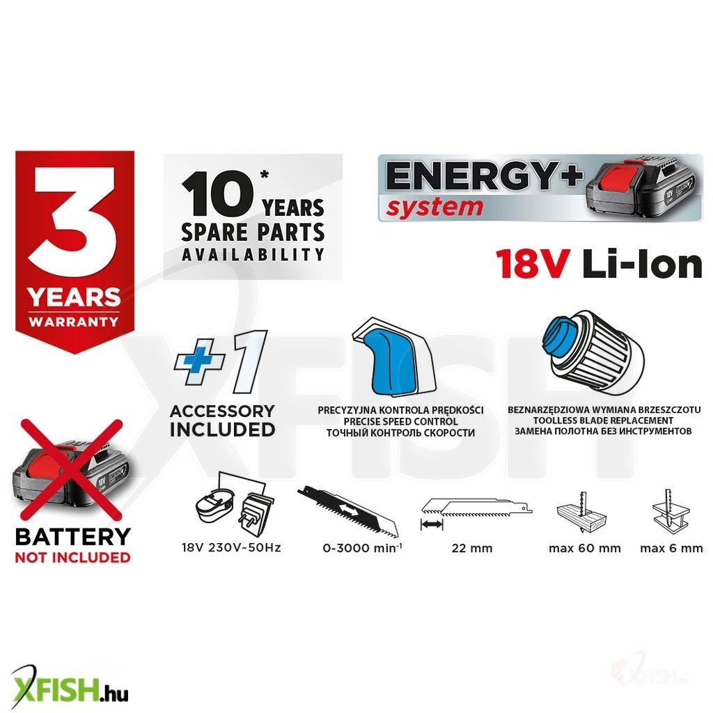 Akkus orrfűrész 18V Li-Ion, fűrészlap lökethossz 22 mm, löketszám 0-3000 minOO, vágásmélység fában/acélban 60/6 mm, tömege 1,85 kg, tartozék: fafűrészlap - 1 db, kompatibilis az Energy+ akkumulátorokkal