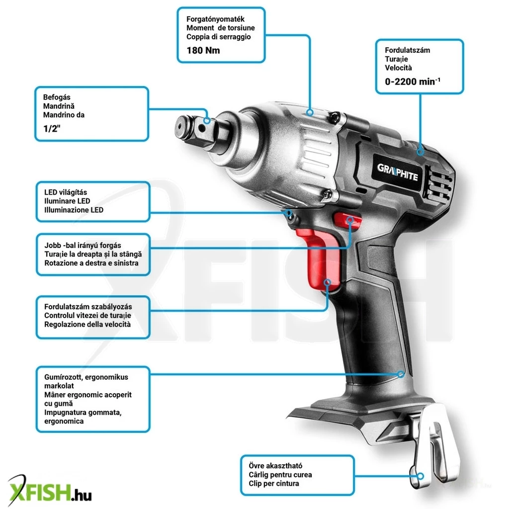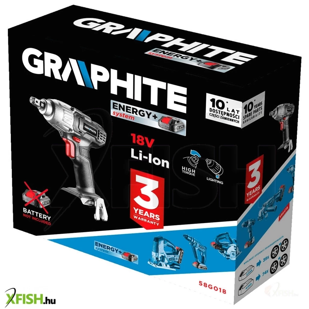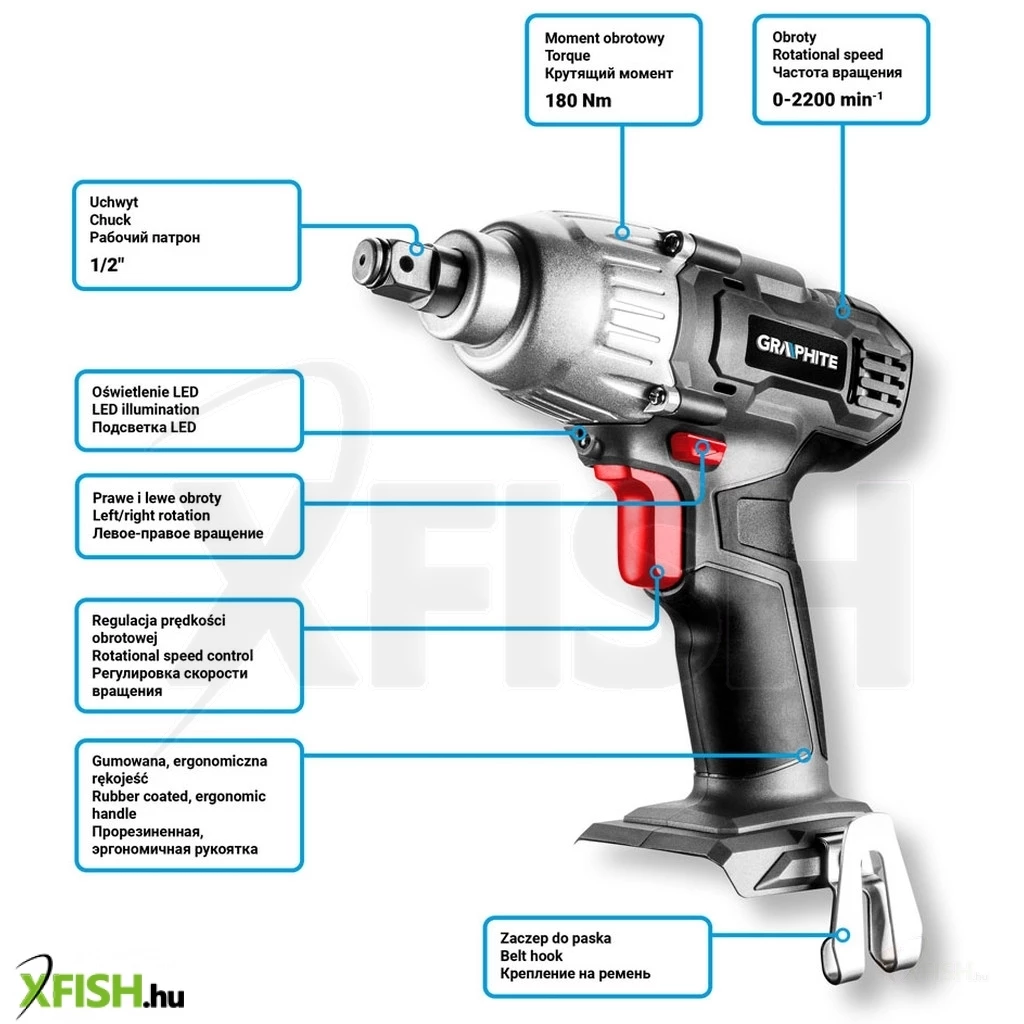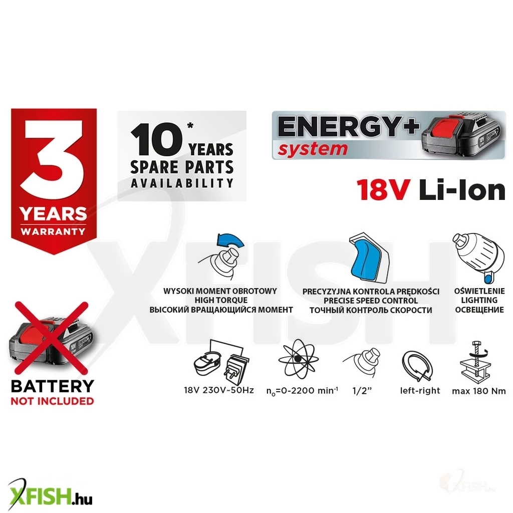 Akkus ütvecsavarozó 18V, Li-Ion, fordulatszám 0-2200 minOO, jobb/bal, forgatónyomaték 180 Nm, négyszögletes szerszámbefogó 1/2", orsófék, (LxH) 185 x 225 mm, tömege 1.8 kg, kompatibilis az Energy+ akkumulátorokkal