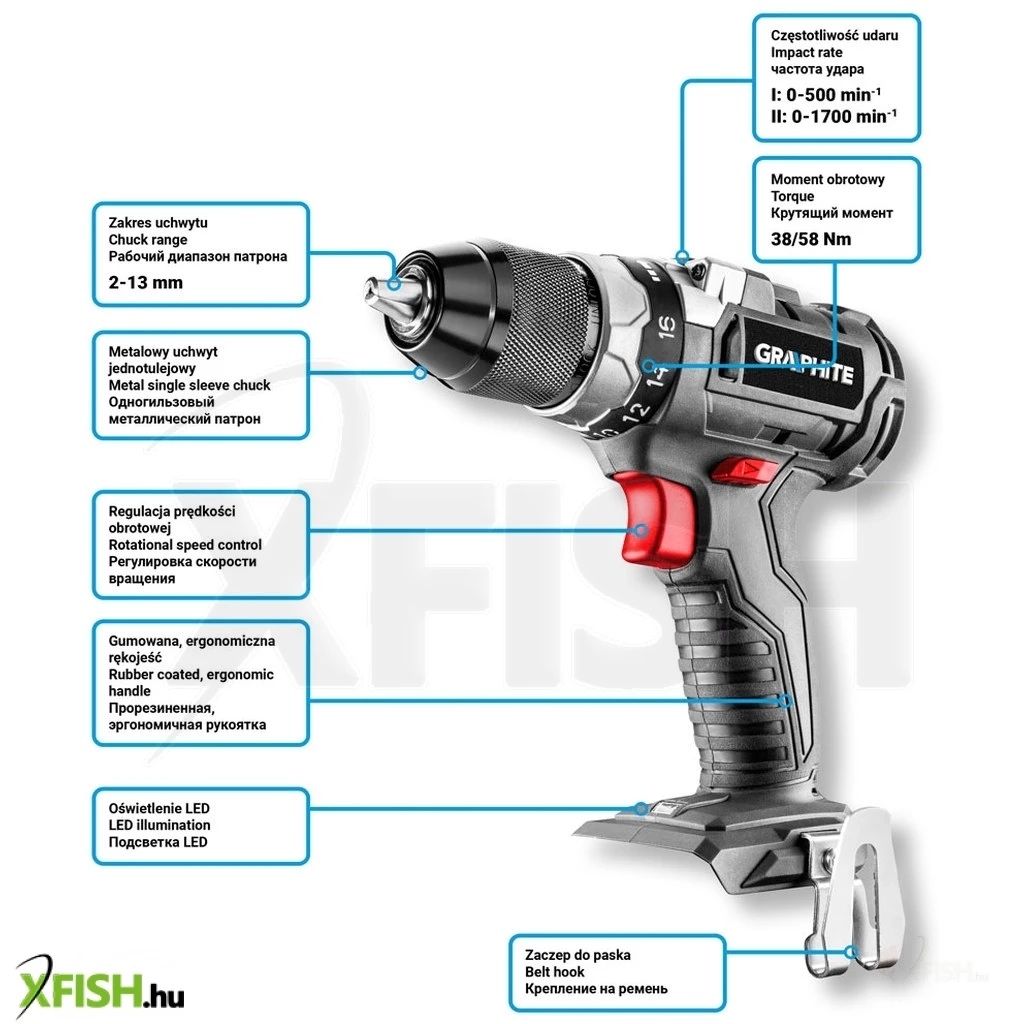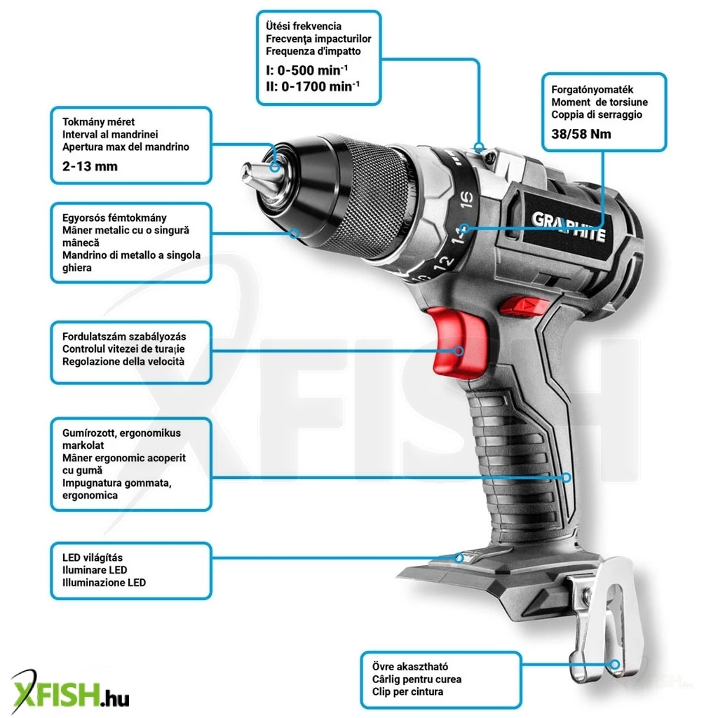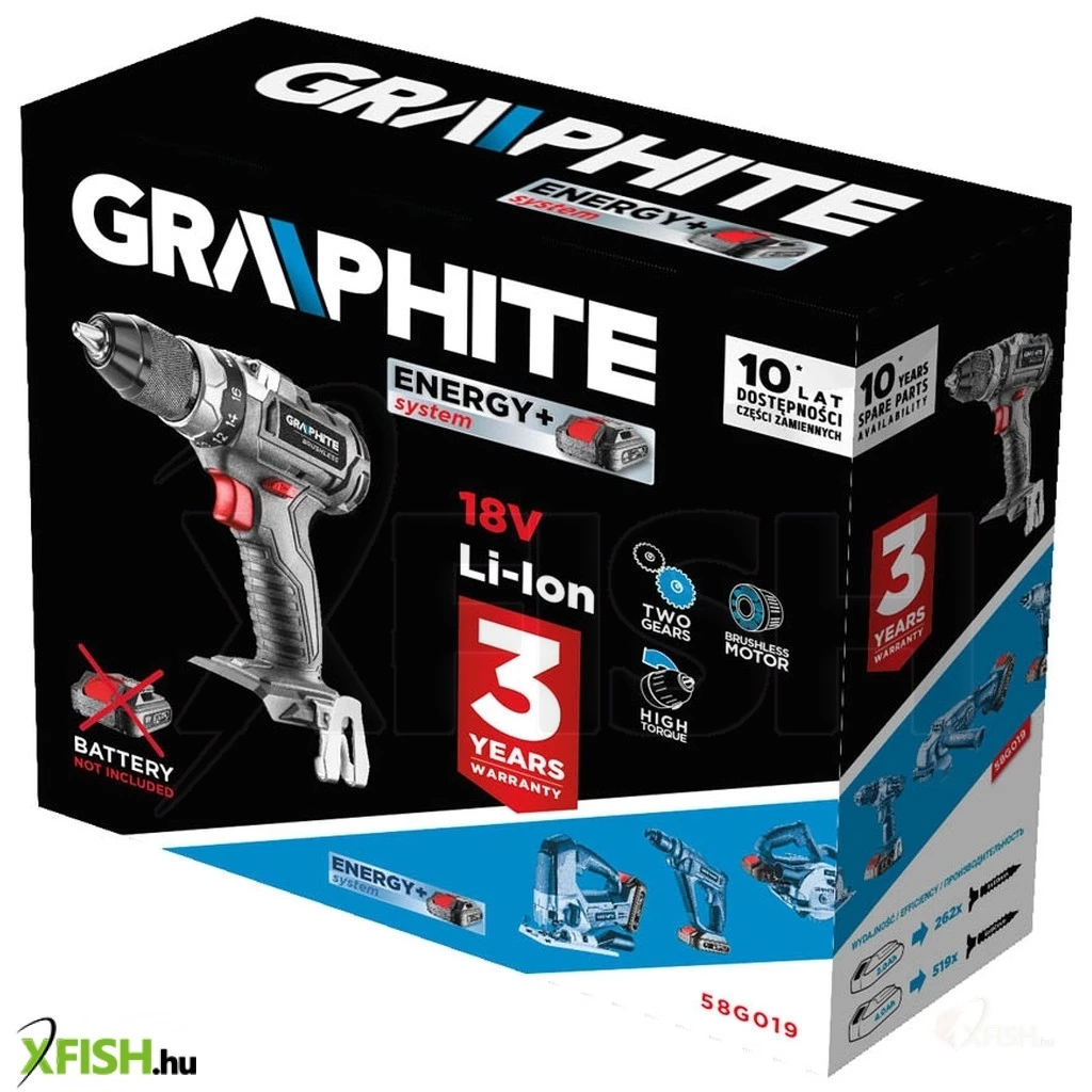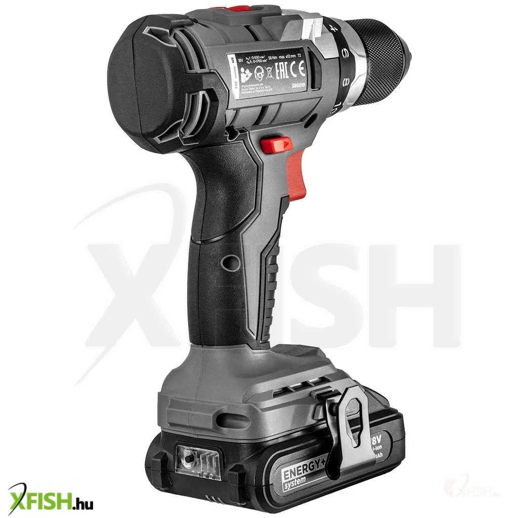 Akkus kefe mentes fúró-csavarozó 18V, Li-Ion, fordulatszám I: 0-500 minOO II: 0-1700 minOO, jobbra/balra, önzáró fúrótokmány 2-13 mm, 1-16 pozíciós tengelykapcsoló (valamint fúró opció), forgatónyomaték (puha/kemény): 38/58 Nm, orsófék, (LxH) 200 x 220 mm, tömege 1.2 kg, kompatibilis az Energy+ akkumulátorokkal