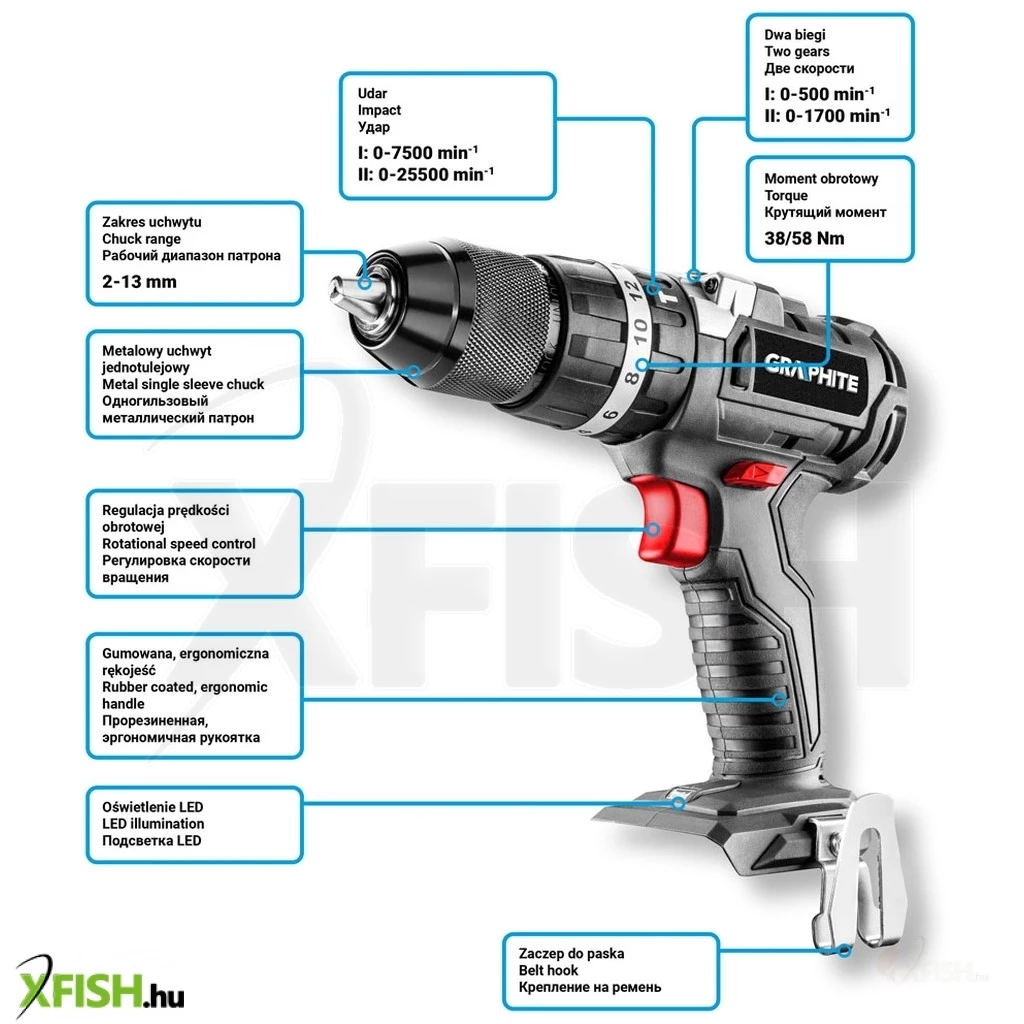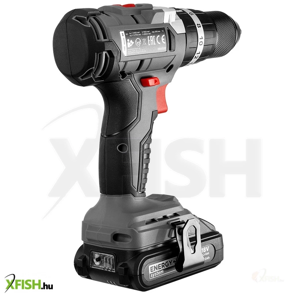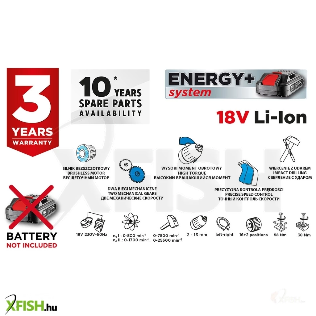 Akkus kefe mentes fúró-csavarozó 18V, Li-Ion, fordulatszám I: 0-500 minOO II: 0-1700 minOO, jobbra/balra, önzáró fúrótokmány 2-13 mm, 1-16 pozíciós tengelykapcsoló (valamint fúró/ütvefúró opció), forgatónyomaték (puha/kemény): 38/58 Nm, orsófék, (LxH) 200 x 220 mm, tömege 1.2 kg, kompatibilis az Energy+ akkumulátorokkal