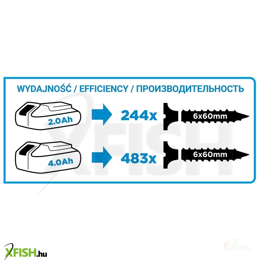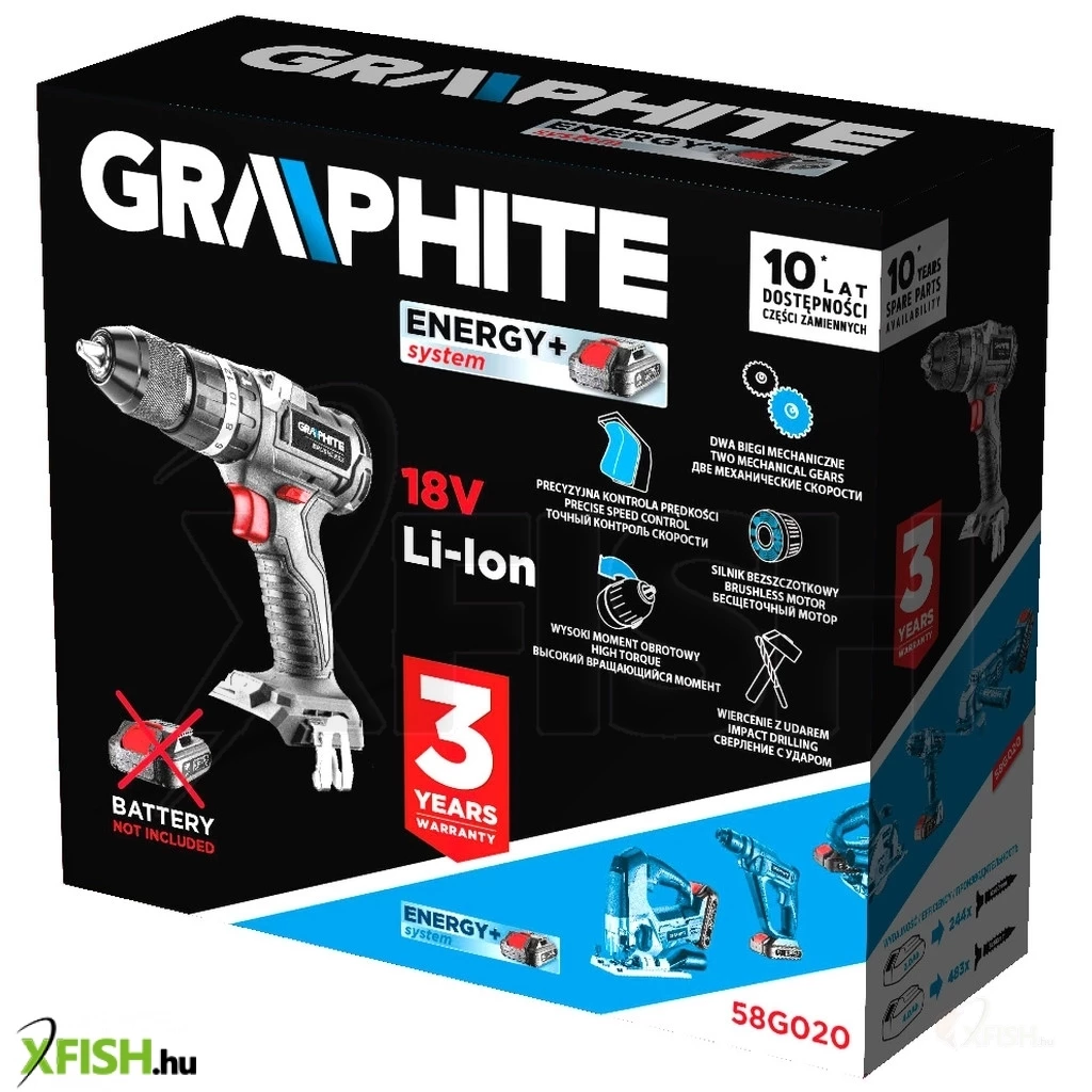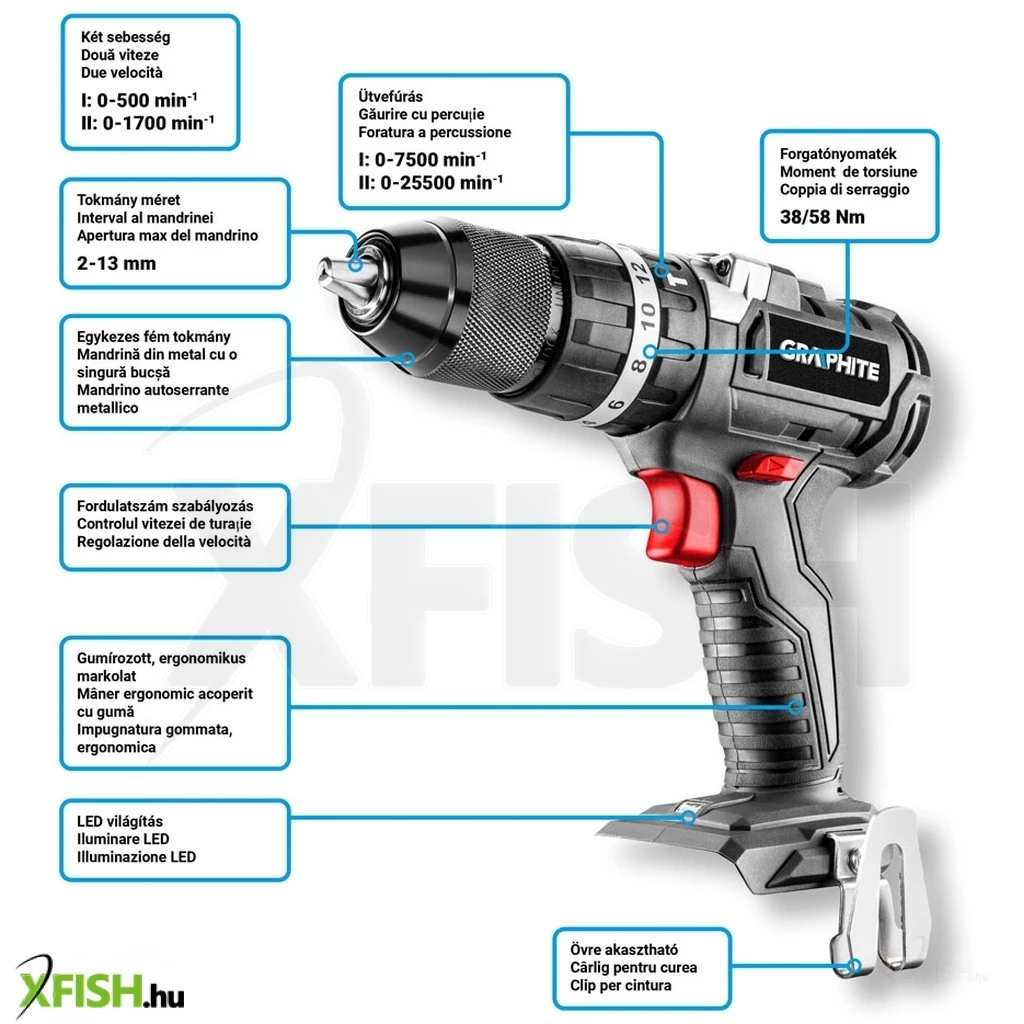 Akkus kefe mentes fúró-csavarozó 18V, Li-Ion, fordulatszám I: 0-500 minOO II: 0-1700 minOO, jobbra/balra, önzáró fúrótokmány 2-13 mm, 1-16 pozíciós tengelykapcsoló (valamint fúró/ütvefúró opció), forgatónyomaték (puha/kemény): 38/58 Nm, orsófék, (LxH) 200 x 220 mm, tömege 1.2 kg, kompatibilis az Energy+ akkumulátorokkal