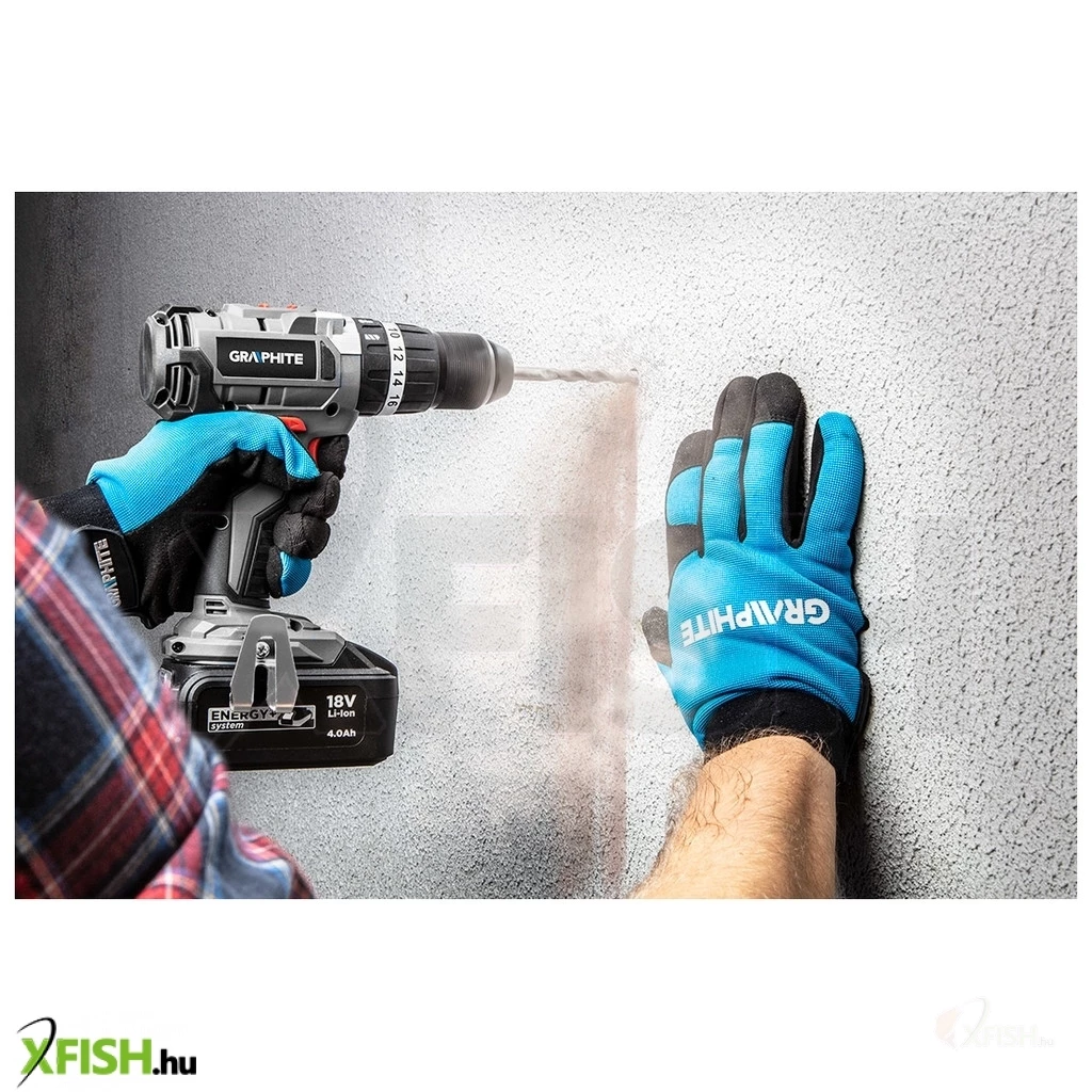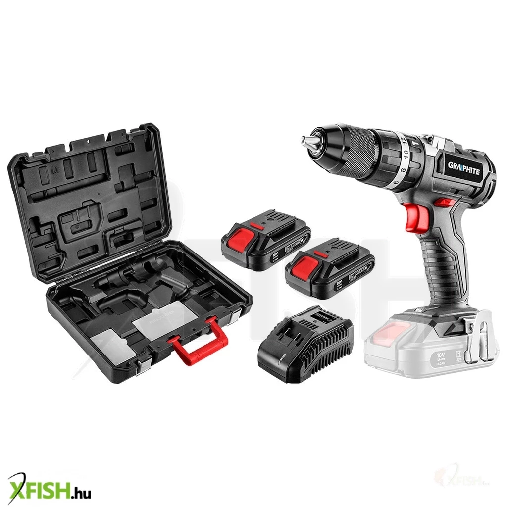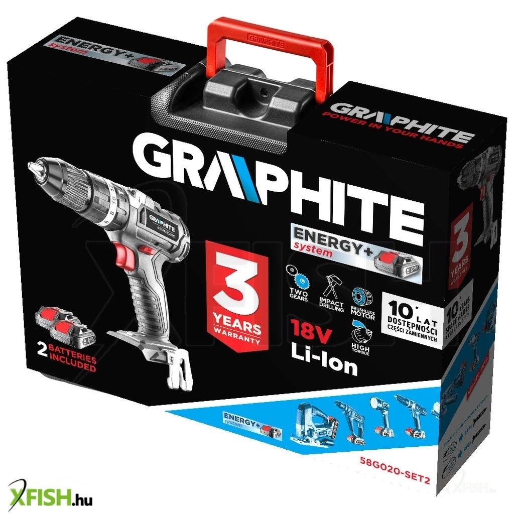 GRAPHITE Energy+ készlet. A készlet részei: kefe nélküli ütvefúró-csavarozó (58G020), két akkumulátorral - kapacitás: 2.0Ah (58G001) - és töltővel (58G002), kofferben. A kofferben további tárolóhelyek a tartozékok számára.