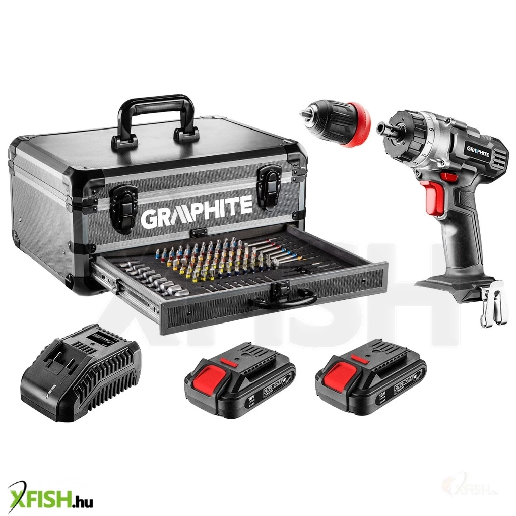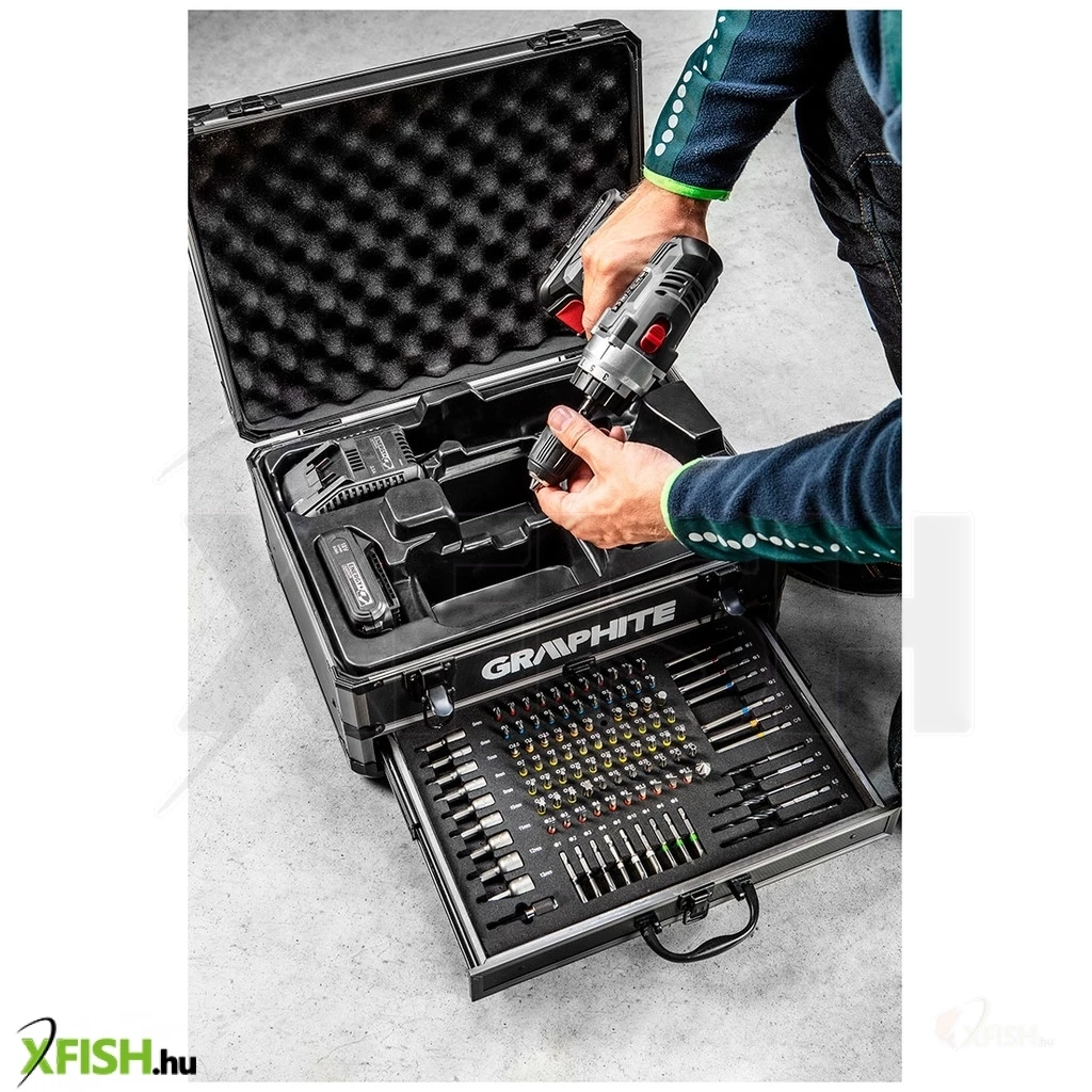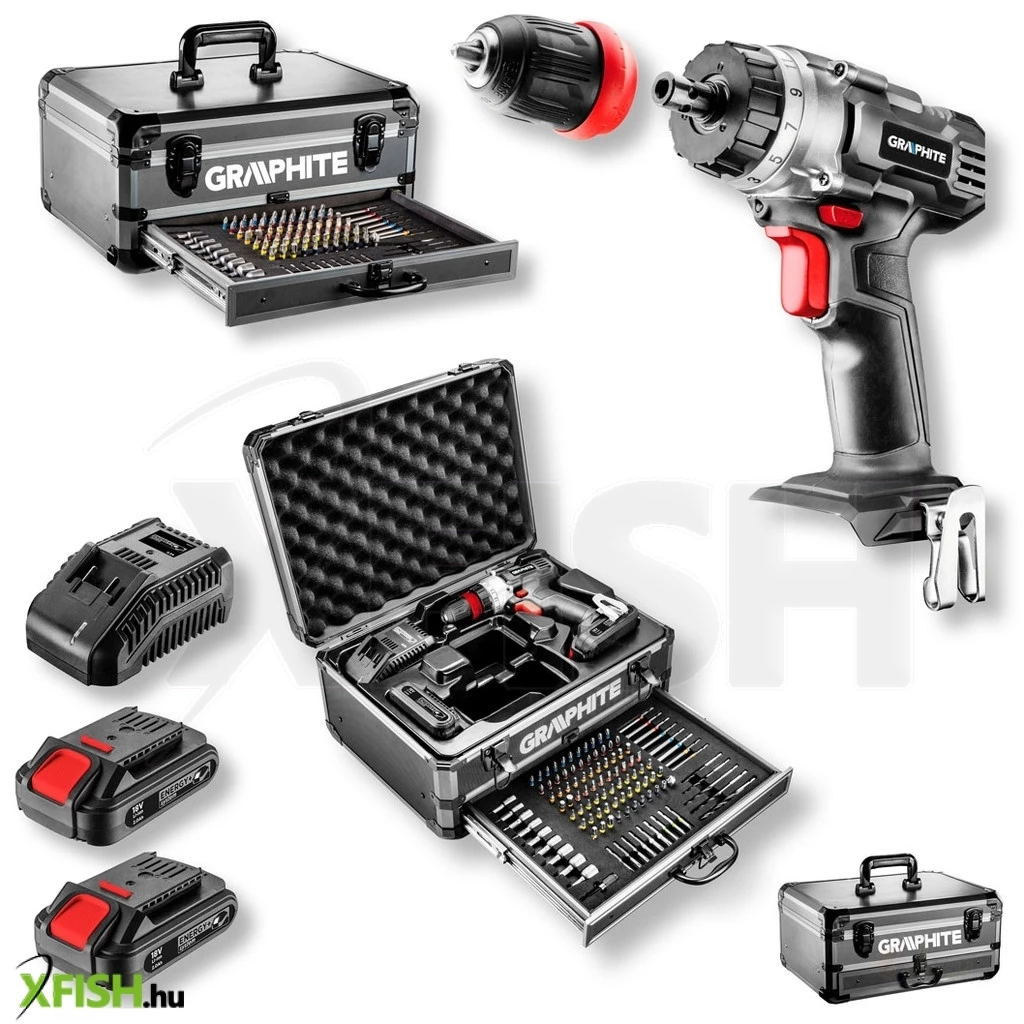 Energy+ készlet alumínium kofferben: fúró-csavarozó, Energy+ 18V, Li-lon 2.0Ah akkumulátor - 2 db, akkutöltő. Tartalmaz 109 tartozékot: 25 mm-es bitek - 76 db, 50 mm-es bitek - 9 db, 75 mm-es bitek - 8 db, fafúró - 5 db, dugókulcs - 9 db, lyukfúró - 1 db, hosszabbító - 1 db