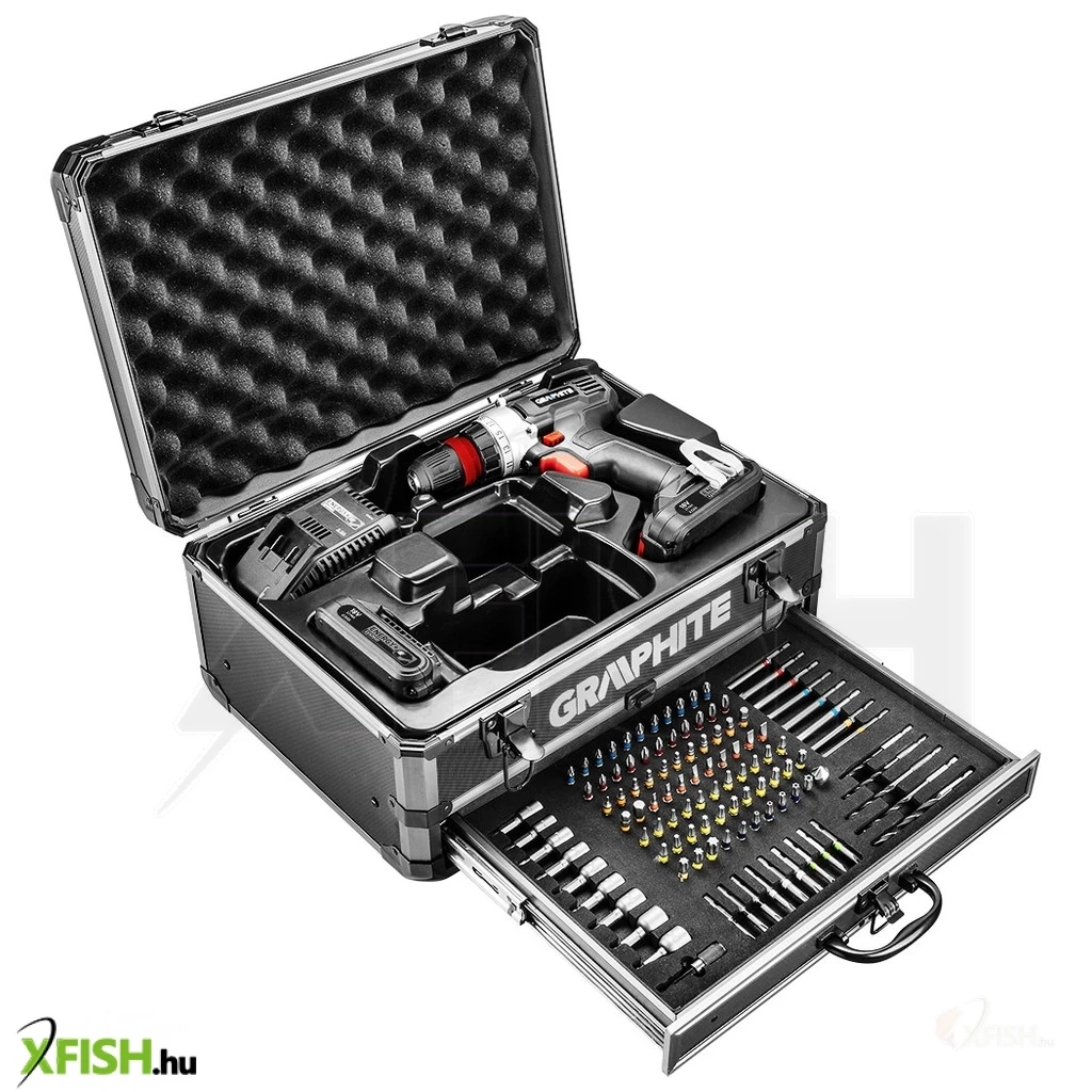 Neotools akkus fúró energy+, 2db akku+töltő!, 18v/2ah, 10mm + alu koffer + 109 kiegészítő, levehető fúrótokmány