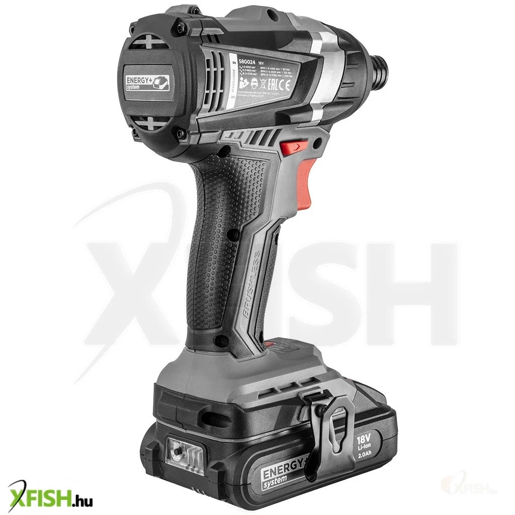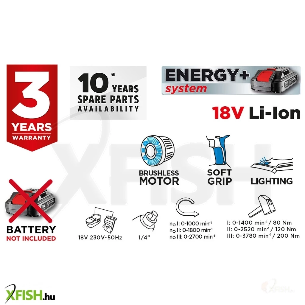 Akkus kefe mentes csavarozó 18V, Li-Ion, fordulatszám I. 0-1000 minOO II. 0-1800 minOO III. 0-2700 minOO, jobb/bal, forgatónyomaték 80/120/200 Nm, szerszámbefogó 6.35 mm (1/4"), orsófék, tömege 1.2 kg, kompatibilis az Energy+ akkumulátorokkal