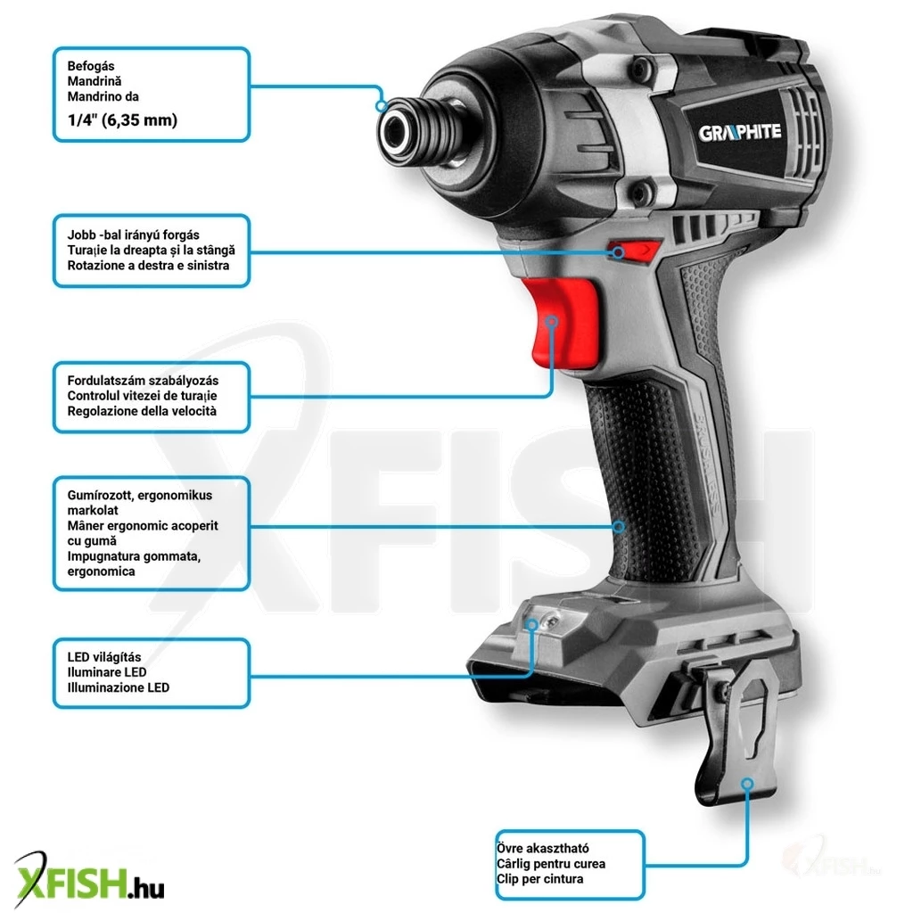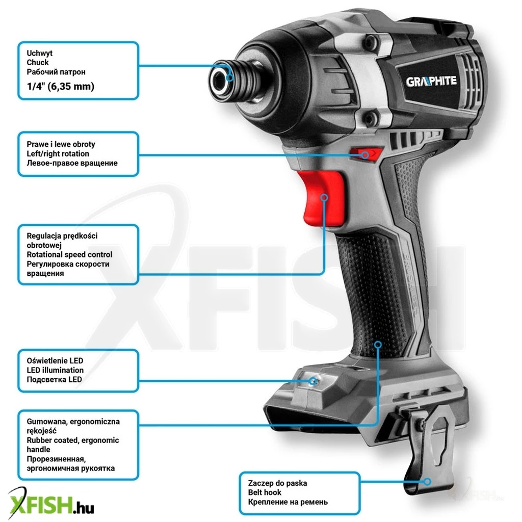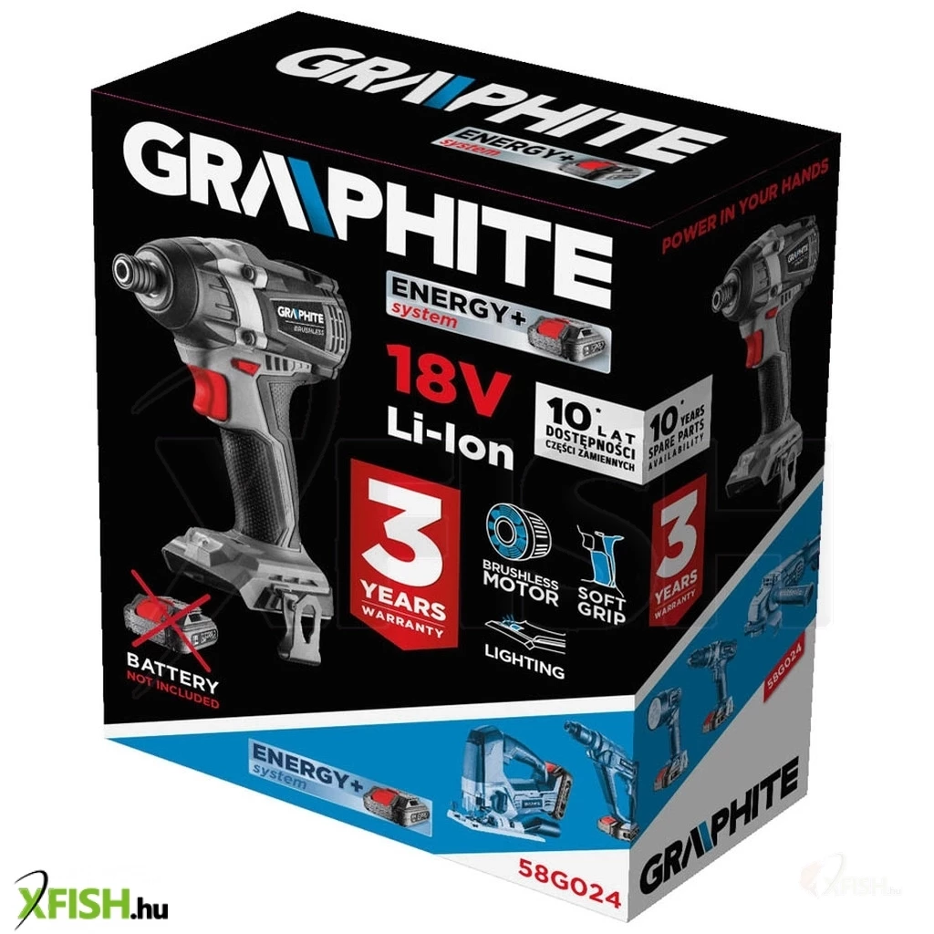 Nagy teljesítményű ütvecsavarozó 18 V-os Li-Ion GRAPHITE Energy+ akkumulátorokkal. Falhasználása: csavarok, facsavarok ki- és becsavarása fába, fémbe, műanyagba. A készülék fel van szerelve az orsó gyors leállítását biztosító elektromos motorfékkel és a munkaterületet megvilágító LED diódával. A markolat ergonomikus kialakítása és a készülék optimális teljes hossza hatékony munkavégzést biztosít mindenféle körülmények között.