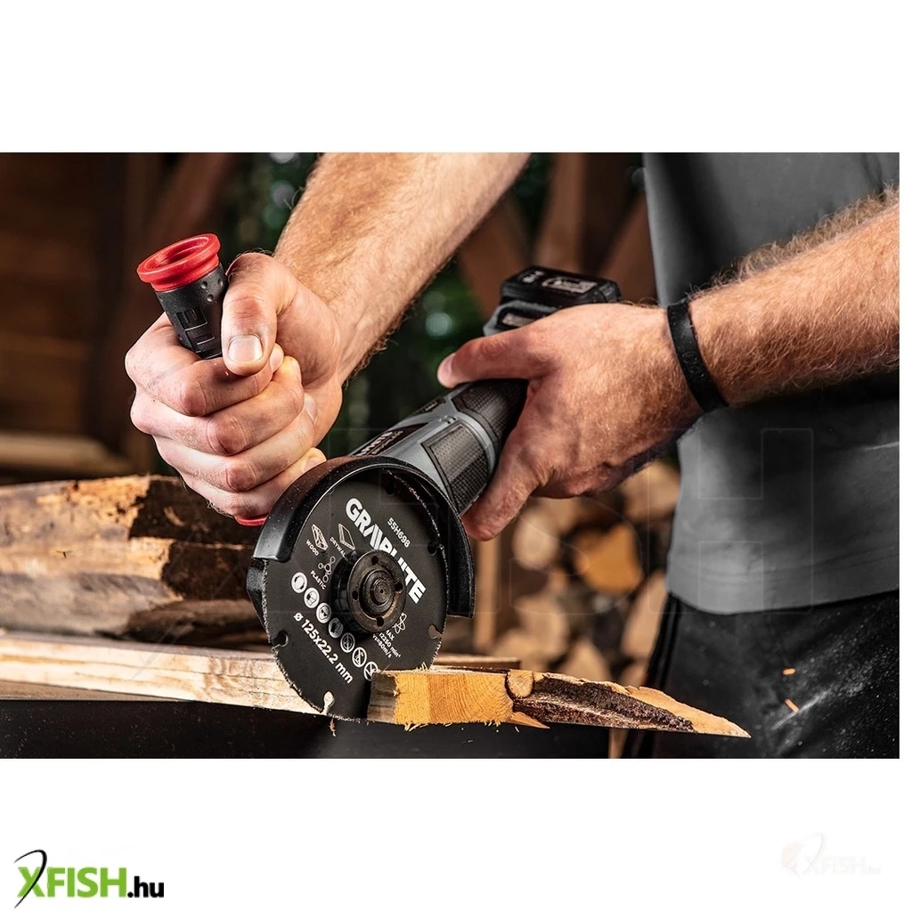 A GRAPHITE sarokcsiszolót 18V Li-Ion GRAPHITE Energy+ akkumulátorok táplálják. 115 mm átmérőjű korongok használhatók, elérhető fordulatszám: 10000 ford/perc. A sarokcsiszoló kapcsolójának nyomógombja két elemű, továbbá el van látva továbbá az orsót reteszelő nyomógombbal, ami védi a felhasználót a reteszelés véletlen bekapcsolása ellen munka közben. Az elektromos készülék konstrukciója kiemelkedően ergonomikus - az elkeskenyedő fogórészt csúszásmentes műanyag borítja, ennek köszönhetően biztosan tartható a kézben. A lapos áttételháznak köszönhetően a csiszoló nehezen hozzáférhető helyeken is használható.