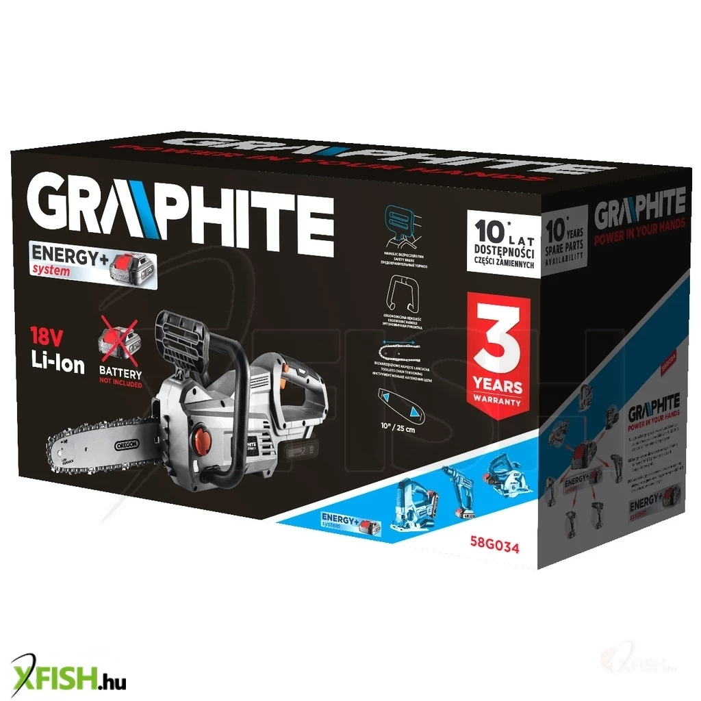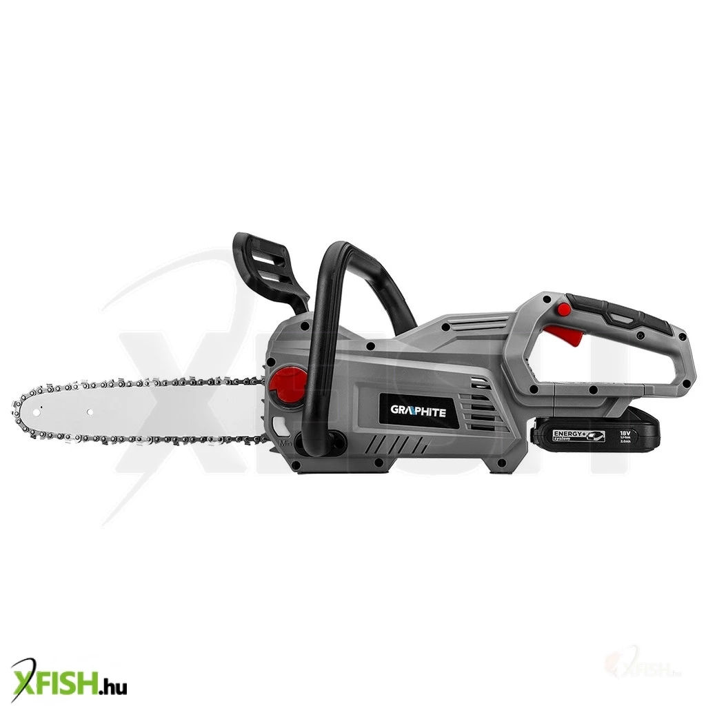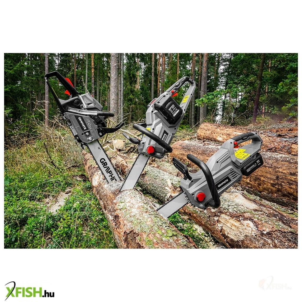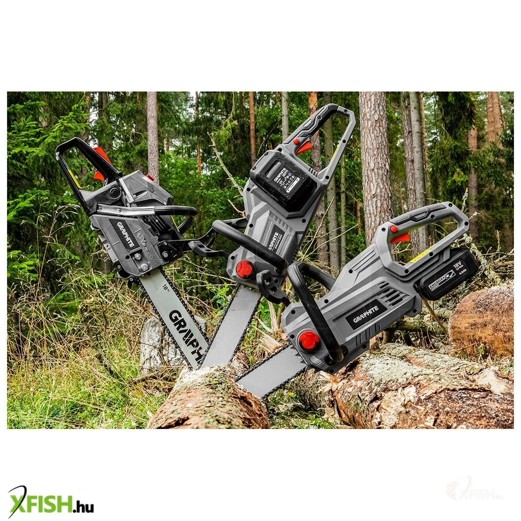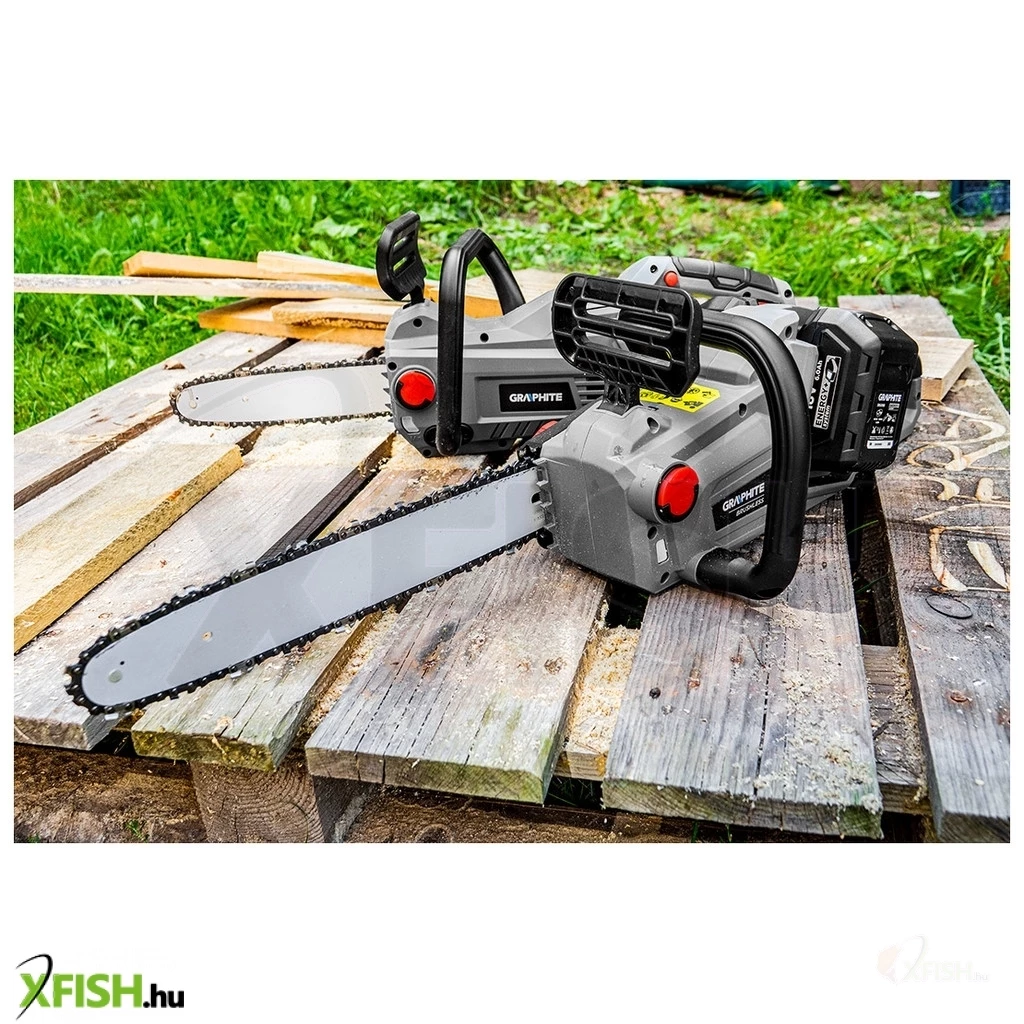 Akkus láncfűrész, 58G034, GRAPHITE - kiváló minőségű szerszám, amely két 18 V-os akkumulátorral működik. A fűrészt tűzifa és faágak vágására tervezték. A berendezést automatikus olajadagoló szerkezettel szerelték fel, amely minimalizálja a fűrész nem megfelelő használatából eredő meghibásodás kockázatát. A kényelmet és biztonságot szem előtt tartva a terméket szerszám nélküli láncfeszítő rendszerrel, kényelmes fogantyúval és a kezek védelmét szolgáló külső pajzzsal látták el.