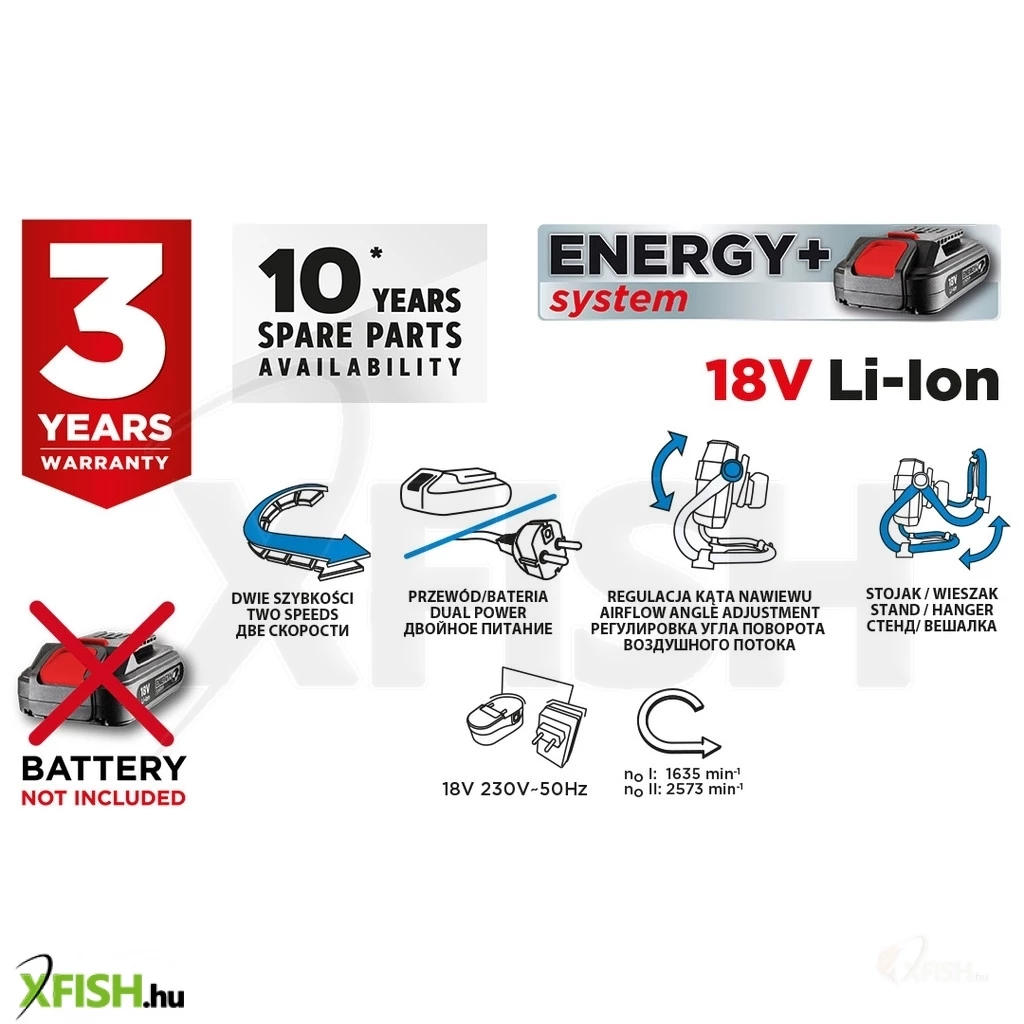 Energia + 18 V, Li-lon ventilátor kettős biztosítással, akkumulátorral vagy hálózati feszültséggel, két sebességfokozat: I 0-2573 rpm, II 1635 rpm, beépített kapcsoló, súlya 2,3 kg, kompatibilis az Energy + akkumulátorokkal. A készülék függőleges vagy függő helyzetben működtethető, a légáramlási szög kézikönyve mellett.