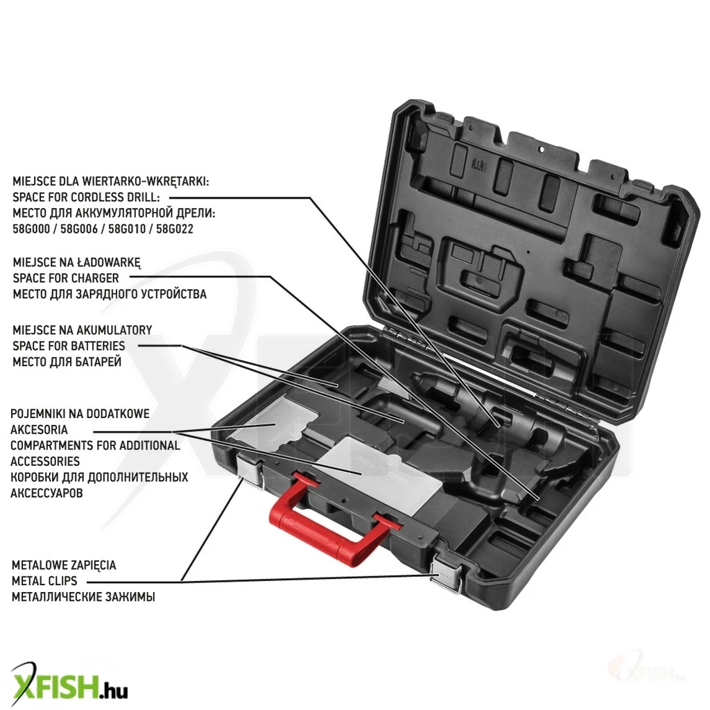 Tok Energy + fúrókhoz, fúrókhoz: 58G000 / 58G006 / 58G010 / 58G022, hely egy töltőhöz, hely két Energy + akkumulátorhoz, két tartály további kiegészítőkhöz, fém rögzítők, méretek: 34 x 45 x 12,3 cm