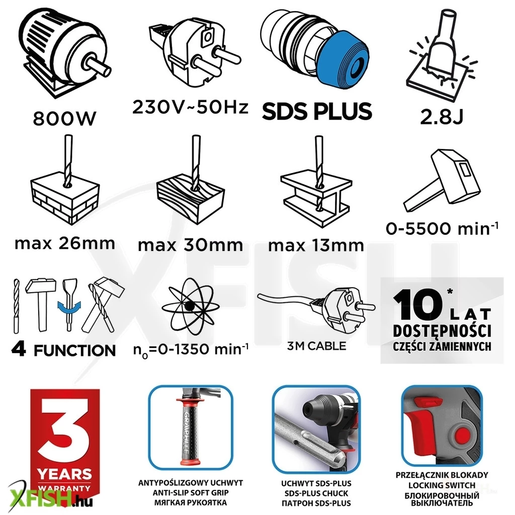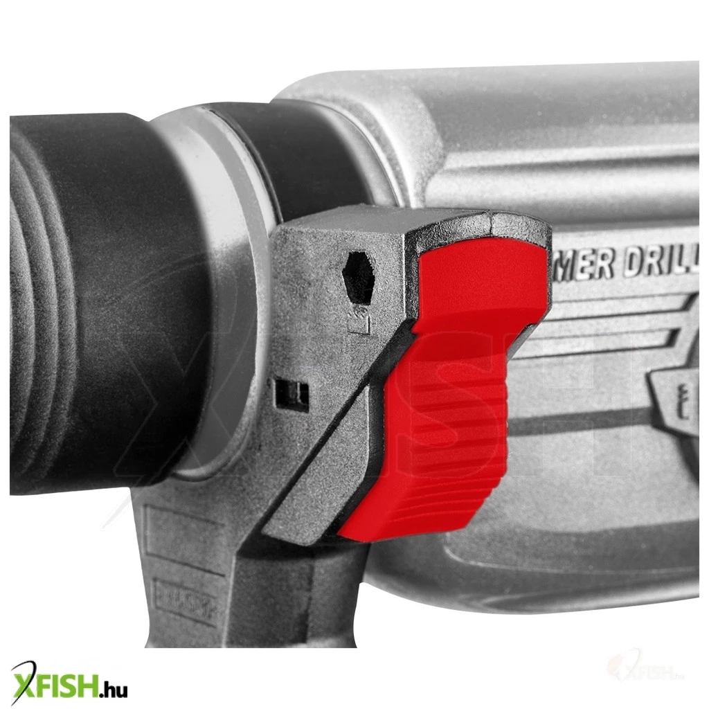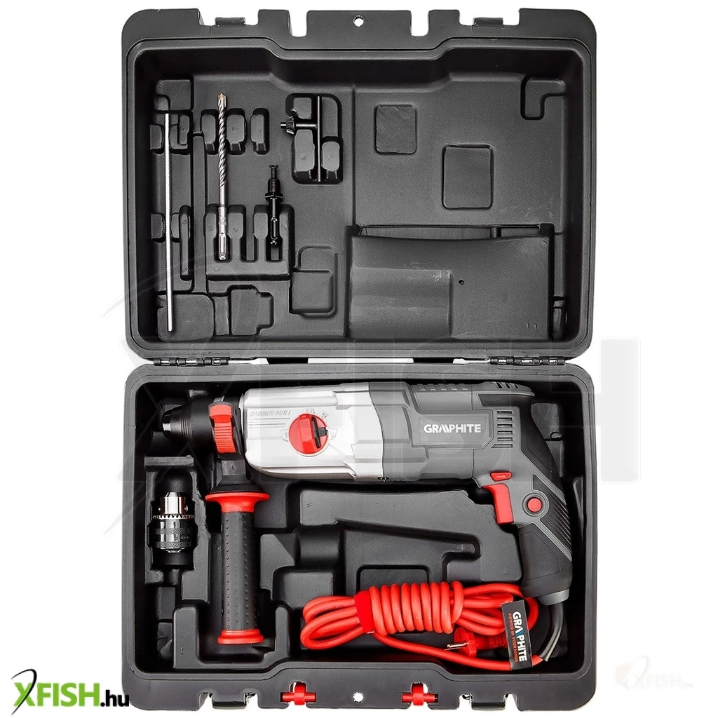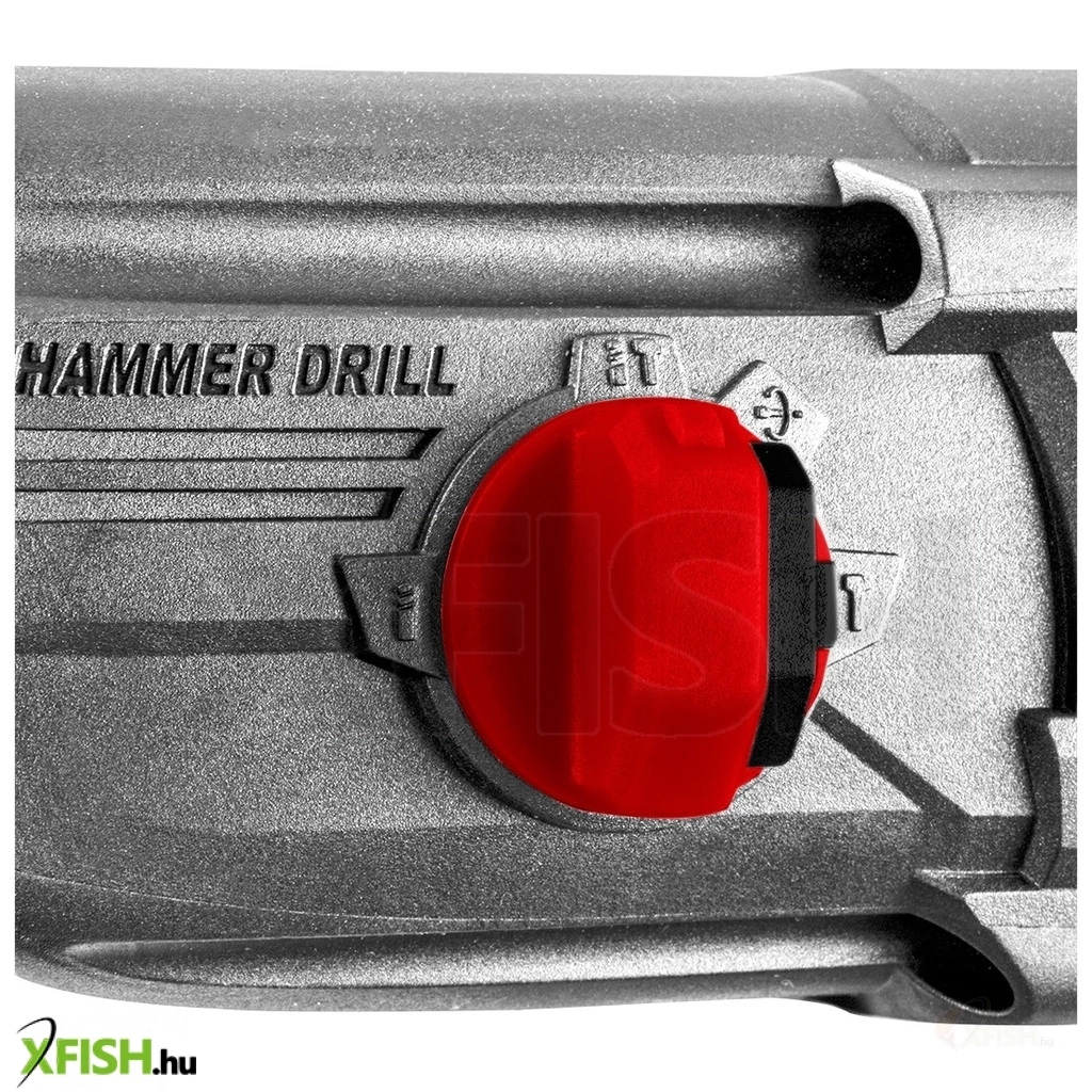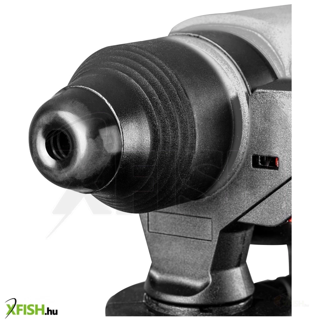 Fúrókalapács SDS+ 800 W, fordulatszám 0-1350 percOO, ütés 0-5500 percOO, jobb/bal, ütési energia 2,8 J, négyfunkciós (fúrás, ütvefúrás, vésés, a véső bármely helyzetbe állítható), fúrási O beton/acél/fa 26/13/30 mm, csatlakozókábel 3 m, indítókapcsoló reteszelés a folyamatos üzemhez, nyomáshatároló tengelykapcsoló, gumírozott főmarkolat, méretek (HxM) 390x230 mm, tömeg 3,3 kg, tartozékok: 1 db fúrószár, fúrásmélység-határoló, elforgatható pótmarkolat, tokmány, tokmányadapter, hordtáska
