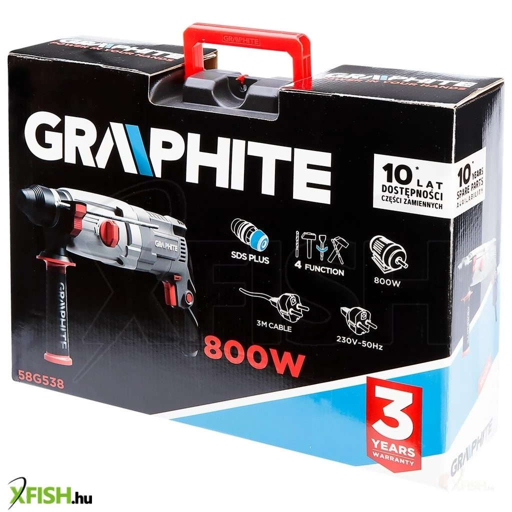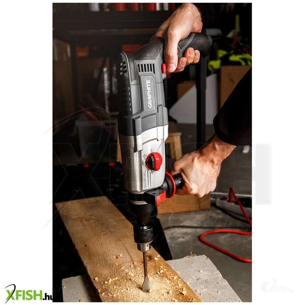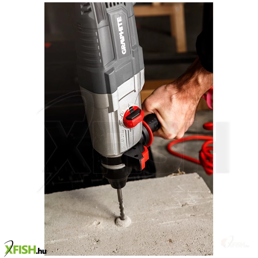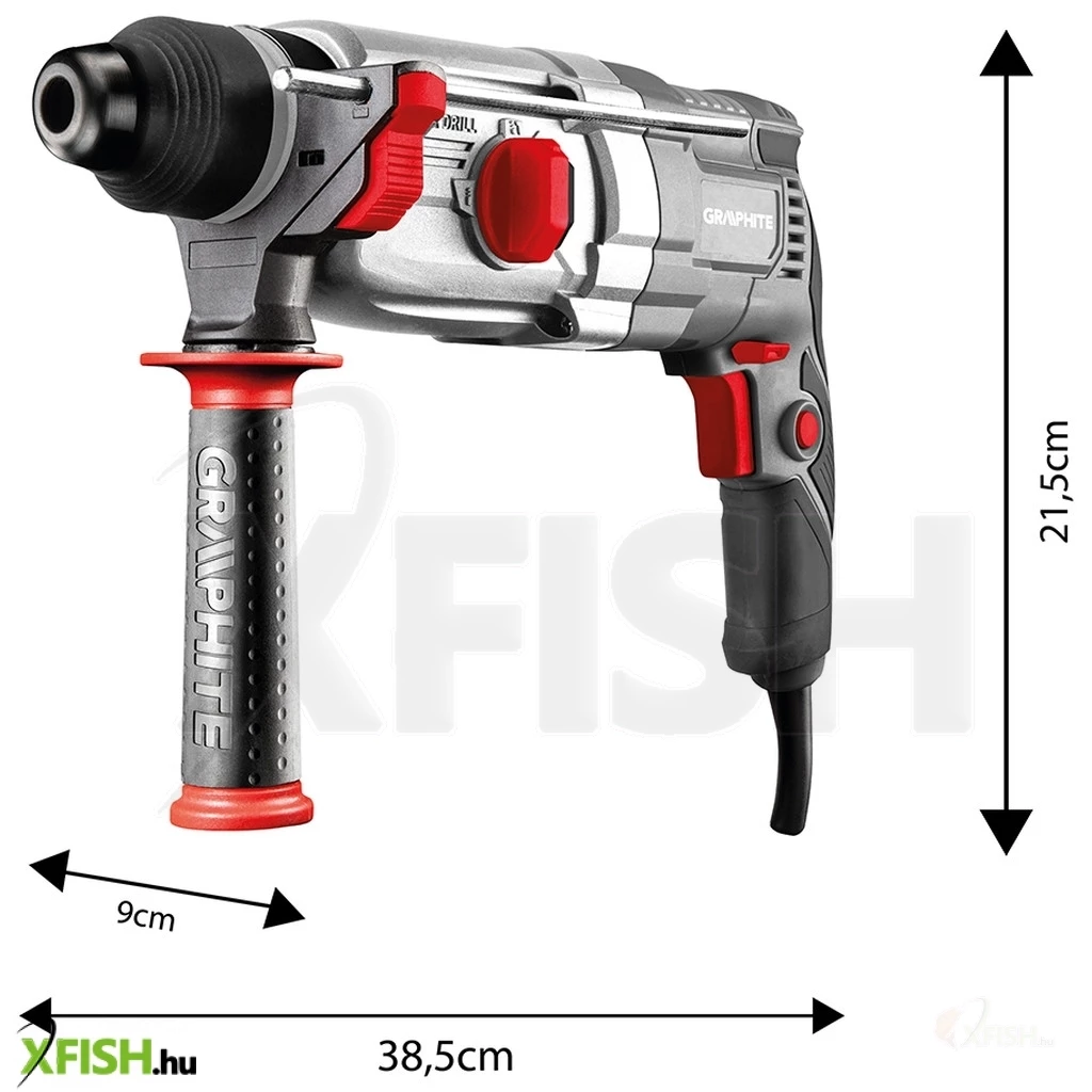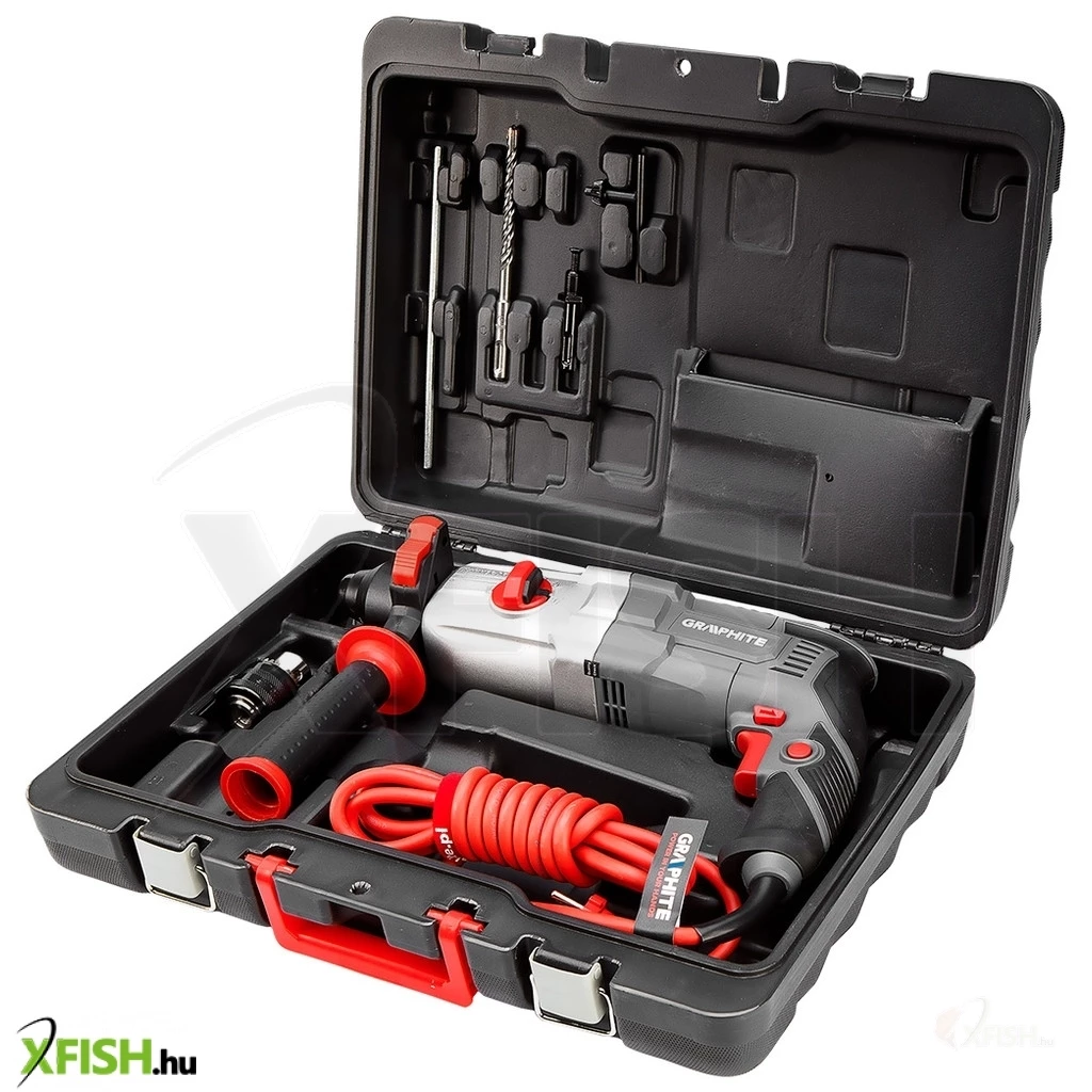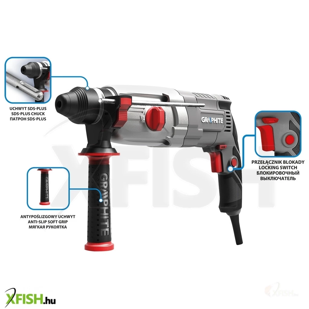 Fúrókalapács SDS+ 800 W, fordulatszám 0-1350 percOO, ütés 0-5500 percOO, jobb/bal, ütési energia 2,8 J, négyfunkciós (fúrás, ütvefúrás, vésés, a véső bármely helyzetbe állítható), fúrási O beton/acél/fa 26/13/30 mm, csatlakozókábel 3 m, indítókapcsoló reteszelés a folyamatos üzemhez, nyomáshatároló tengelykapcsoló, gumírozott főmarkolat, méretek (HxM) 390x230 mm, tömeg 3,3 kg, tartozékok: 1 db fúrószár, fúrásmélység-határoló, elforgatható pótmarkolat, tokmány, tokmányadapter, hordtáska