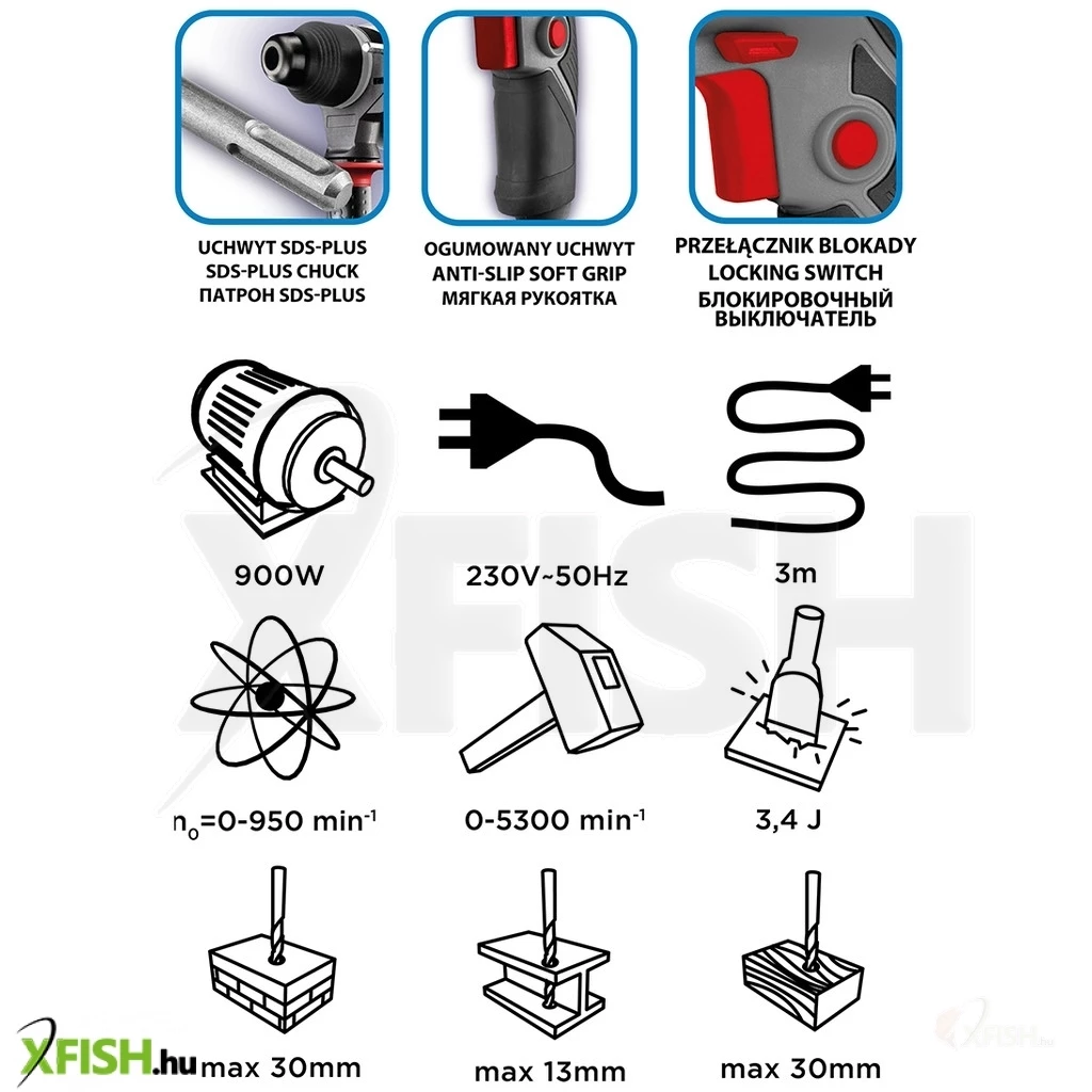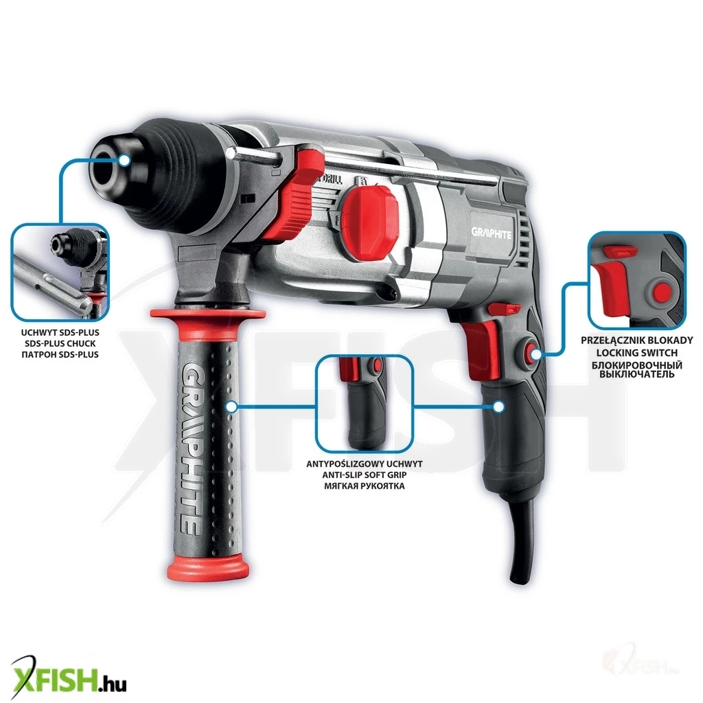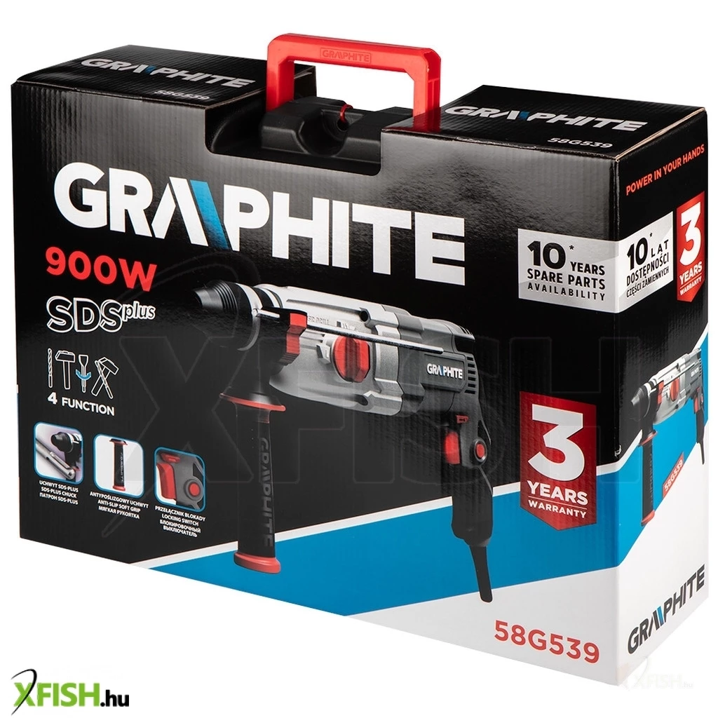 Az SDS+ 900 W, 3,4J, tok 58G539 kalapácsfúró a GRAPHITE-tól egy 900 W-os speciális SDS+ szerszám fúró és ütő funkcióval. Akár 28 mm átmérőjű lyukakat is fúrhat betonba és téglába, 13 mm átmérőjűeket acélba és 30 mm átmérőjűeket fába. A szerszám rendelkezik orsófordítóval, fokozatmentes fordulatszám-szabályozással és be-/kikapcsoló reteszeléssel a folyamatos működéshez. Fúrás közben a fúrókalapács akár 950 fordulat/perc fordulatszámot is elérhet, ütőfúrásra kapcsolva pedig akár 5300 löket/perc (az ütőfúró funkció akkor aktiválódik, amikor a fúrófejet a fúrt felülethez nyomják). A szerszám ütési energiája 3,4 J. A kényelmes "kattintás" funkció a fúrófej gyors rögzítésére szolgál. A szerszám kényelmes fő fogantyúja csúszásmentes markolattal borított, így jól fekszik a kézben. A készlet a következőket tartalmazza: további fúrófejek, fúrótokmány, tokmányadapter, fúrási mélységmegállító rúd, forgatható segédfogantyú, kenőanyagtartály és hordtáska. A készülék rugalmas és tartós, 3 m hosszú, gumibevonatú tápkábellel van ellátva, amely szintén professzionális és ipari alkalmazásokhoz készült, beltéri és kültéri használatra egyaránt. Az európai szabványoknak való megfelelést a CE tanúsítás biztosítja.
