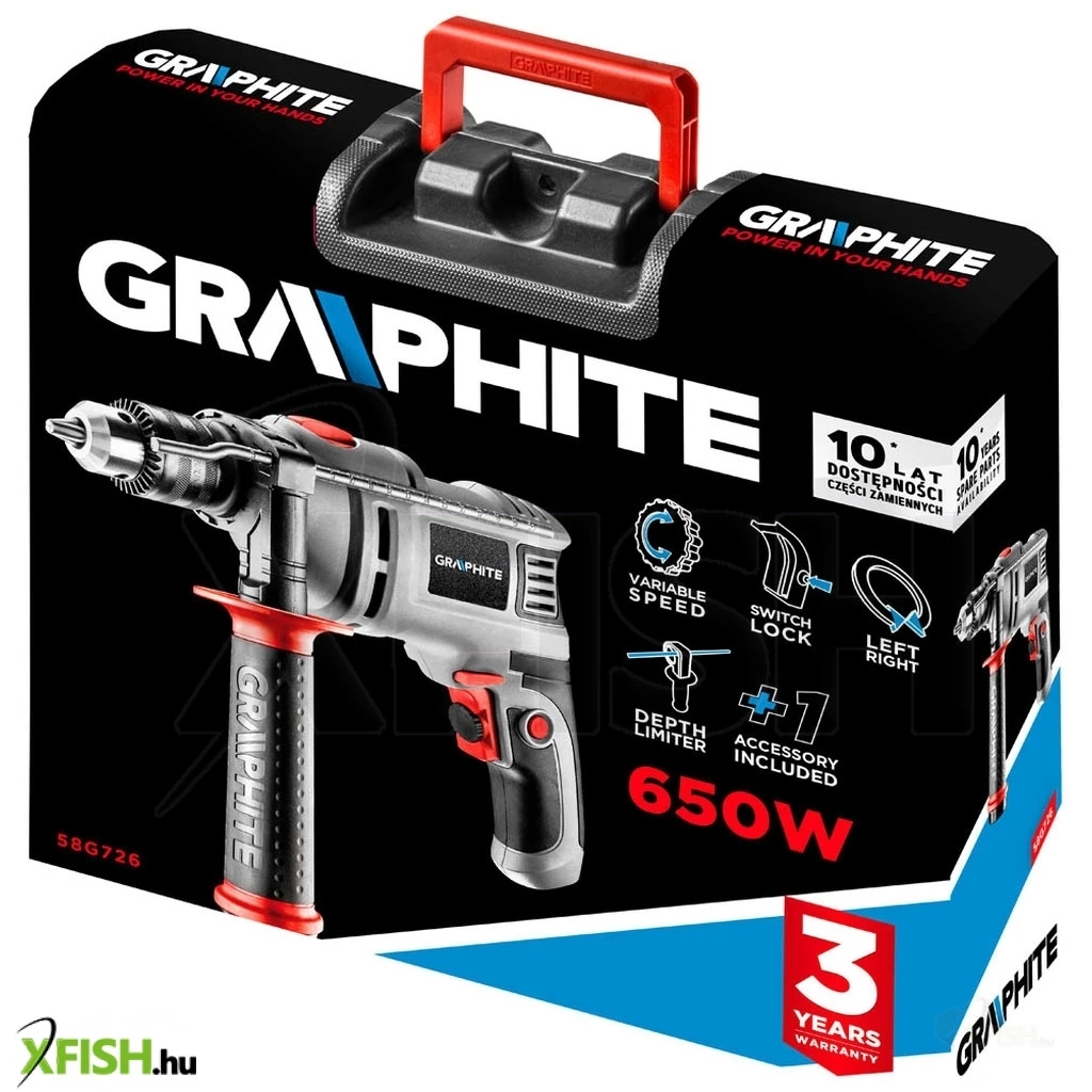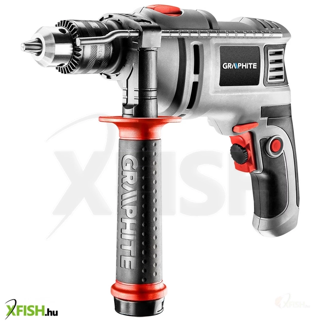 Ütvefúró 650 W, 13 mm-es kulcsos tokmány, fordulatszá 0-3 000 minOO, ütés 0-48 000 minOO, jobb/bal, max. fúrási O fa/beton/acél 28/13/10, orsómenet 1/2" x 20 mm, méretek: (HxSz) 295 x 210 mm, max. sebesség határoló, gumírozott főmarkolat, tömeg 2 kg, tartozékok: pótmarkolat fúrószártartóval, fúrásmélység határoló, 1 db fúrószár, hordtáska