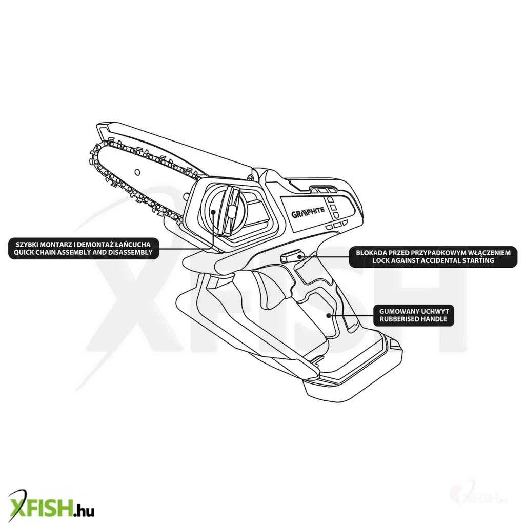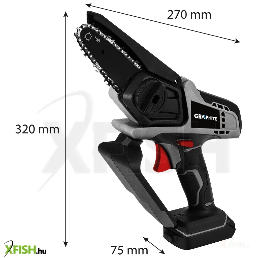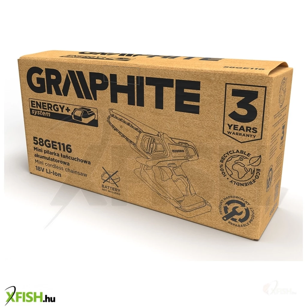 AzEnergy+ 18 voltos 58GE116 GRAPHITE mini akkumulátoros láncfűrészt a GRAPHITE márka legkorszerűbb rendszere hajtja, amely nagy teljesítményű Energy+ akkumulátorokon alapul. A láncfűrész 18 V-os lítium-ion akkumulátorral kompatibilis. A szerszámot a kertben való használatra tervezték, ágak kivágására vagy metszésére, szoros helyen. A mini láncfűrész lineáris láncsebessége (terhelés nélkül) 0 ÷ 4,6 m/s.