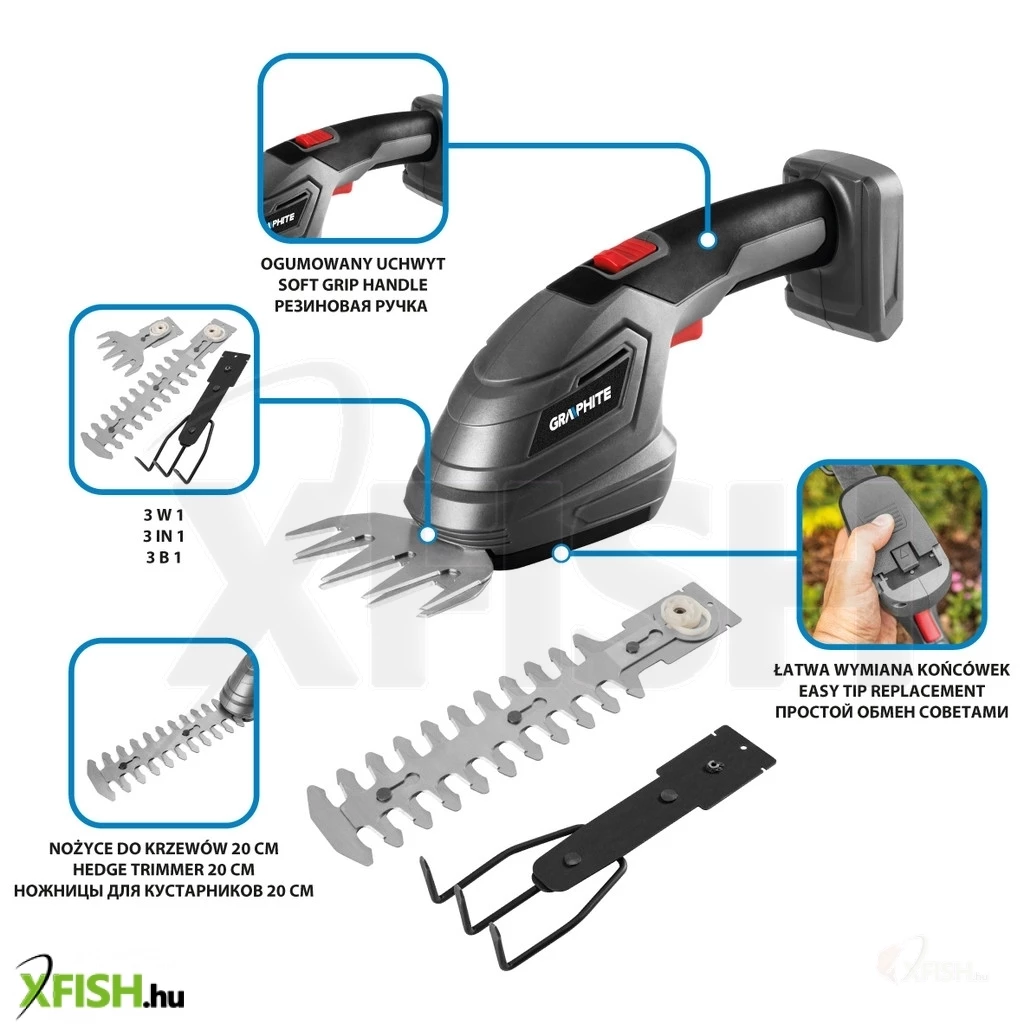 A három hegyből álló készülék ideális a fák, bokrok, sövények és gyepek precíz metszéséhez. 3/8"-os nyéllel rendelkezik, 3/8"-os rögzítéssel és vágási szélességgel: