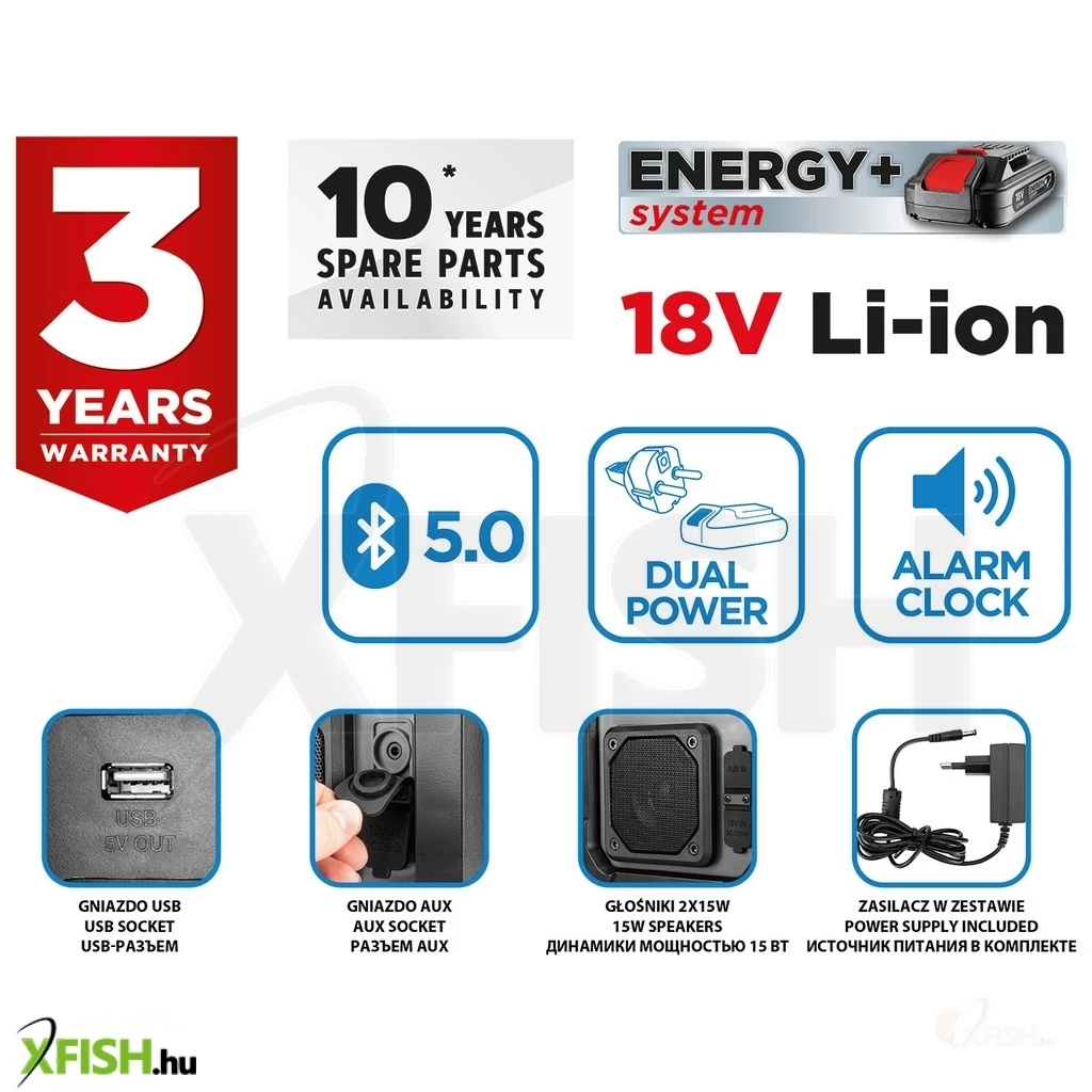 Az Energy + 18 voltos akkumulátoros építőipari rádió 58GE128 GRAPHITE egy rendkívül tartós készülék, amely élvezetesebbéteszi a munkát bármely építkezésen, műhelyben vagy üzletben. A készülék a modern Energy + akkumulátoros termékek rendszeréhez tartozik, amelyek tartós és hatékony 18 V-os lítium-ion akkumulátorokkal működnek. Ez a rádiós modell ráadásul kábellel van felszerelve, amely lehetővé teszi a hagyományos módon történő hálózati csatlakoztatást.