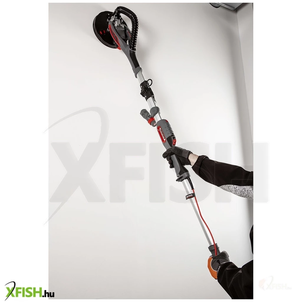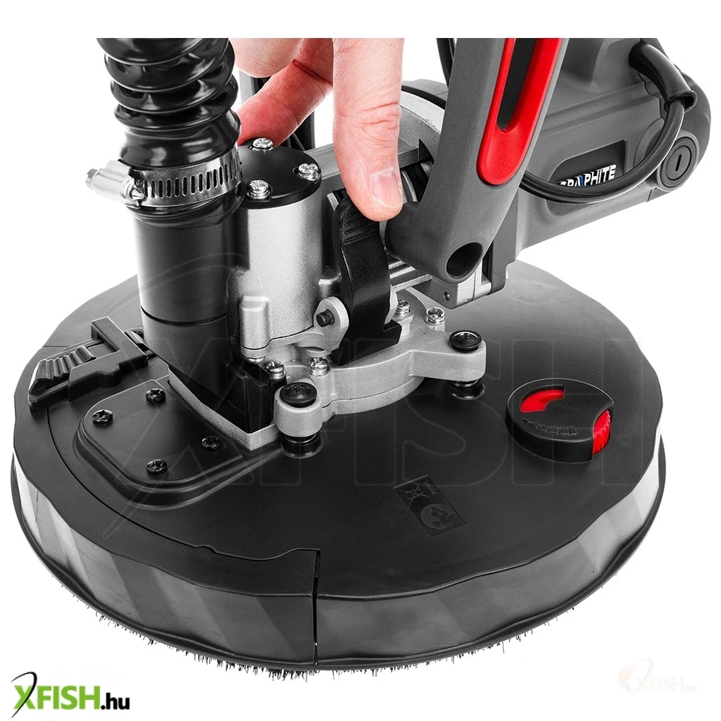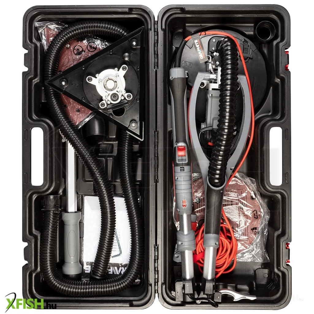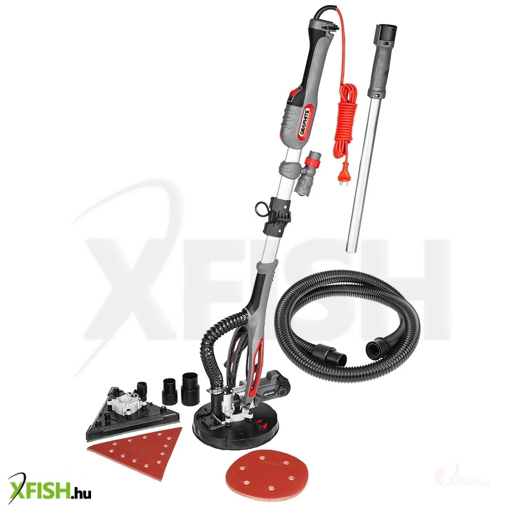 Gipszcsiszoló710 W, 215 mm, kerek és háromszögletes láb, fáklya 59G264 A GRAPHITE egy csúcskategóriás gipszcsiszológép, amely teleszkópos nyéllel és cserélhető lábakkal - kerek és háromszögletes - rendelkezik. A csiszológép 710 wattos teljesítményű, a fej fordulatszáma pedig fokozatmentesen állítható, 800 és 1700 fordulat/perc között. A csiszolókorong átmérője 215 mm.
