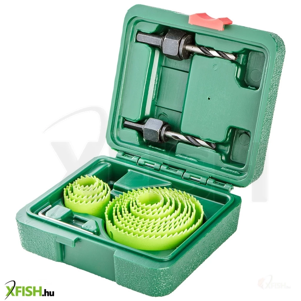 Körkivágó készlet, adapter 2 db., körkivágó 12 db.: 19, 22, 25, 29, 32, 35, 38, 44, 51, 57, 64, 76 mm, műanyag tartódoboz.