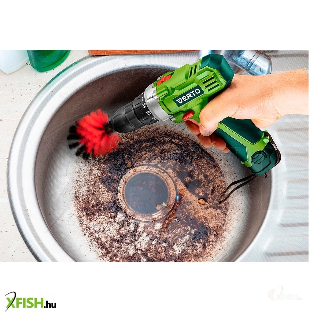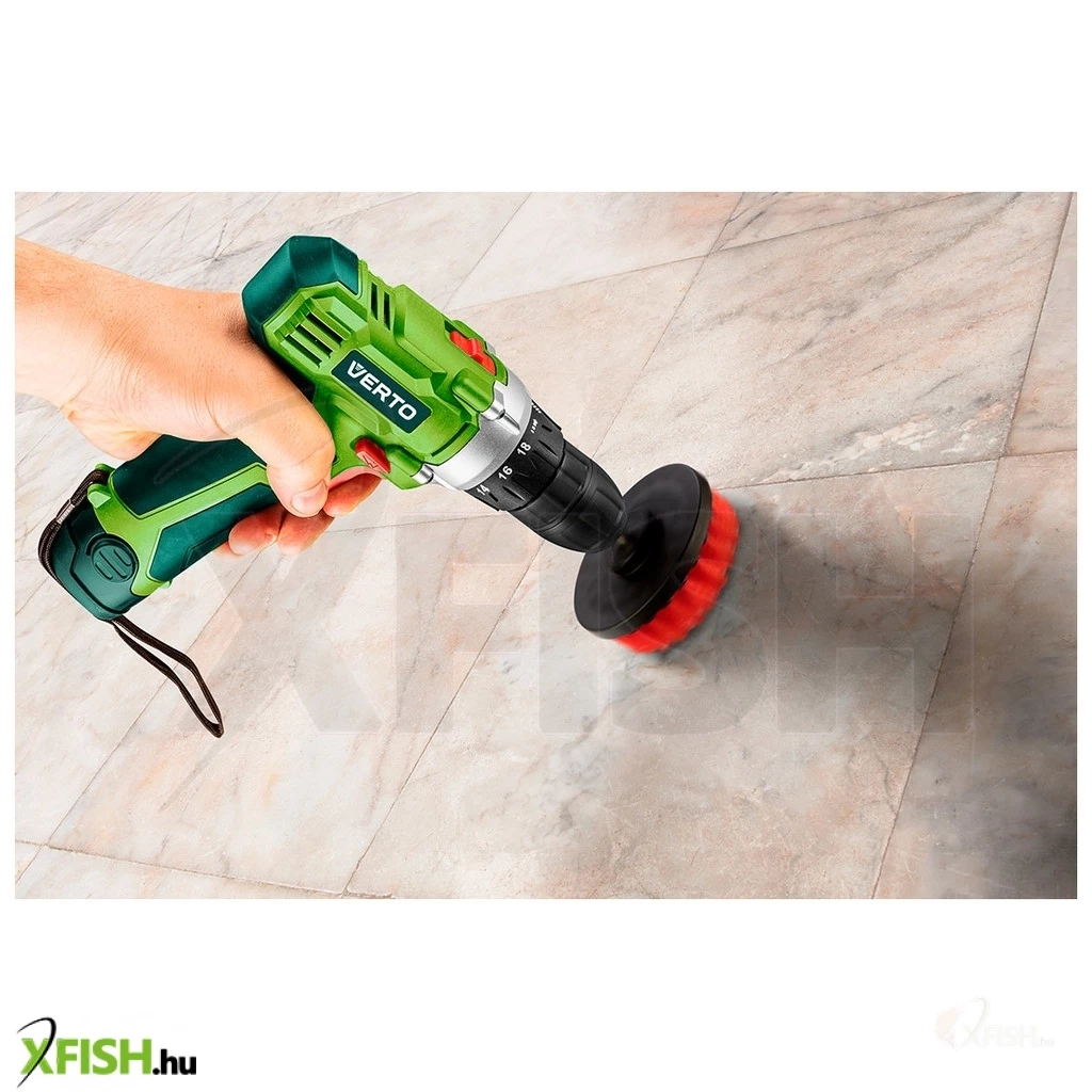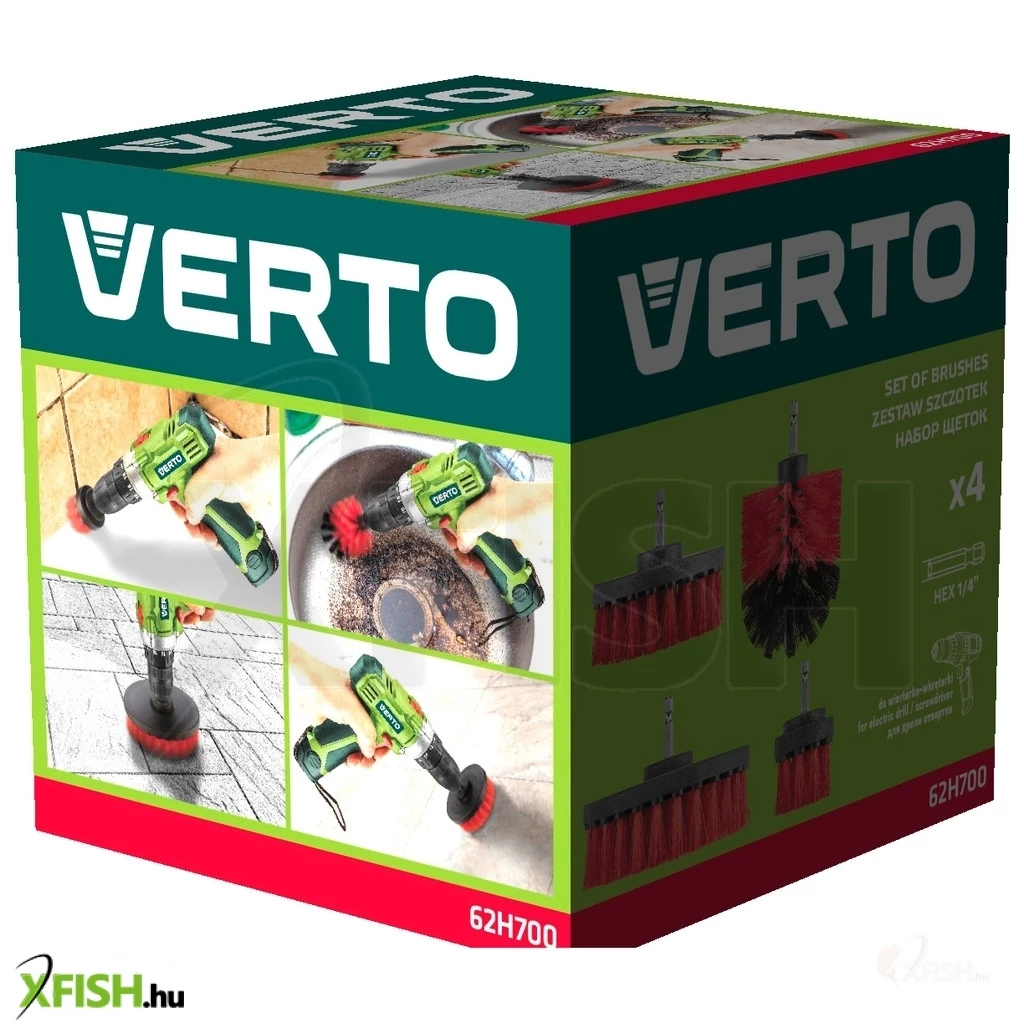 Fúrógéptisztító kefe, 4 db-os készlet, 62H700, VERTO - bármilyen fúrógéphez vagy csavarozóhoz használható. A készlet használható otthon, műhelyben, garázsban. A fejek különféle felületek tisztítására alkalmasak: cement, padló, csempe, fugák, linóleum, fürdőszoba szerelvények, mosogatók, tűzhelyek, munkalapok, szőnyegek, felnik, csomagtartók. A különböző fejformák lehetővé teszik különböző felületek és nehezen hozzáférhető helyek tisztítását is. Nedvesen és szárazon egyaránt használhatók