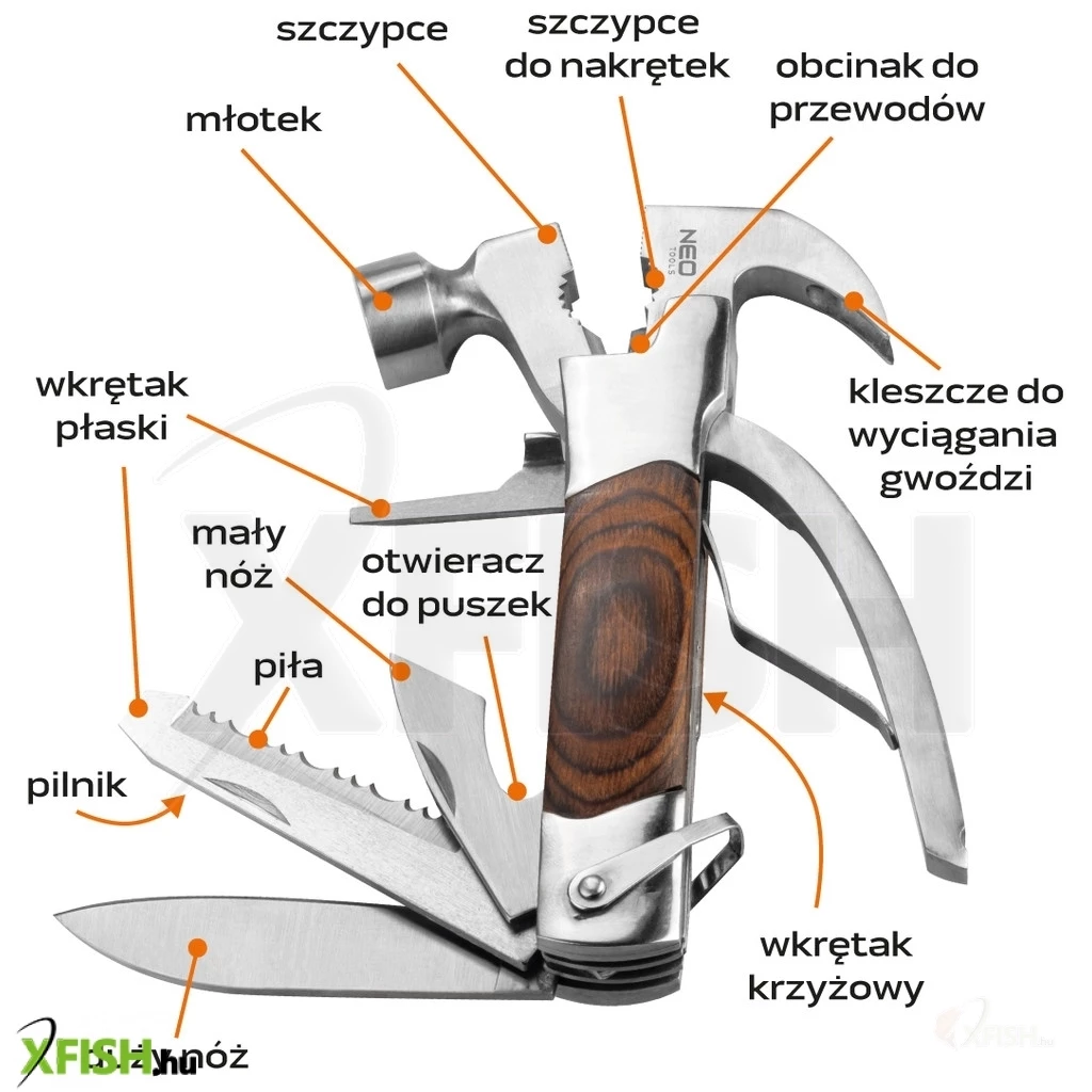 A minőségi rozsdamentes acélból készült Neotools multifunkciós szerszám hosszú élettartamot és megbízható teljesítményt biztosít. A 13 különböző funkció közé tartozik többek között a fogó, a kés, a csavarhúzó különféle méretei, sörnyitó, és még sok más praktikus eszköz, amelyek megkönnyítik a horgászélményedet, legyen szó csali előkészítéséről vagy apróbb javításokról.