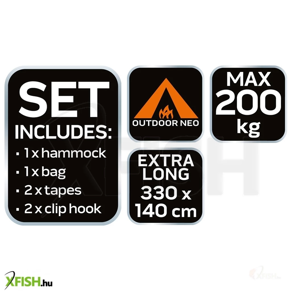 - Készlet tartalma: függőágy, szúnyogháló, 2 db függőágytartó heveder, 2 db zsinór, 2 db karabiner, hordtáska