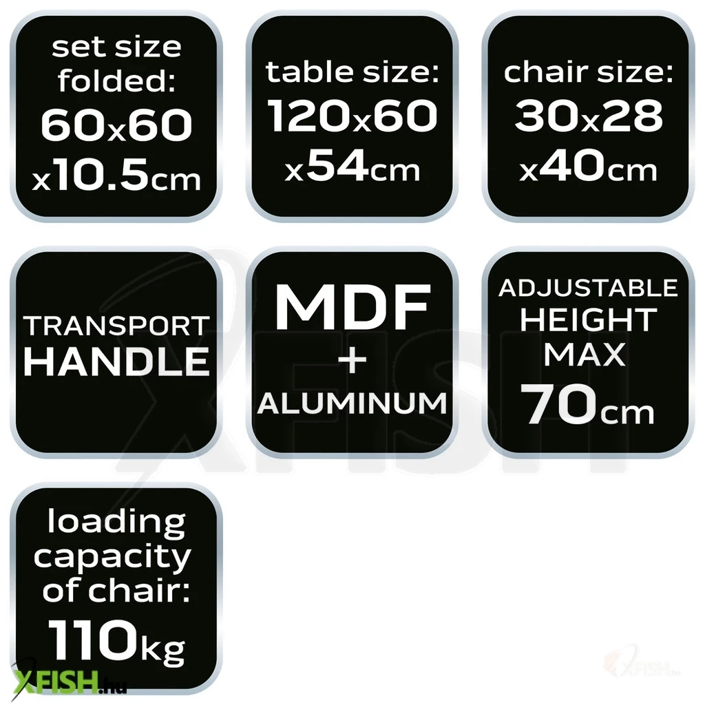 Az összecsukható székek kiválóan illeszkednek az asztalhoz, mindössze 33 cm hosszúak és 27 cm szélesek, magasságuk pedig 35 cm. Ez a szett tökéletesen megtervezett, kompakt szállítási mérettel: 60 x 60 x 10,5 cm, így a mellékelt tokban könnyedén tárolható és szállítható. Az egész készlet összesen 6,9 kg, ami különösen könnyűnek számít, de nem áldozza fel a stabilitást és a tartósságot.